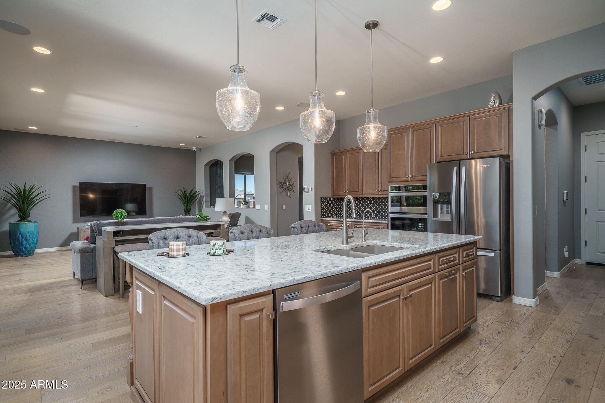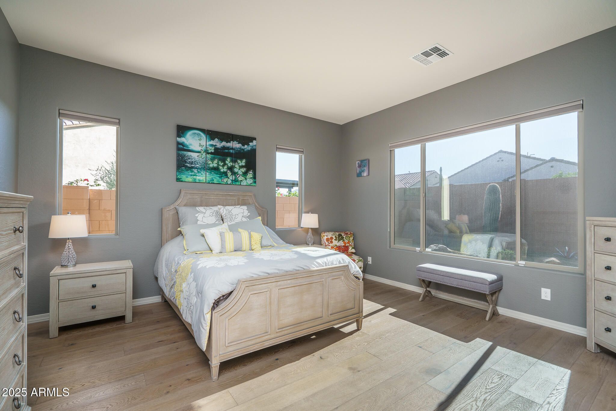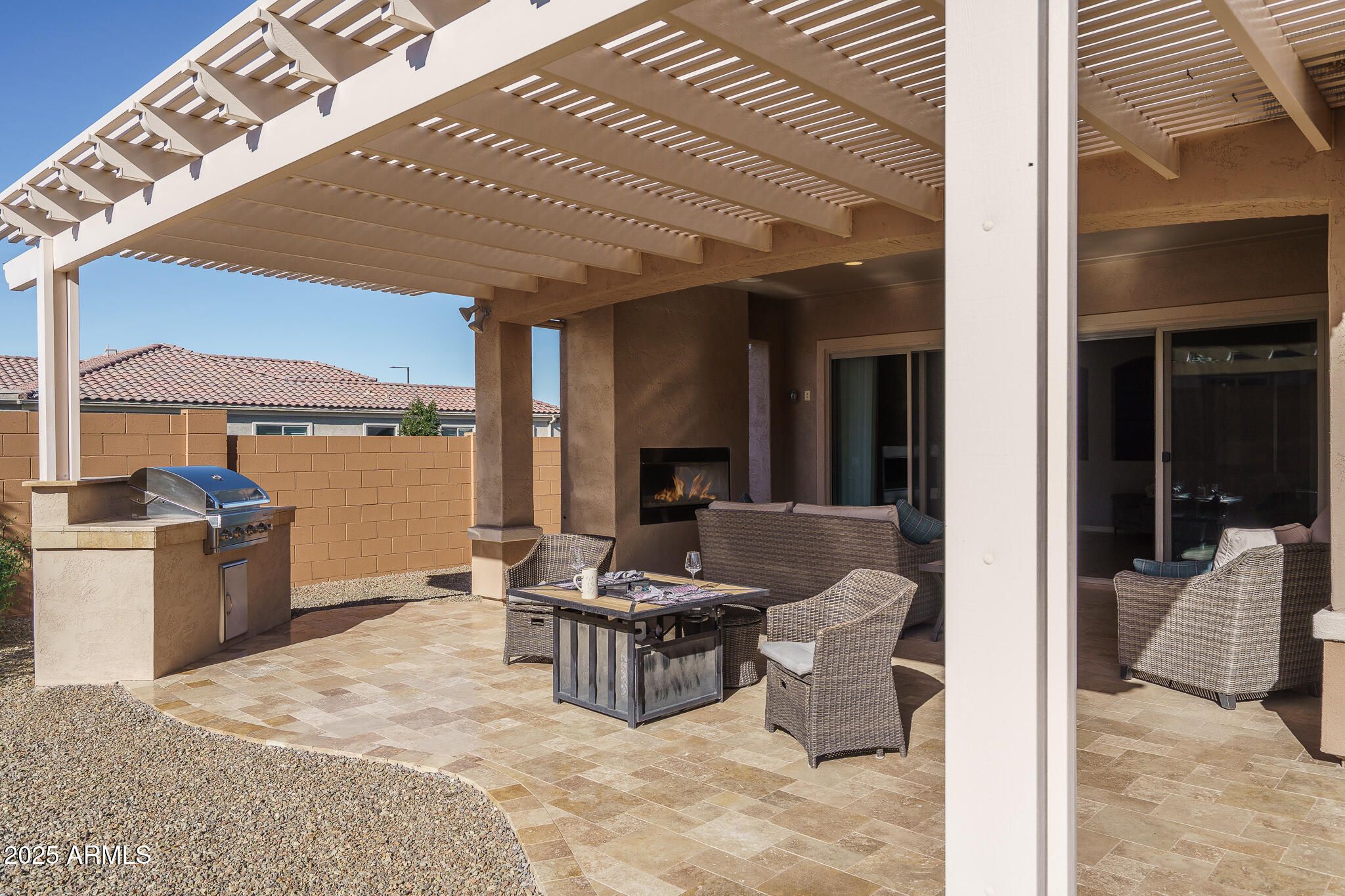 Gorgeous Serenity model on a premium corner lot with north/south exposure offers 2 bedrooms + office & den/flex room & 2 baths in 2442 SqFt with an open great room layout & split bedrooms. Engineered wood flooring throughout the home. The kitchen has upgraded maple cabinetry, quartz counters, designer tile backsplash, stainless steel gas cooktop appliances, oversized walk-in pantry, and EXECUTIVE quartz island with breakfast bar & pendant lighting. Center sliding glass doors lead out to the covered patio with travertine floor, a gas fireplace and a built-in BBQ island. Easy care desert landscaping leaves you more time to enjoy resort-style community amenities! Primary retreat includes a spacious bath with double sinks, tiled spa shower with rain showerhead & bench seating and a walk-in closet. Bedroom 2 includes a built-in Murphy Bed. Oversized 2.5 car garage PLUS a golf cart garage.