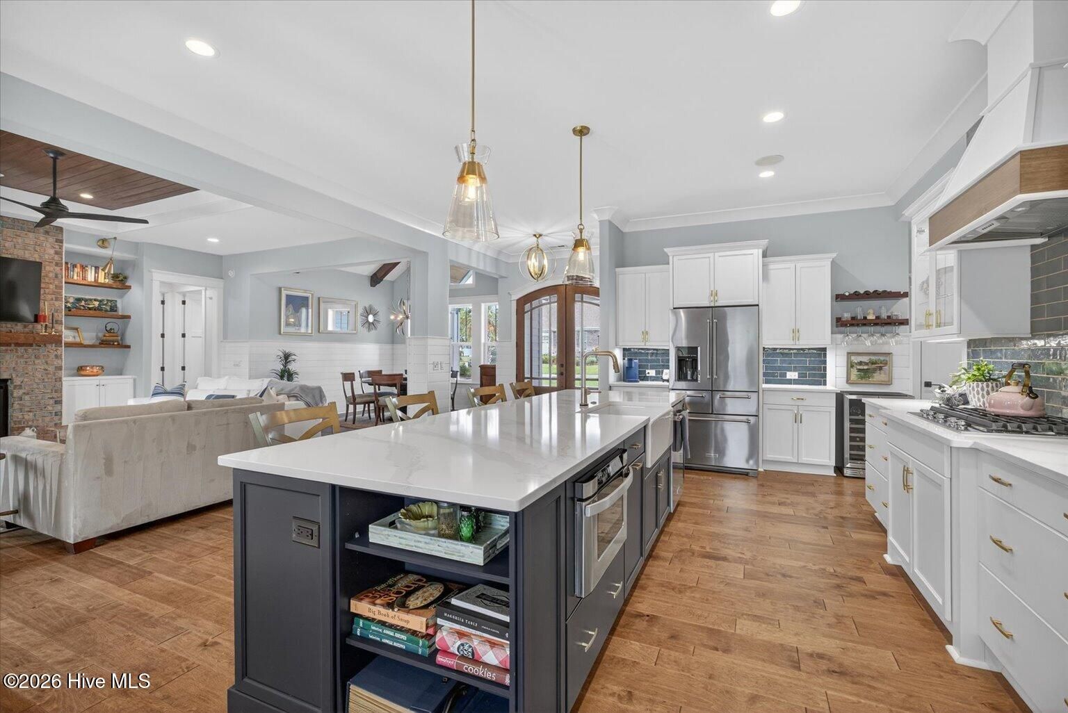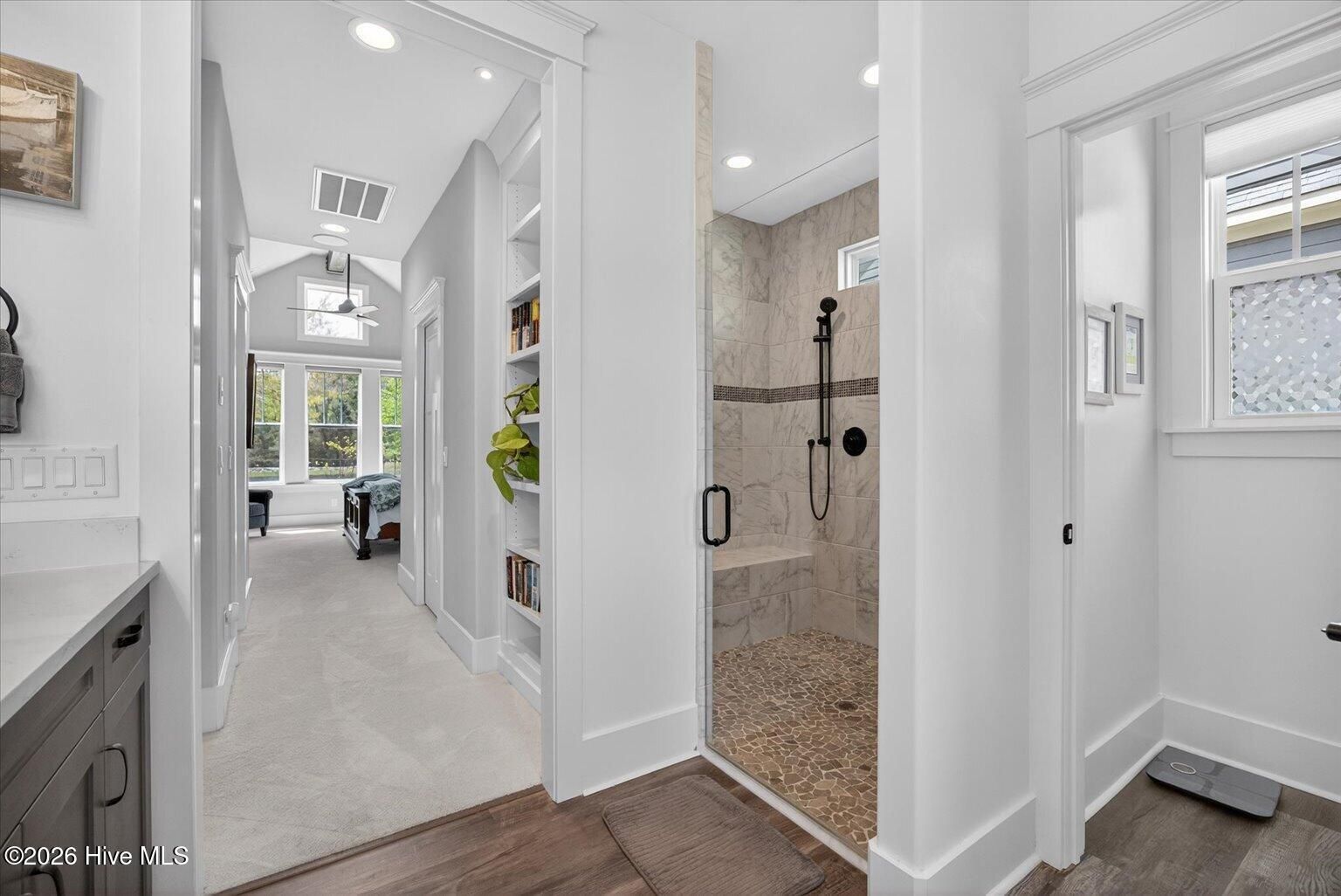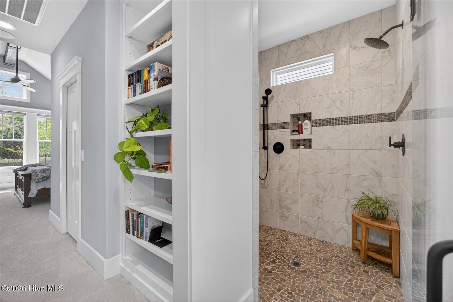 - Master Downstairs, Walk-in Closet(s), High Ceilings, Entrance Foyer, Mud Room, Bookcases, Kitchen Island, Ceiling Fan(s), Walk-in Shower