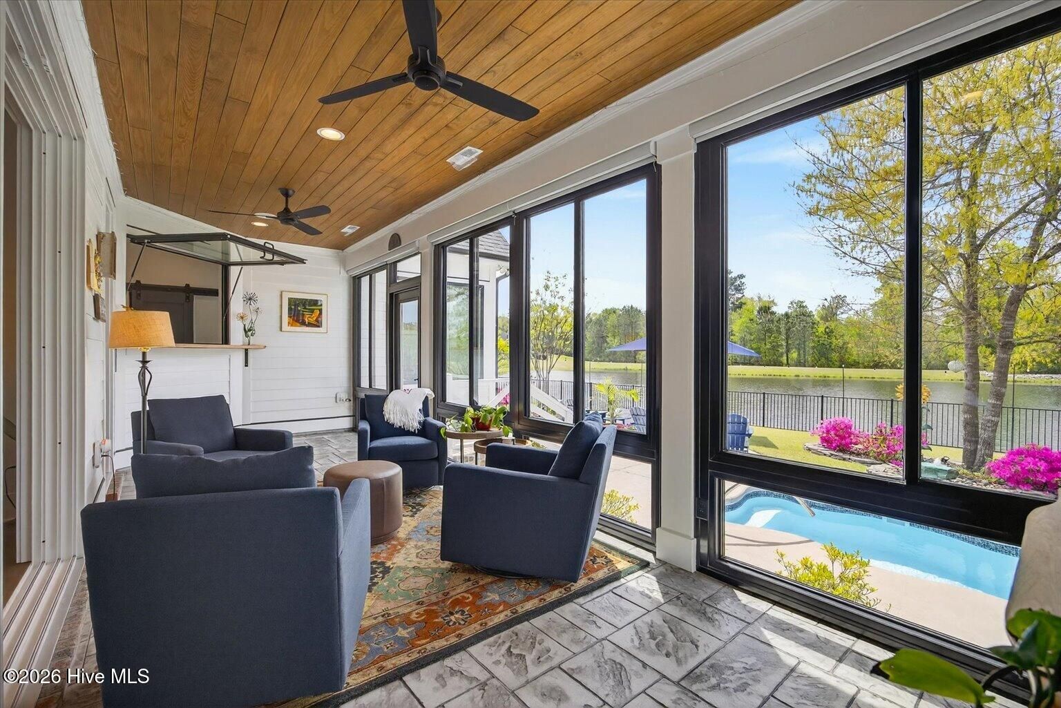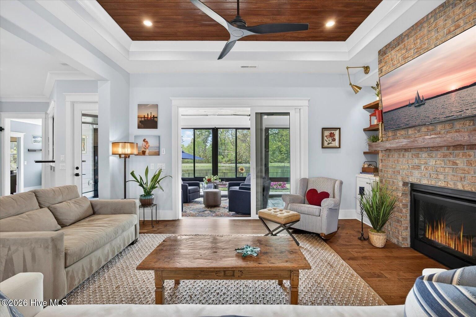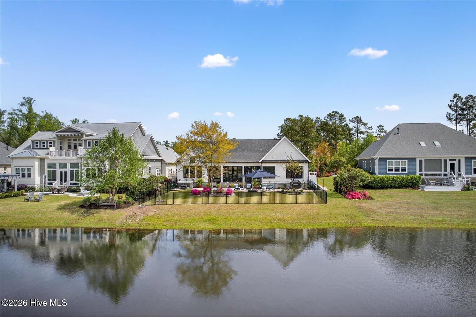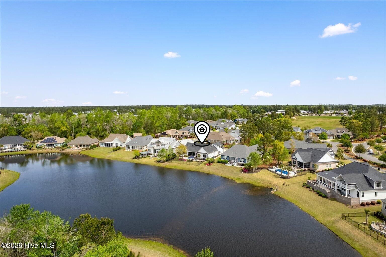 Welcome to ultimate Luxury Living in Compass Pointe Stunning 2022 Liberty Homes Duval offering expansive waterfront views across the entire rear of the home in the amenity-rich gated community of Compass Pointe. Perfectly positioned on a private, fenced homesite in the exclusive West Lake neighborhood. This exceptional property showcases beautiful curb appeal with meticulously landscaped grounds and custom fieldstone edging. Outdoor living is unmatched--enjoy a private waterfront oasis with magnificent sunsets, a cocktail-style pool, separate hot tub, enclosed outdoor shower, fountain, and extensive landscape lighting, all designed for relaxation and entertaining. Inside, the open-concept floor plan features hardwood flooring, tongue-and-groove ceilings, and a dramatic floor-to-ceiling brick fireplace. The chef's kitchen is the centerpiece, highlighted by a 10-foot quartz island, farmhouse sink, 5-burner gas cooktop, double wall ovens, custom range hood, lighted cabinetry, and a pass-through window with butcher block. A fully enclosed, glassed-in lanai with dedicated HVAC and remote shades extends the living space year-round while capturing breathtaking water views and sunsets. The primary suite offers sweeping lake views, custom built-ins, and a spa-like bath with upgraded finishes and a towel warmer. Additional features include two guest bedrooms, office, sitting/exercise room with picture window, bonus room with full bath, golf cart garage, generator rough-in, and 500-gallon propane tank. Move-in ready and designed for luxury waterfront living.