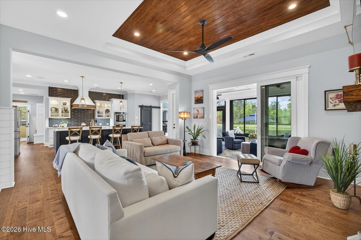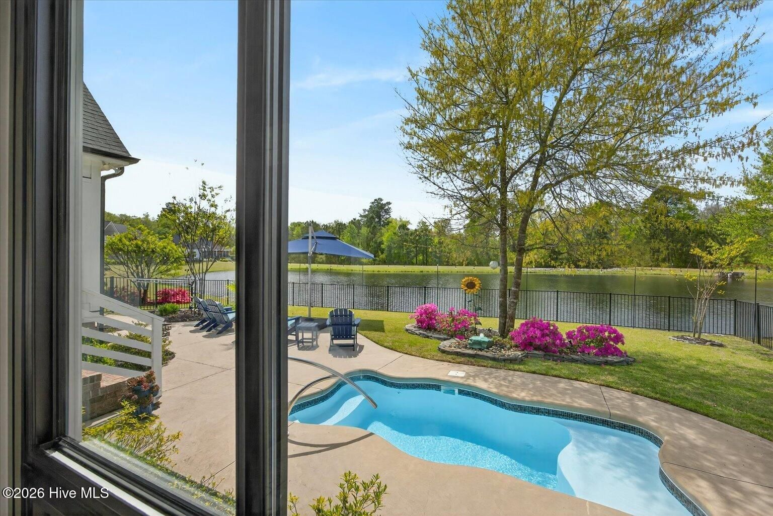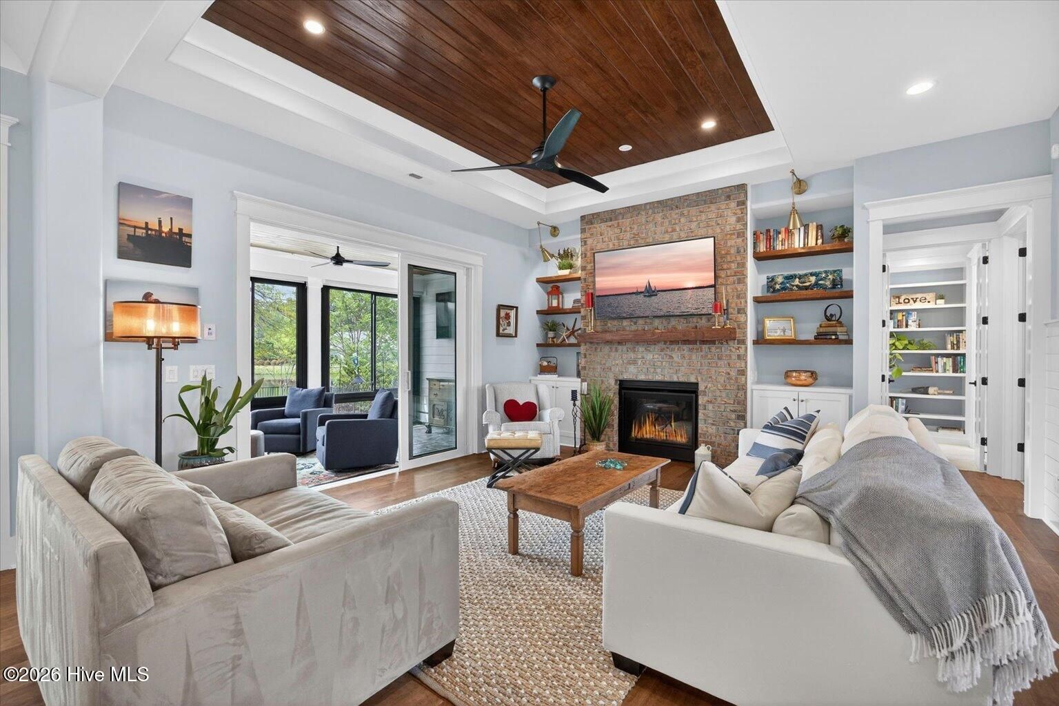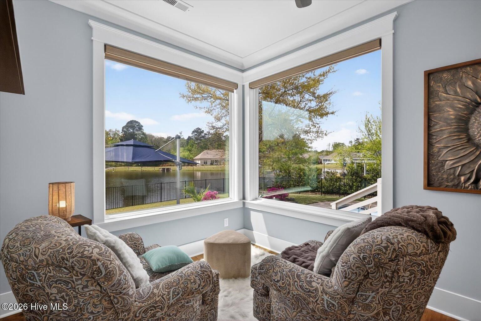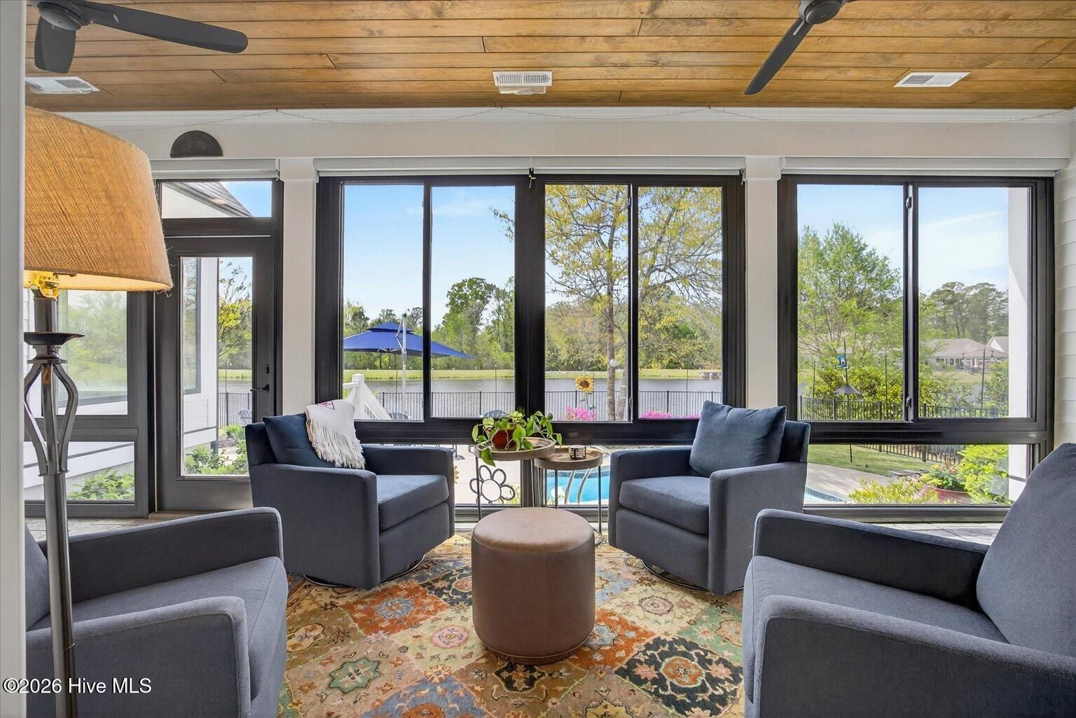 Welcome to ultimate Luxury Living in Compass Pointe Stunning 2022 Liberty Homes Duval offering expansive waterfront views across the entire rear of the home in the amenity-rich gated community of Compass Pointe. Perfectly positioned on a private, fenced homesite in the exclusive West Lake neighborhood. This exceptional property showcases beautiful curb appeal with meticulously landscaped grounds and custom fieldstone edging. Outdoor living is unmatched--enjoy a private waterfront oasis with magnificent sunsets, a cocktail-style pool, separate hot tub, enclosed outdoor shower, fountain, and extensive landscape lighting, all designed for relaxation and entertaining. Inside, the open-concept floor plan features hardwood flooring, tongue-and-groove ceilings, and a dramatic floor-to-ceiling brick fireplace. The chef's kitchen is the centerpiece, highlighted by a 10-foot quartz island, farmhouse sink, 5-burner gas cooktop, double wall ovens, custom range hood, lighted cabinetry, and a pass-through window with butcher block. A fully enclosed, glassed-in lanai with dedicated HVAC and remote shades extends the living space year-round while capturing breathtaking water views and sunsets. The primary suite offers sweeping lake views, custom built-ins, and a spa-like bath with upgraded finishes and a towel warmer. Additional features include two guest bedrooms, office, sitting/exercise room with picture window, bonus room with full bath, golf cart garage, generator rough-in, and 500-gallon propane tank. Move-in ready and designed for luxury waterfront living.