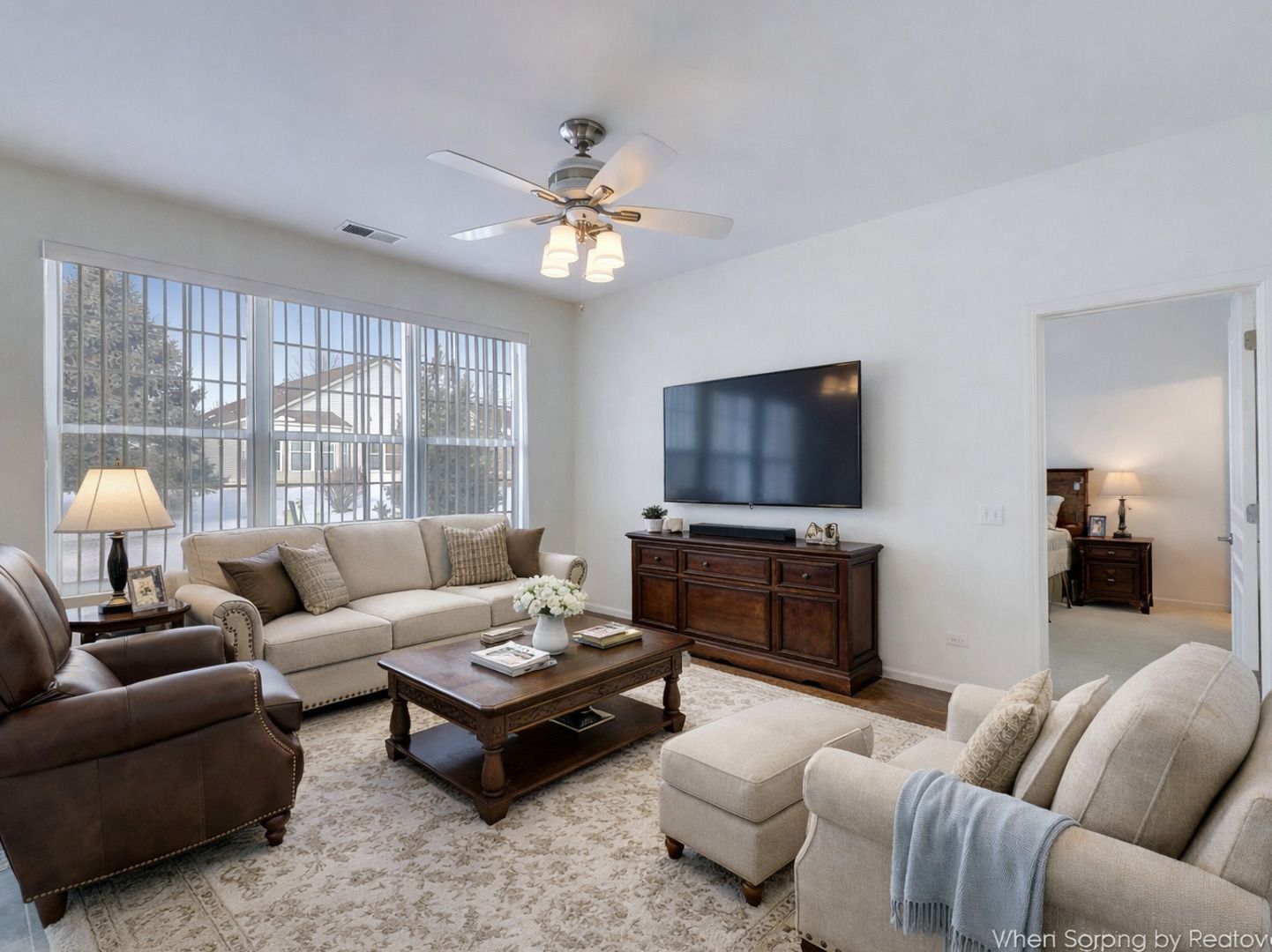55+ Community Living at it's Finest! This lovely 2 bedroom, 2 full bath ranch style home in Edgewater by Del Webb has all the amenities of a luxury resort. The eat-in kitchen and family room flow together seamlessly, while a separate living room and dining room add space for entertaining. The flex room off the entry is perfect for an office or den. The peaceful primary suite has a large walk-in closet. Edgewater has lovely lakes, ponds, open space and numerous walking/biking trails. The Lodge has indoor and outdoor pools, fitness center, tennis/pickleball courts, bocce ball, billiard room and so much more! Close to Randall Road shopping and dining too! New roof in 2020.