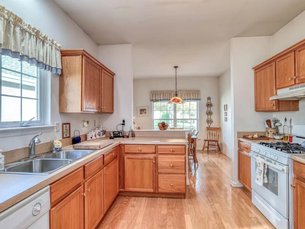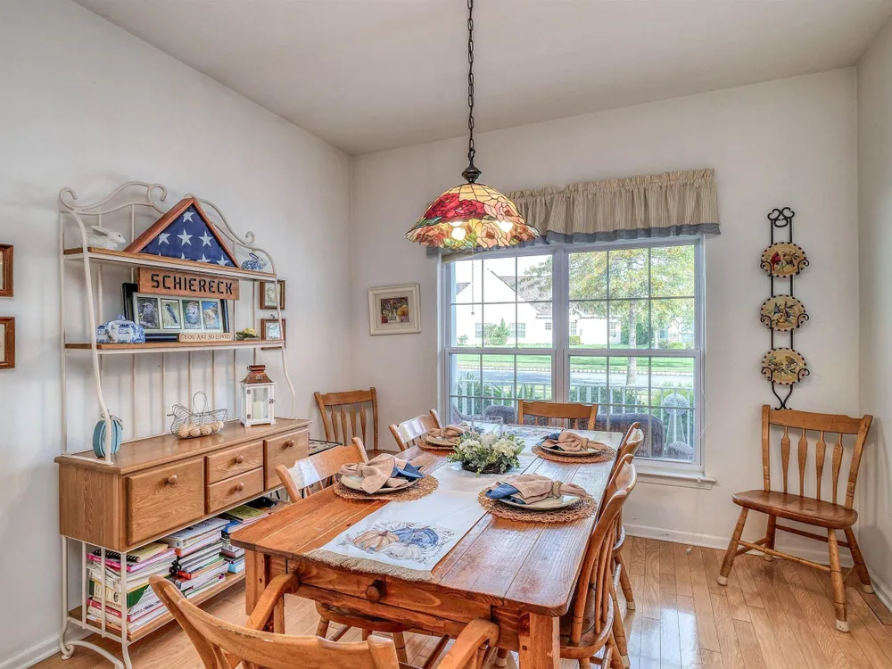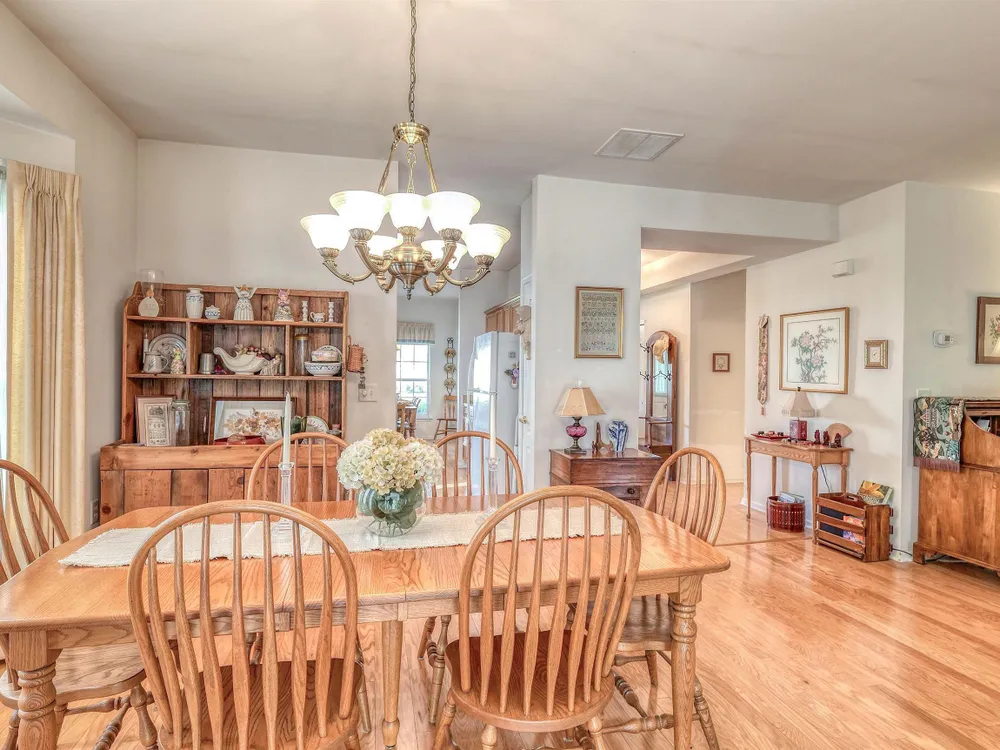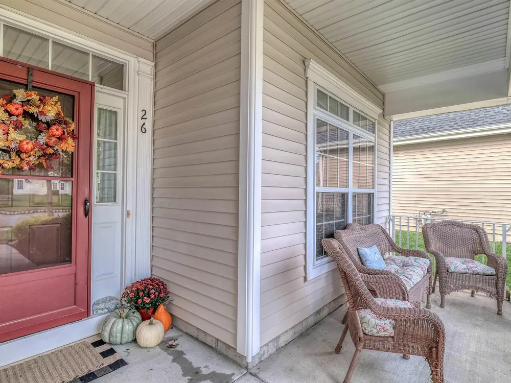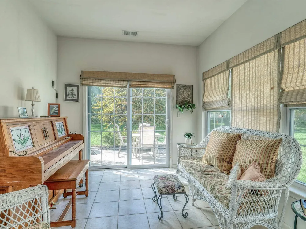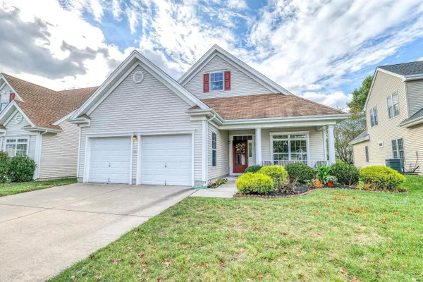 Welcome Home to this lovely Brookhaven model in the very desirable 55+ community of Village Grande. This well cared for home features hardwood floors in most of the main living areas, and tile in the sunroom. You'll love the covered front porch with plenty of room to sit and enjoy the activity in your neighborhood or if you prefer a little more privacy, relax on the back patio which offers a retractable awning for shade on those hot summer days. The formal living room has a beautiful gas fireplace and custom drapes, the large formal dining room features a bay window with custom drapes. The kitchen sits between the dining room and the sunny breakfast room for informal dining. The entrance foyer is warm and welcoming with a large coat closet. The main bedroom is in the back of the home with two closets (1 is a large walk-in) and a luxurious bathroom with large double sink vanity, soaking tub and tiled shower stall. The guest bedroom is situated towards the front of the home with another bathroom (this one features one of those unique senior bathtubs with a door for easy access) There's also a good sized laundry room and a two car garage offering plenty of storage. Don't miss out - this one won't last long!