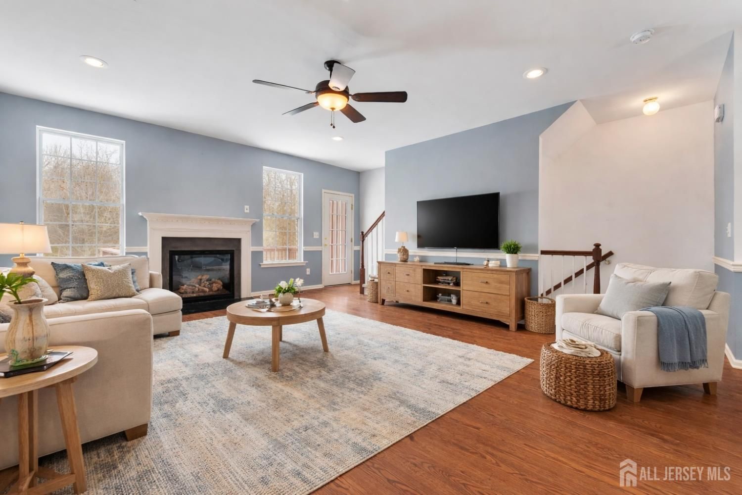 An exceptional opportunity to own one of Madison Crossing's most desirable residences, uniquely positioned to capture rare privacy and tranquil preserved views. This beautifully appointed 2-bedroom, 2 full and 2 half-bath townhome with a 1-car garage blends refined design with effortless, low-maintenance living in a sought-after 55+ community. Gleaming hardwood floors enhance the open-concept main level, where a spacious eat-in kitchen with large pantry flows seamlessly into the dining and living areas, anchored by a warm gas fireplace. Sliding glass doors open to a private deck overlooking protected preserved land a premium setting offering peaceful natural scenery. The upper level reveals a tranquil primary suite offering generous WIC closets and a refined ensuite bath with dual vanities, a sleek glass-enclosed shower, and a privately positioned commode. A well-appointed guest suite and upper-level laundry complete the floor with effortless functionality. The finished lower level, complete with a half bath, offers versatile space ideal for a media lounge, private office, or additional gathering area, extending to a tranquil patio retreat. Thoughtful features include two-zone HVAC, abundant storage, and access to clubhouse amenities, swimming, landscaping, and snow removal, all moments from Route 9 shopping, dining, and transportation.