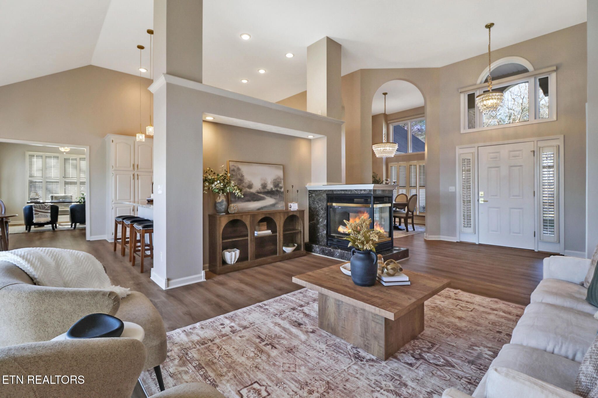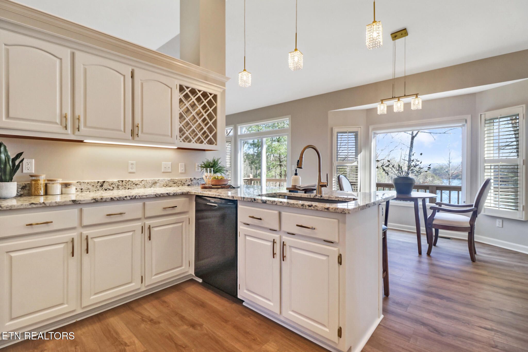 Tucked away on a peaceful cul-de-sac on Glastowbury Lake, this beautifully renovated 2,833 sq ft lakefront retreat offers serene views, modern upgrades, and move-in-ready comfort. Recently connected to FFG sewer, this traditional home features three bedrooms, three and a half baths, and a thoughtfully designed split-bedroom layout. Curb appeal shines with a striking brick façade, manicured landscaping, and recent exterior improvements including a new roof (2020) and gutter guard system (2021). Inside, recent updates completed over the past few months include new flooring and paint throughout, updated kitchen and bath countertops, and modern light fixtures, adding fresh style and functionality throughout the home. Enjoy outdoor living on the expansive 27' x 8' back deck overlooking tranquil woods, a re-decked private dock, and the glistening lake—perfect for birdwatching and unwinding in nature. The interior welcomes you with soaring 13' vaulted ceilings and a dramatic see-through gas fireplace connecting the living and dining areas. Large windows and a sliding glass door flood the space with natural light and showcase breathtaking lake views. The kitchen serves as a stylish and functional centerpiece, featuring quartz countertops, painted solid-wood oak cabinetry, luxury vinyl plank flooring, a breakfast bar, and an eat-in nook with lake views. The formal dining room offers tall ceilings and oversized windows, creating an elegant and inviting space for gatherings. The spacious primary suite includes a textured ceiling, cozy gas log fireplace, walk-in closet, and a luxurious ensuite bath with double vanities, jetted tub, and walk-in shower. Nearby, a 16' x 11' den continues the lake views and leads to a full guest bath and a 12' x 13' guest bedroom. Additional main-level features include a third full bath, a well-equipped laundry room with utility sink, and access to the attached 20' x 21' two-car garage. The finished walk-out basement extends your living space with a 12' x 11' guest suite, a 22' x 14' family room with outdoor access, and a full bath. A generous 12'10' x 14'6' workshop/flex space with new double doors provides excellent versatility and direct access to a crawlspace with ample storage. Mechanical highlights include two water heaters, a water softener, dual HVAC systems (downstairs approx. 16 years old; upstairs unit new in 2021), and a whole-house generator for year-round peace of mind. This exceptional lakefront home blends comfort, privacy, and scenic beauty—an opportunity not to be missed.