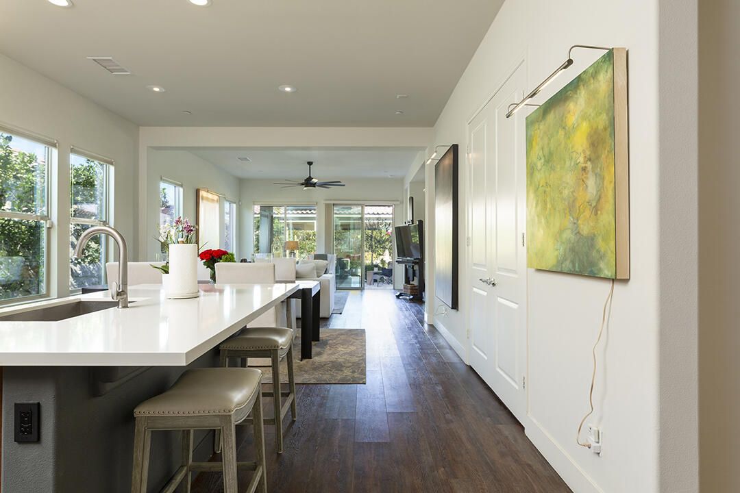 Experience luxury desert living in this contemporary home located within the highly sought-after Del Webb community of Rancho Mirage. A truly immaculate 2-bedroom residence with an office/den and 2 bathrooms, it is ready for you to enjoy immediately. The light-filled interior showcases rich engineered wood flooring, designer color palettes, and elegant finishes throughout. Its open kitchen features a chef's paradise with a dine-in prep island, warm wood cabinetry with ambient lighting, light-toned counters, a large pantry, and a full stainless-steel appliance package. Windows fill the living and dining areas with natural light, and sliding glass doors open to a lush, garden-like backyard. Here, multiple fountains provide the tranquil sound of running water, and a covered patio with a commercial-grade misting system and electric heaters ensures year-round outdoor enjoyment. An extended paver patio offers additional seating areas with mountain views and even a small citrus orchard. The primary suite overlooks the backyard oasis and has a spa-inspired bathroom with a large walk-in closet, and a generous shower. The second bedroom is off the hallway adjacent to the kitchen. It features plush wall-to-wall carpeting, a large closet, and easy access to a full guest bathroom in the hall, where there is also access to the 2-car garage. Del Webb is the premiere 55+ community in the desert for those interested in the convenience of having an active community and community center. The clubhouse features a state-of-the-art fitness center, two resort-style pools, and a wide variety of social activities and classes. Outdoor enthusiasts will enjoy four tennis courts, eight pickleball courts, and miles of scenic walking and hiking trails woven throughout the community. This home is spectacular, and the furnishings are even available outside of escrow, in case you not only fall in love with the home but also hope to have it look as elegant the day you buy it as the day you saw it.