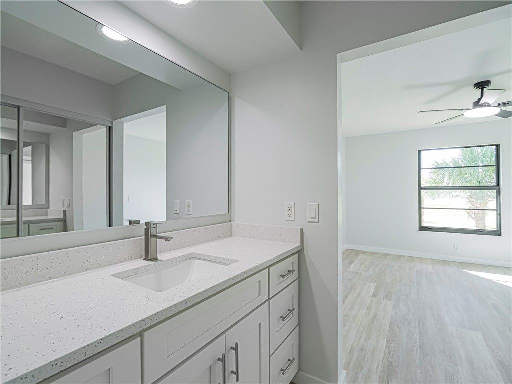 Scenic golf course views, completely remodeled. NEW: ceiling fans & light fixtures, interior doors, GE SS appliances, quartz countertops, white shaker cabinets, tiled showers & luxury vinyl flooring throughout. Enjoy your Florida quiet retreat or capitalize on as a high-demand rental in a vibrant 55+ community. Low-maintenance living w/ resort-style amenities, 2 heated pools, tennis, pickle ball & shuffleboard. Impact glass, assigned covered parking, washer & dryer included, offering comfort, convenience & an exceptional lifestyle. Great location !!! Beach is 15 minutes drive. Near shopping.
