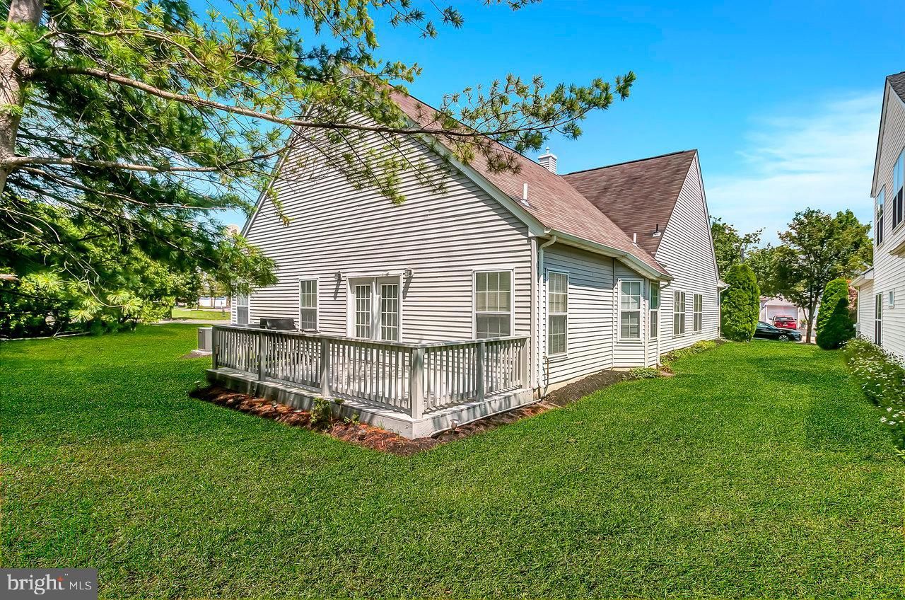 Welcome to this nicely maintained Deerfield model, ideally situated on an oversized corner lot in the highly desirable 55+ community of Village Grande. Step inside to discover an elegant and thoughtfully designed layout. The versatile front office or library, makes a perfect workspace or cozy reading nook. The open-concept living and dining areas feature gleaming hardwood floors, creating a welcoming space for entertaining or everyday comfort. The kitchen is a standout with a sunlit dining area, a spacious center island, brand new dishwasher and a walk-in pantry—perfect for the home chef. It flows seamlessly into the family room with brand new carpet. Step outside to the comfortable deck bordered by mature evergreens—an ideal spot for relaxing in nature. The primary suite offers two generous walk-in closets and a ensuite bath with dual vanities, an oversized shower with seat, soaking tub, and ample linen storage. A second bedroom, full bath, and a convenient laundry room complete the main level. Enjoy all that Village Grande has to offer—indoor and outdoor pools, fitness center, sauna, tennis courts, clubhouse, billiards, library, and scenic walking paths. Conveniently located near shopping, dining, NJ Transit, and the NJ Turnpike, this home offers the perfect blend of privacy, comfort, and an active lifestyle.