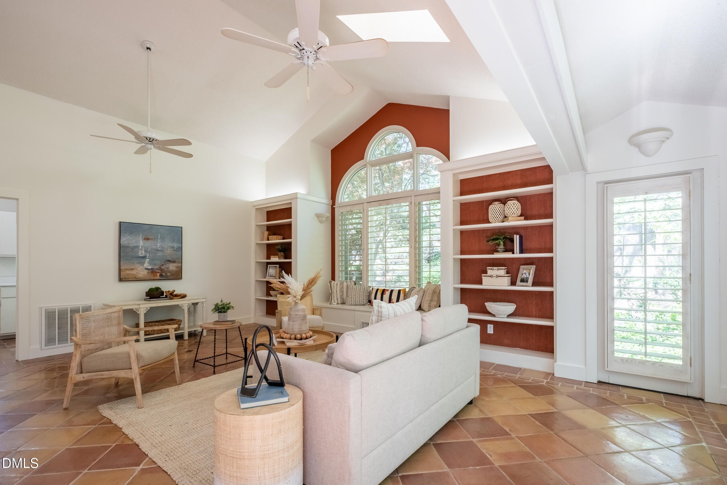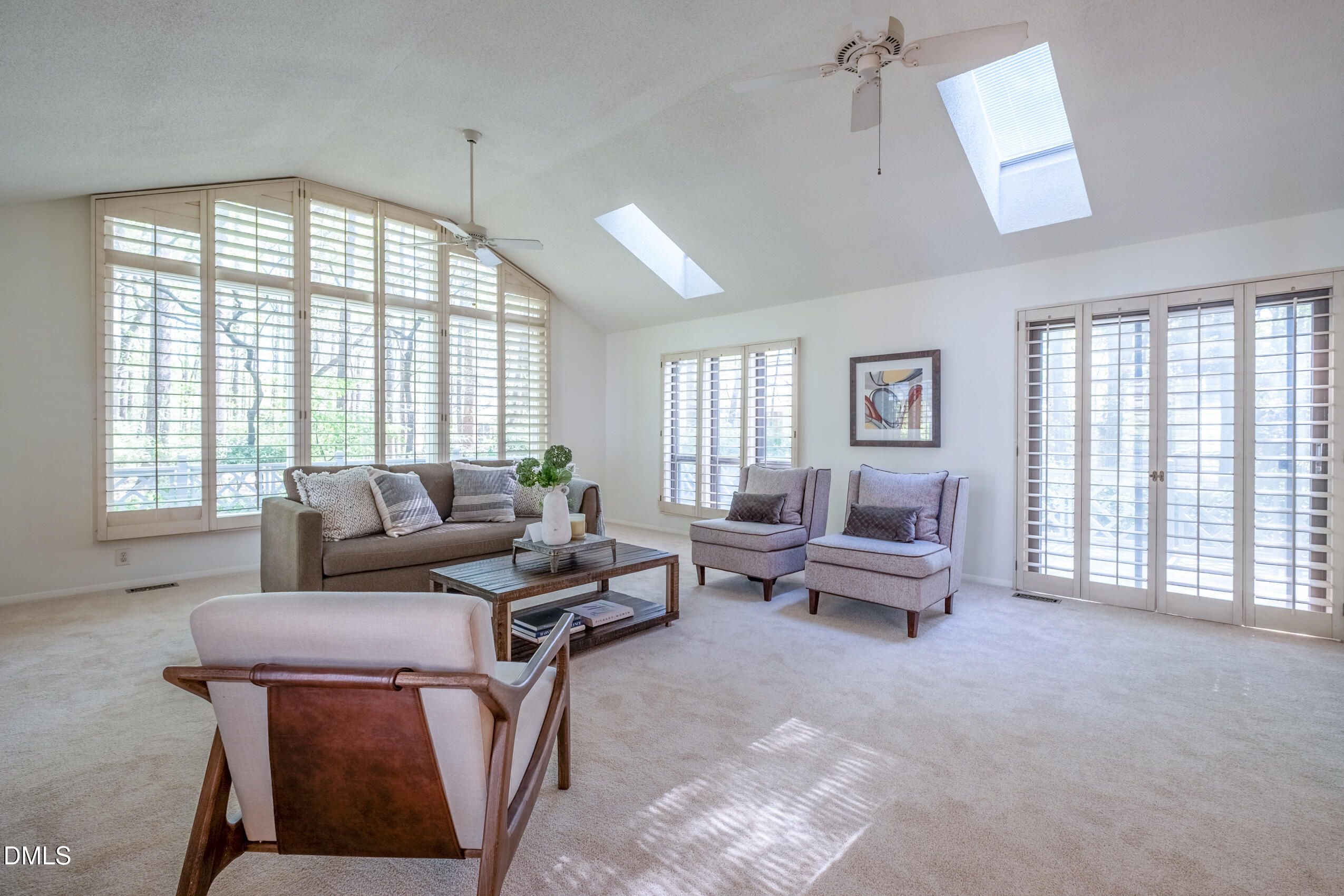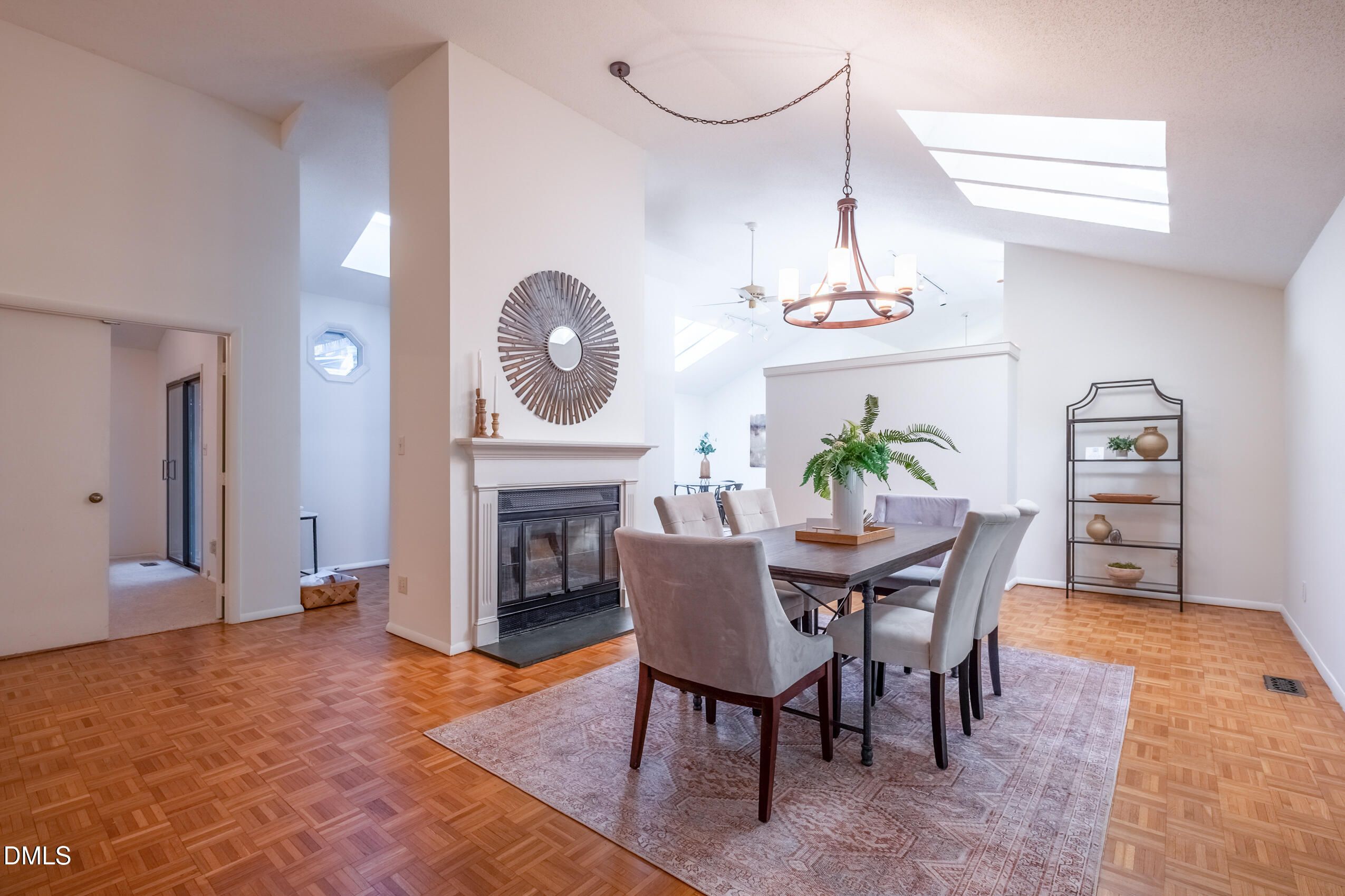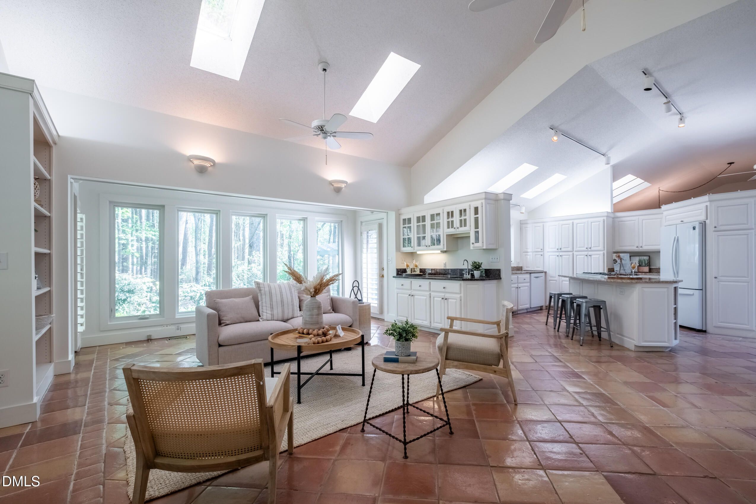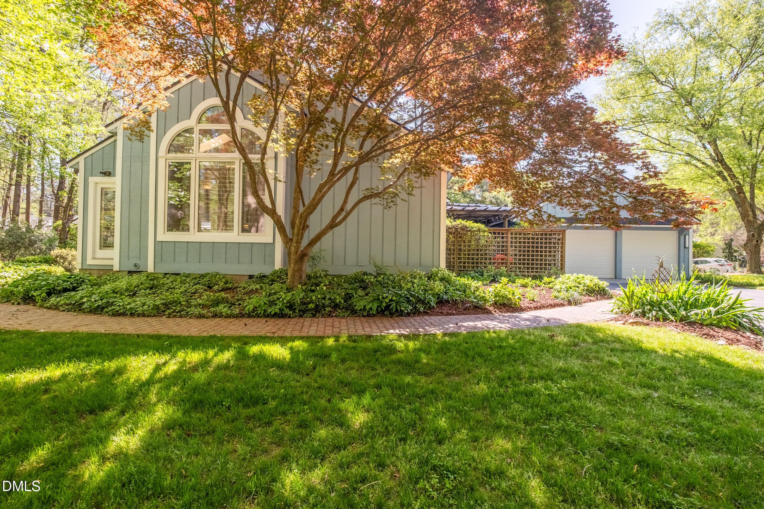 This beautiful one level Fearrington home situated on a large flat landscaped lot has been painted inside and out, new roof 2025, HVAC updated 2024, new wall oven, cooktop and refrigerator, new carpet in the bedrooms and living room. Plenty of room for entertaining in large dining room with fire place, living room and family room includes wet bar and access to the beautiful brick back patio with pergola perfect for outdoor dining. This home has much natural light with large windows, plantation shutters, skylights, Saltillo Mexican tile, and is an easy walk to the pool and croquet/swimming just down the street (separate optional fee). Come enjoy the privacy of this home while still being connected to all that Fearrington Village has to offer!