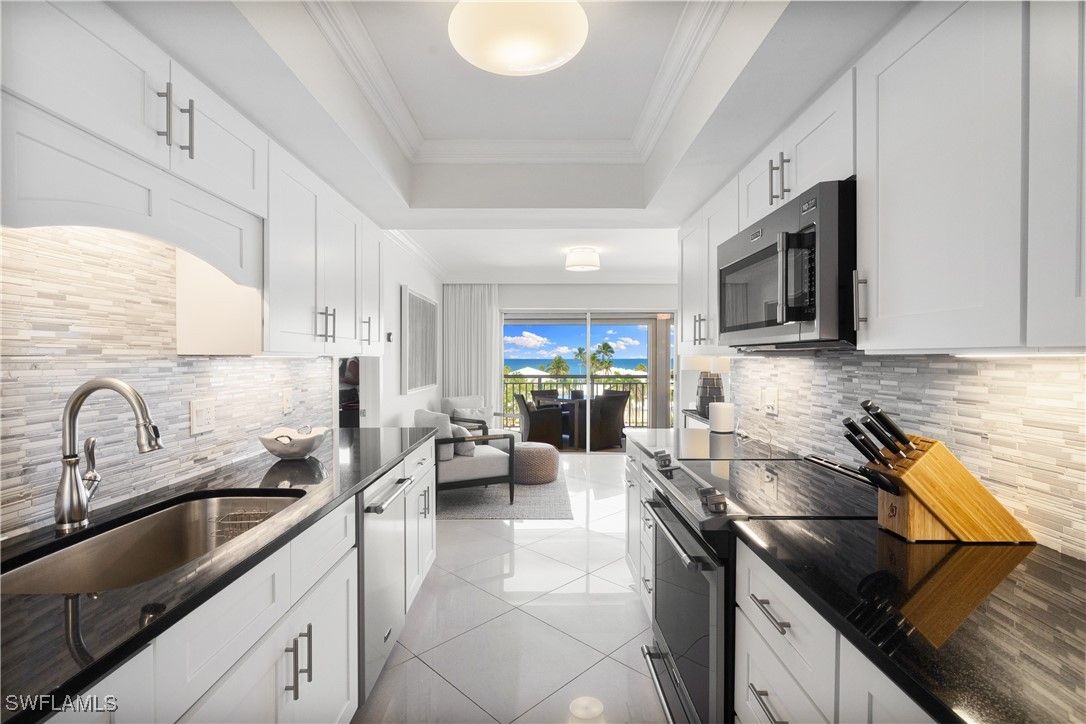 Light, bright and the perfect size for your beach getaway, this 5th floor Spindrift Club Condo is move in ready and offers stunning western views of the Gulf. Step in and be greeted with sleek tile floors and comfortable ceiling heights all leading out to the screened balcony which overlooks Gulf Shore Blvd and beyond, perfectly sized for both comfortable seating and dining. Nicely updated, the kitchen offers lots of cabinetry, modern stainless-steel appliances, under cabinet lighting and plenty of counter space. Residents and guests alike will feel right at home in the spacious bedrooms offering west facing windows and nicely remodeled bathrooms with marble tile floors and expansive step in showers. All ideally located in the heart of the Moorings, the Spindrift Club is right across the street from the beach and also offers boat docks for lease allowing for easy, no bridge access to the Gulf. If you are looking for easy Naples living, look no further than Spindrift Club #54! Buy with confidence in mind, Spindrift Club has already completed all the necessary Structural Integrity inspections and is fully reserved!