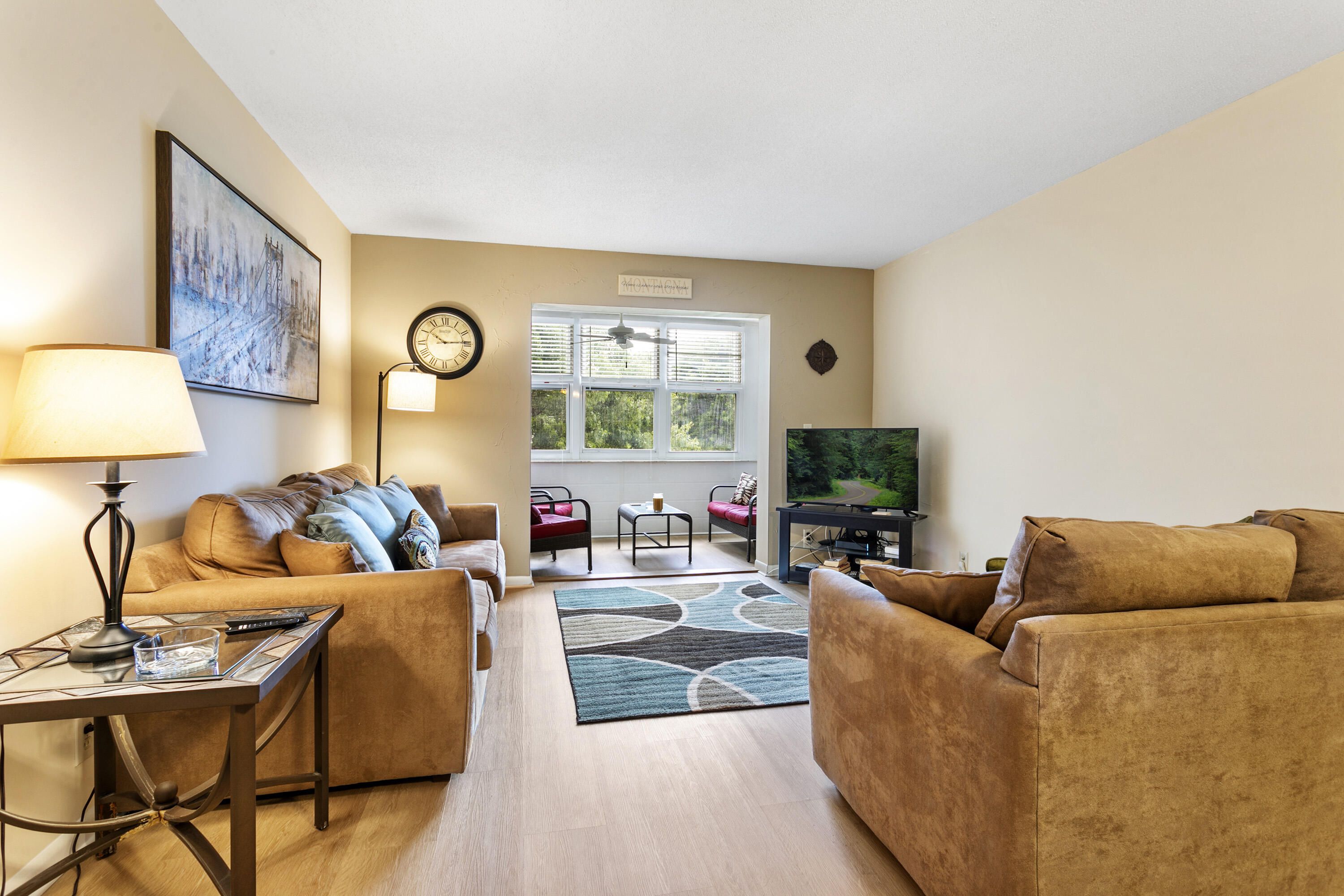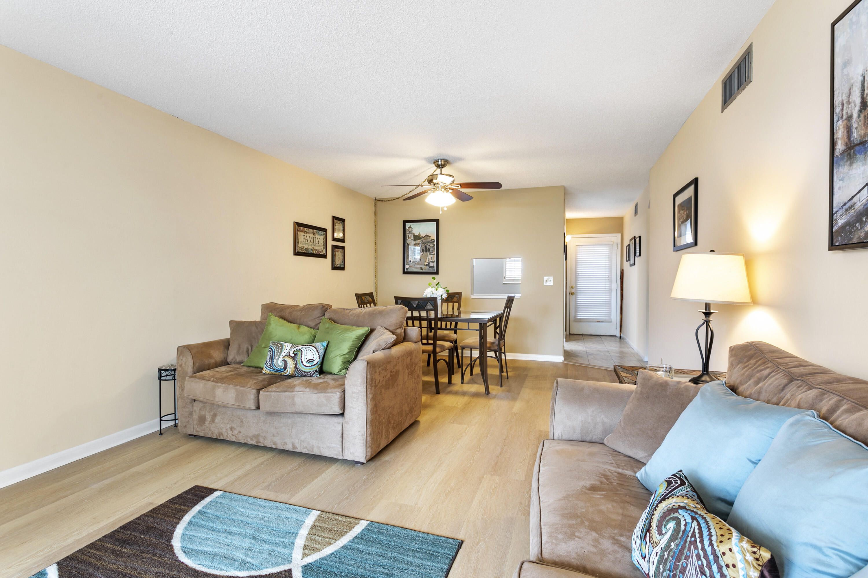 Move-in ready 2-bed, 2-bath condo near the beach! This turnkey home features hurricane windows, wood flooring throughout, and fresh carpet in the bedrooms. The spacious living area includes an extended sitting room and dining space, while the fully equipped kitchen has all the essentials. The primary bedroom boasts two closets, including a walk-in, with a step-in shower in its en-suite bath. The guest bedroom also has a walk-in closet, and the guest bath includes a tub. Newer AC and water heater. Located in an active adult community with pools, tennis/pickleball, a clubhouse, fitness center, movie night, theater and more! Monthly fee includes basic cable, water, sewer, trash removal and exterior insurance.