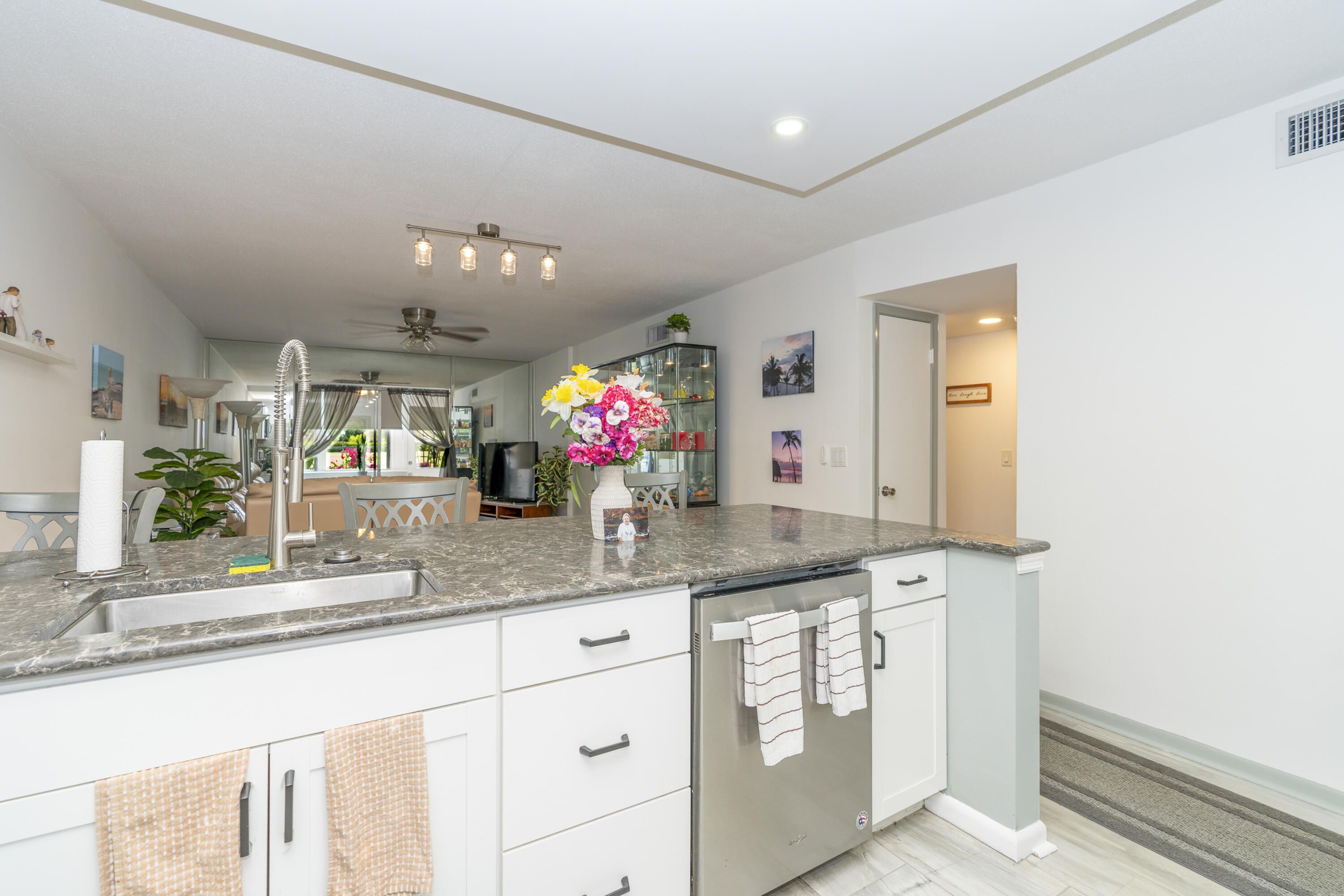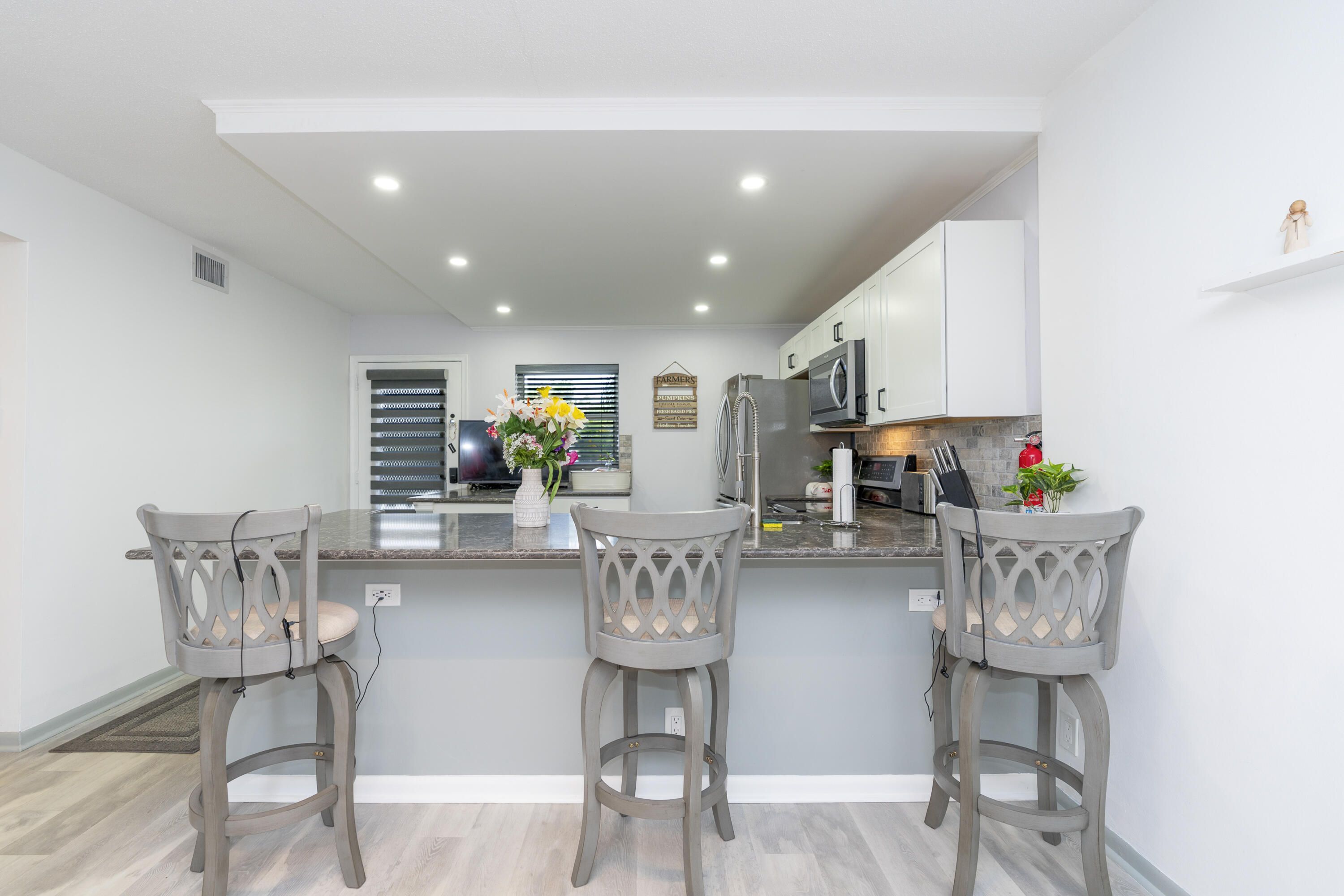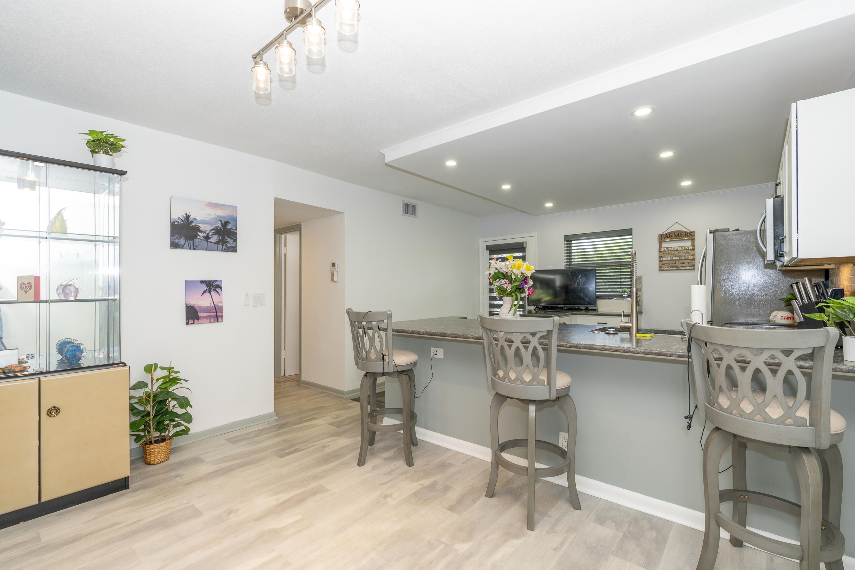 Unfortunately owners must move, priced to sell (and move in)! Great location, WOW! Splendid renovated 2/2 condo w/ modern feel on the 1ST floor. Fully, tastefully and completely renovated, unit is furnished and turnkey. Kitchen and baths renovated from top to bottom, 2025 HVAC, Electrical wiring and box redone and 2025 Hot Water Heater. Energy saving adjustable lighting throughout and ceiling fans throughout. Flooring redone throughout with upgrade tile. A rare find for this unit, it includes a washer and dryer! The outside screened in patio adds extra storage space, while you get to enjoy the manicured foliage and large open courtyard providing peace and tranquility. This unit provides the perfect orientation with the E & W to get the ocean breeze and breath taking sunsets!