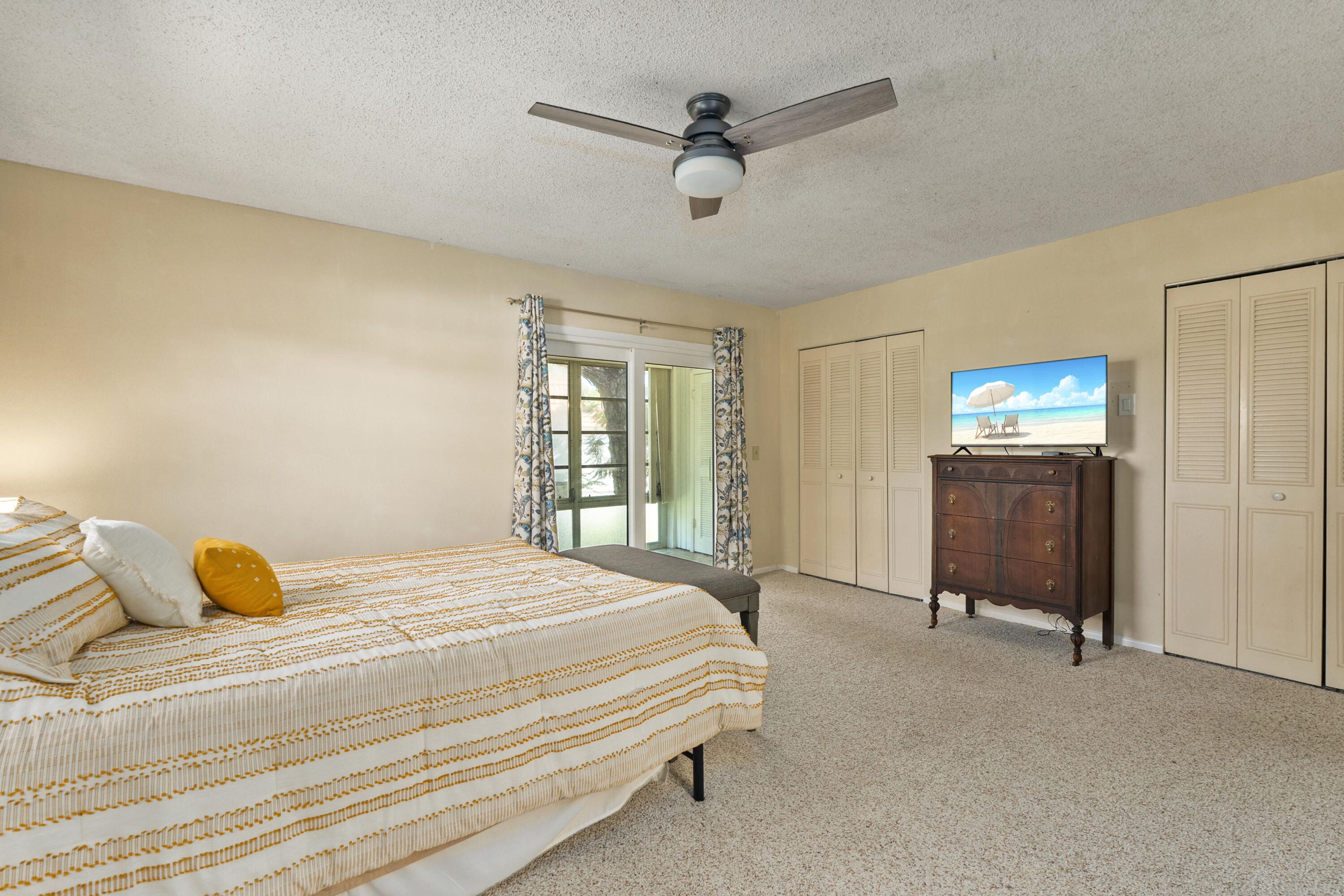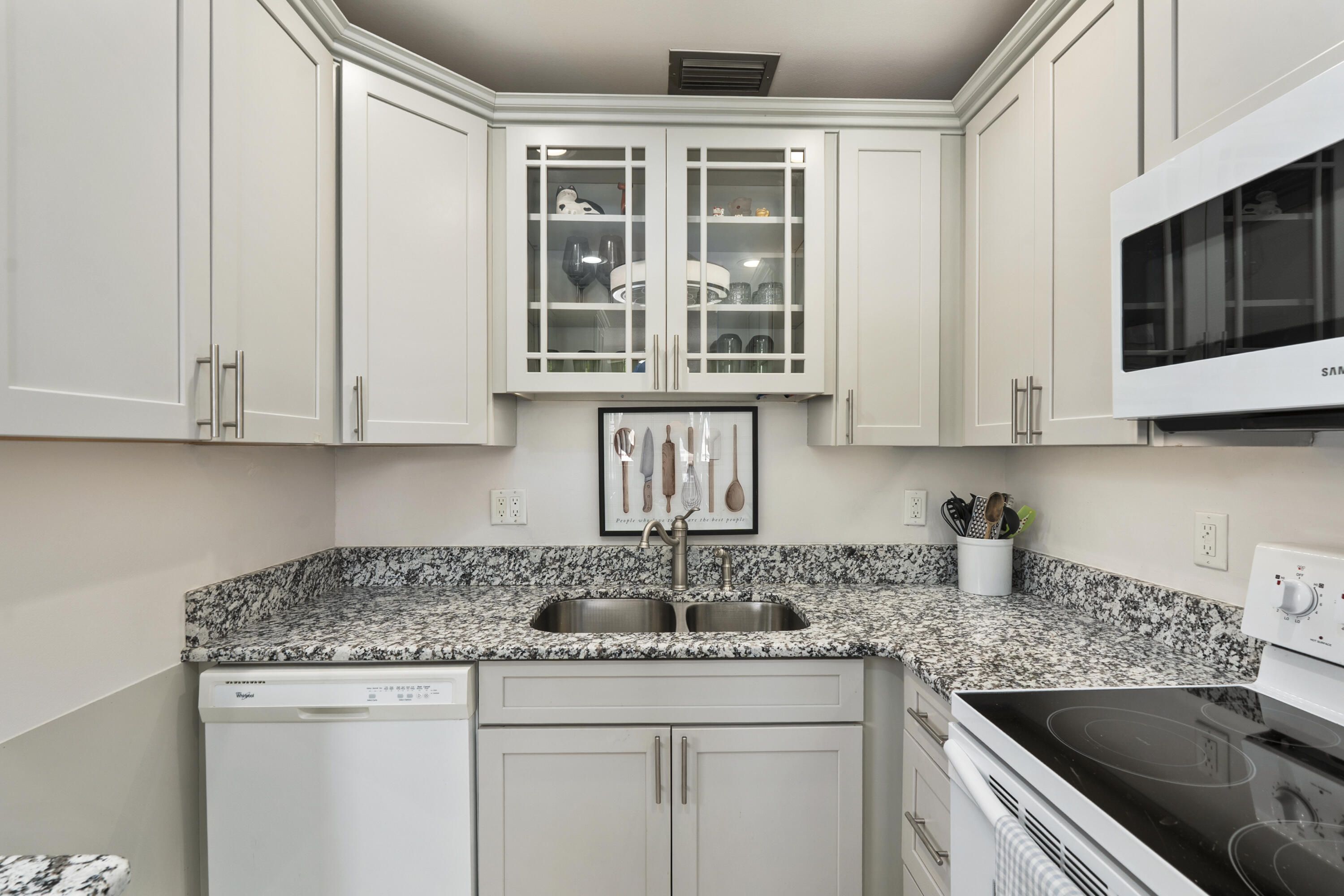 Partially furnished 1Bed 1.5Bath bright and airy end unit. Stunning remodeled kitchen featuring solid Wood 36'' Gray shaker cabinets, built in pantry, 3cm Granite Counters, high hat lighting, under cabinet lighting, glass accent doors, wine rack, white Whirlpool & Samsung appliance package. Recent upgrades include laminate & tile floors, hardwired Hunter ceiling fans, 6'' baseboards, décor electrical switches, lighting, screened front door, new toilets. Impact Sliding Glass door to glass enclosed screen patio with storage. Accordion Hurricane Shutters, Roof 2023, A/C 2022, newer screens & water heater. Great location just a short walk to community club house with Pool, Dance Hall, Library, Gym, Shuffleboard & workshop. Close to shopping, restaurants, and beaches. No pets or Pick-up trucks.