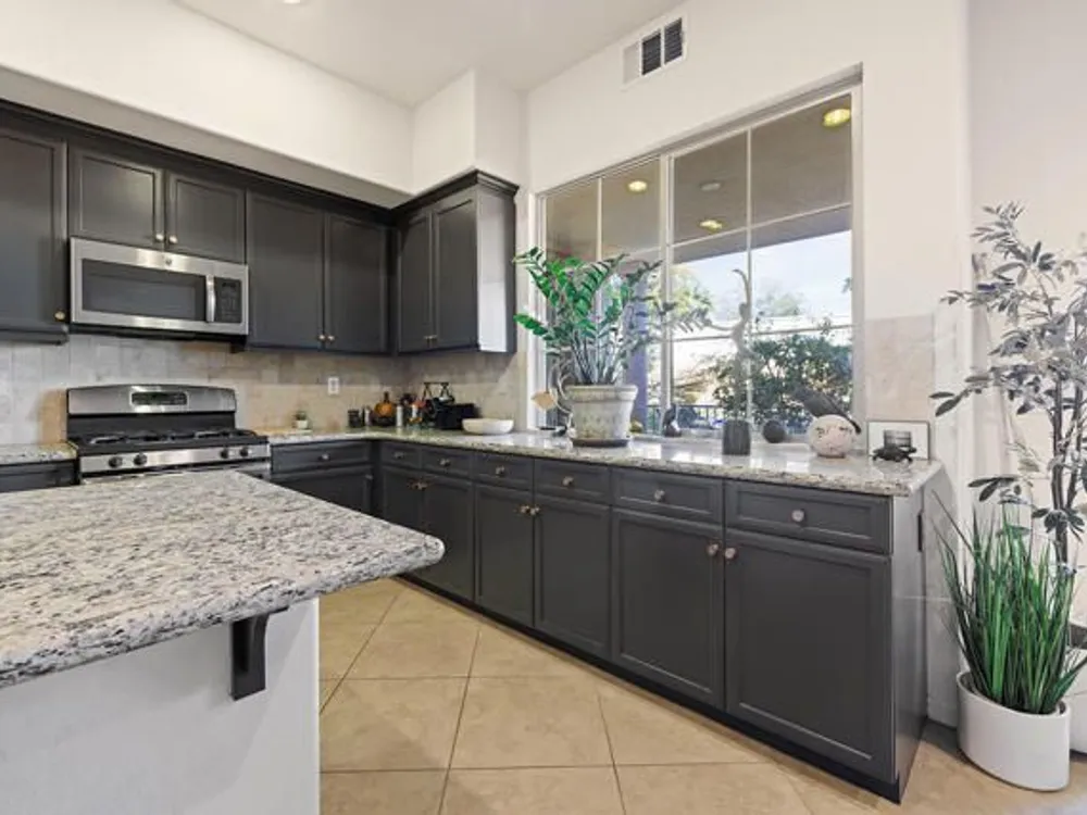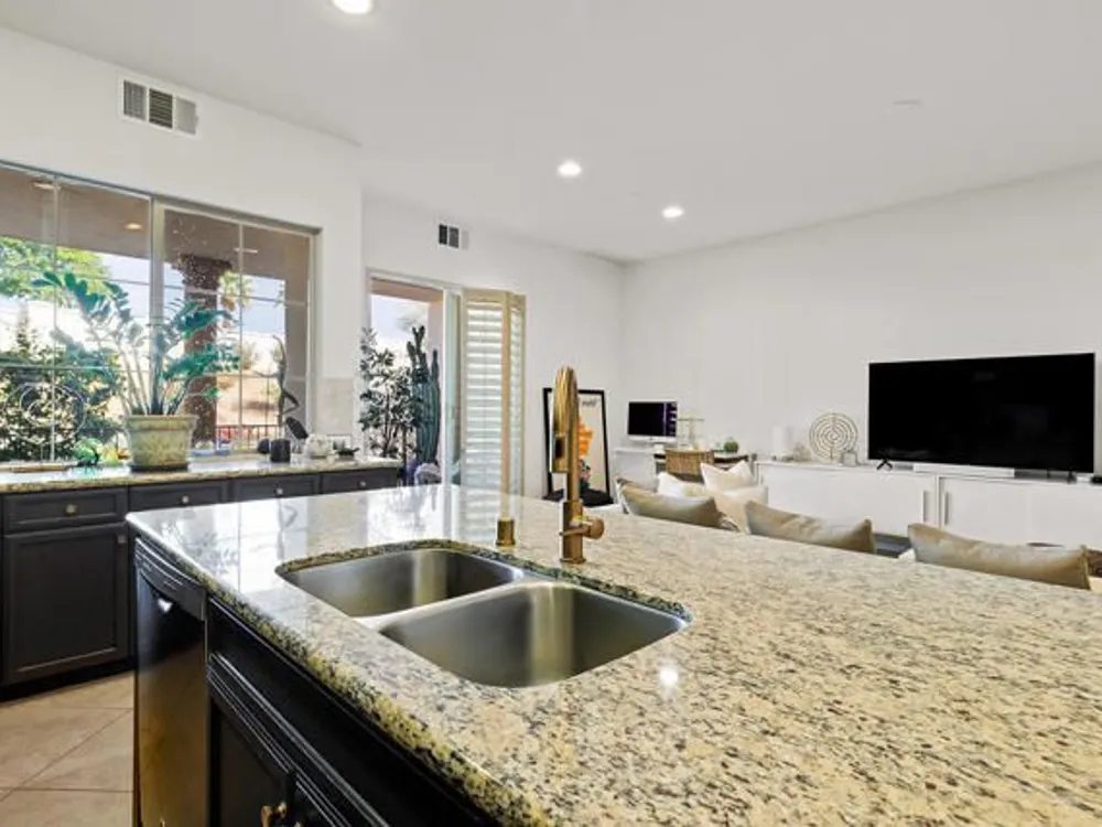 Wonderful Sorrento, Vista Fiore Model. Pride in ownership shows as you enter this open floor plan. One bedroom with one and a half bath and an office area that can easily be used for formal dining or a guest area. The kitchen is a chef's dream with granite slab counters, stainless cooktop and plenty of cabinet space to store your favorite culinary gadgets. A spacious patio offers peace and solitude and plenty of protection from the sun. The attached 2 car garage gives ample storage and keeps your vehicle out of the elements. Owned solar panels will dramatically lower your electric bills. A 30,000 sqft. Clubhouse offers all you need, 2 restaurants, 100 seat movie theater, library, sports bar / game room, gym, heated pool and spa, miniature putting coarse and much much more. Located just minutes from El Paseo, Eisenhower Medical Center, McCallum Performing Arts Center and numerous grocery options within walking distance. Call today to set up your tour.