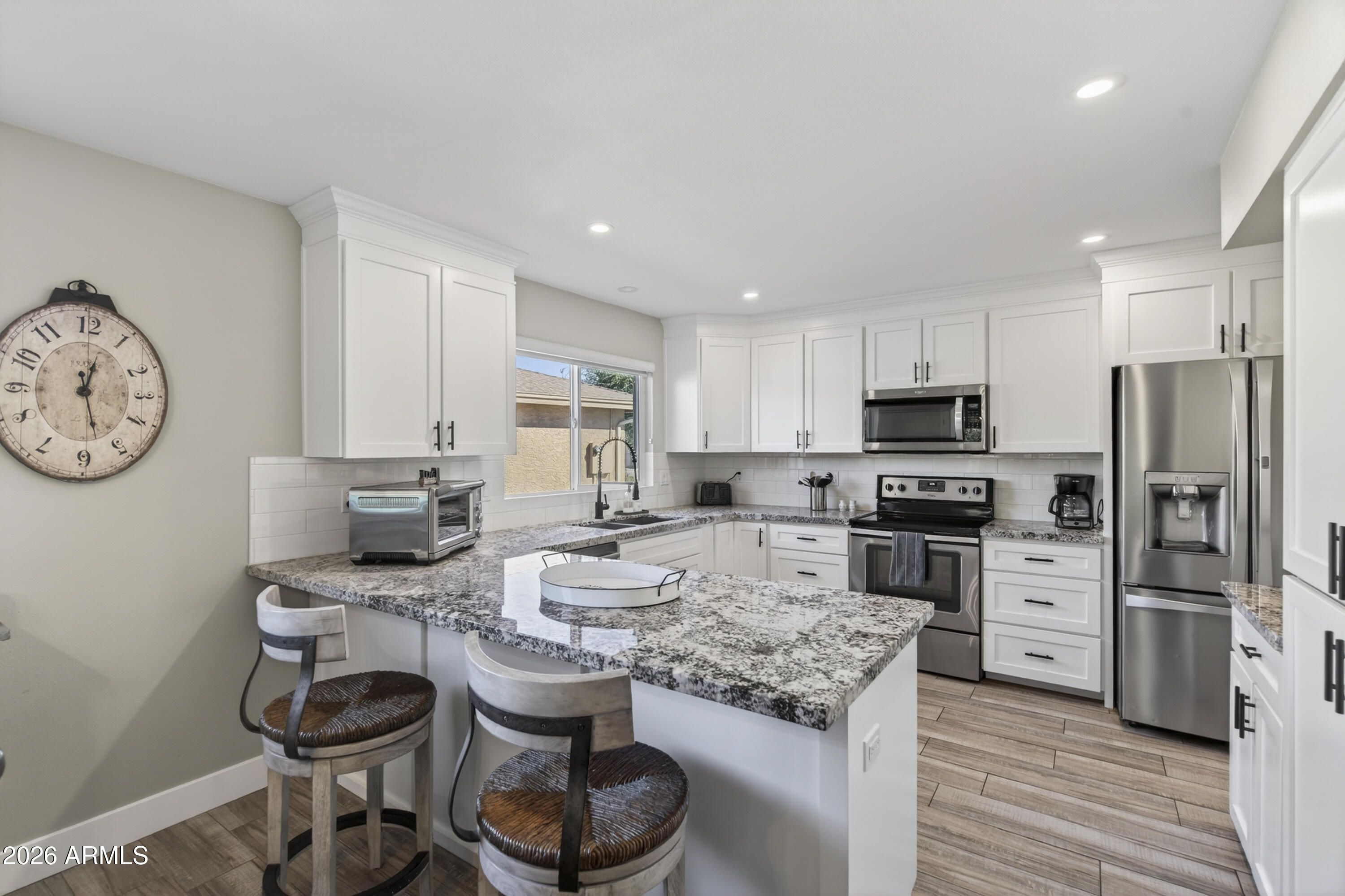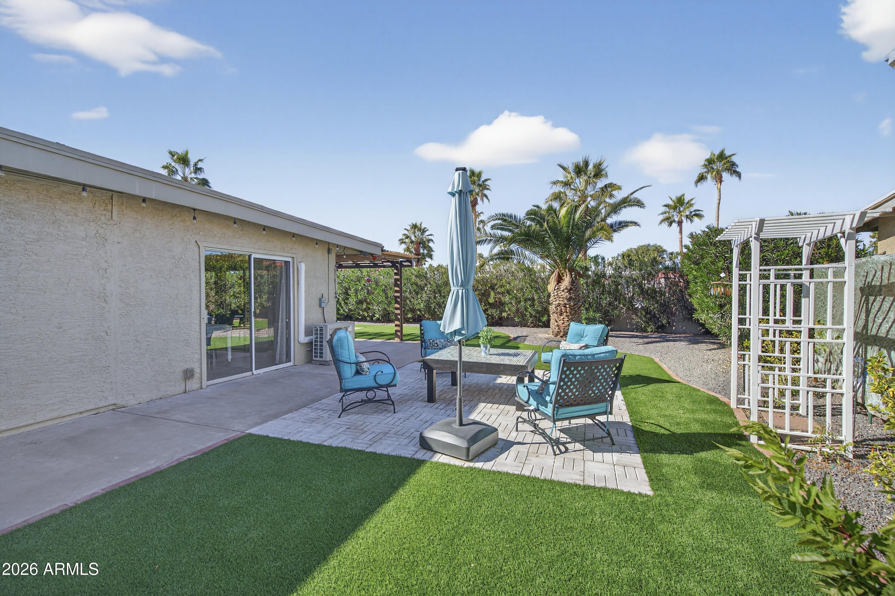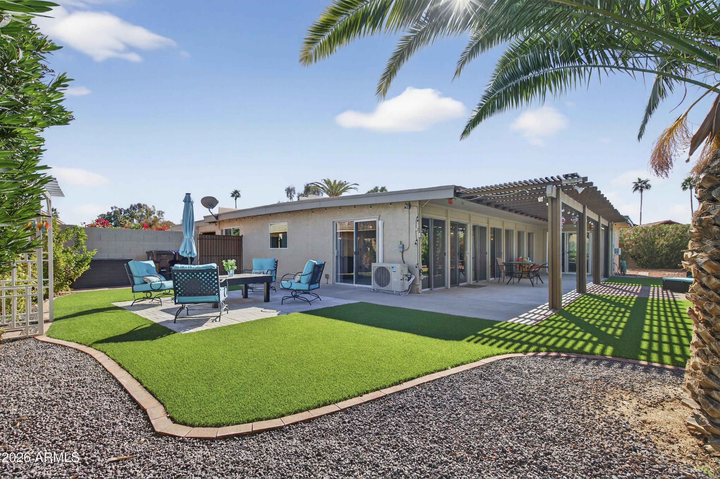 Located in a highly desirable Cottonwood subdivision in Sun Lakes, this beautifully Maintained home offers extensive upgrades and move-in ready appeal. The remodeled kitchen has white cabinets and granite countertops with added crown molding for a finishing touch. Both the front and backyard were completely redesigned in May 2024 with turf, pavers, decorative rock, irrigation and drip system, creating a low maintenance outdoor living. A new mini-split was added to the Arizona room in April 2024 for year round comfort. The primary bathroom was fully remodeled in April 2025. Additional upgrades include new LVP flooring in both bedrooms, fresh interior paint, roof sealed with elastomeric coating. Pride of ownership throughout the home. Lots of amenities in the community.