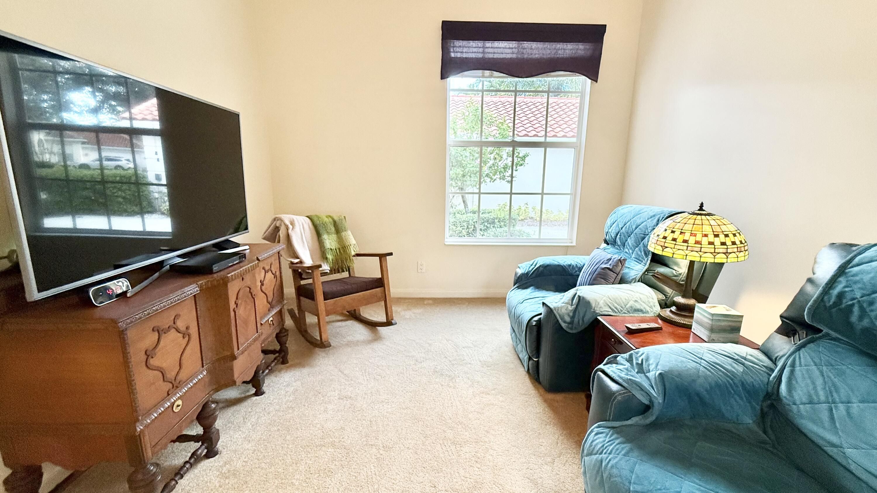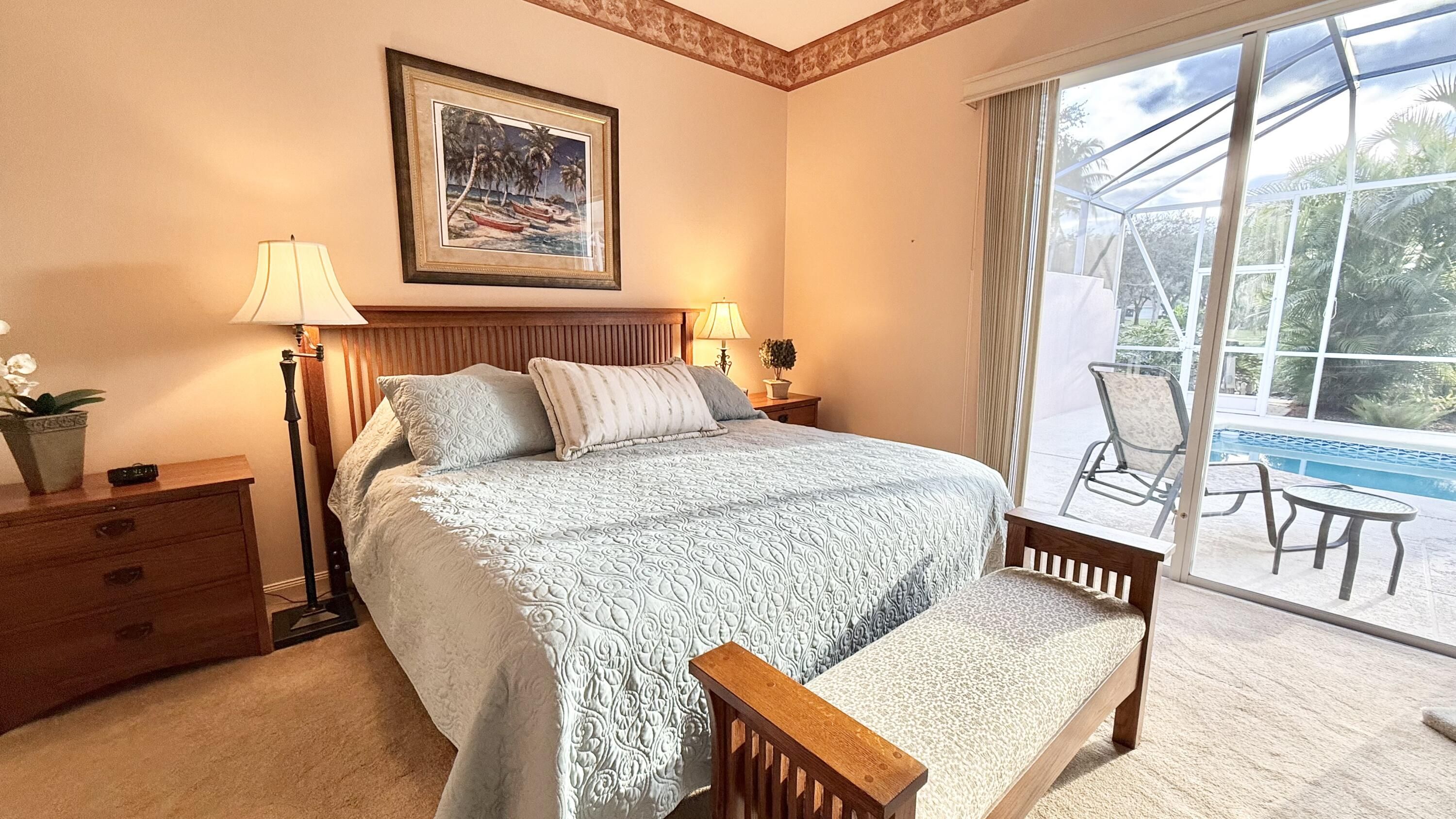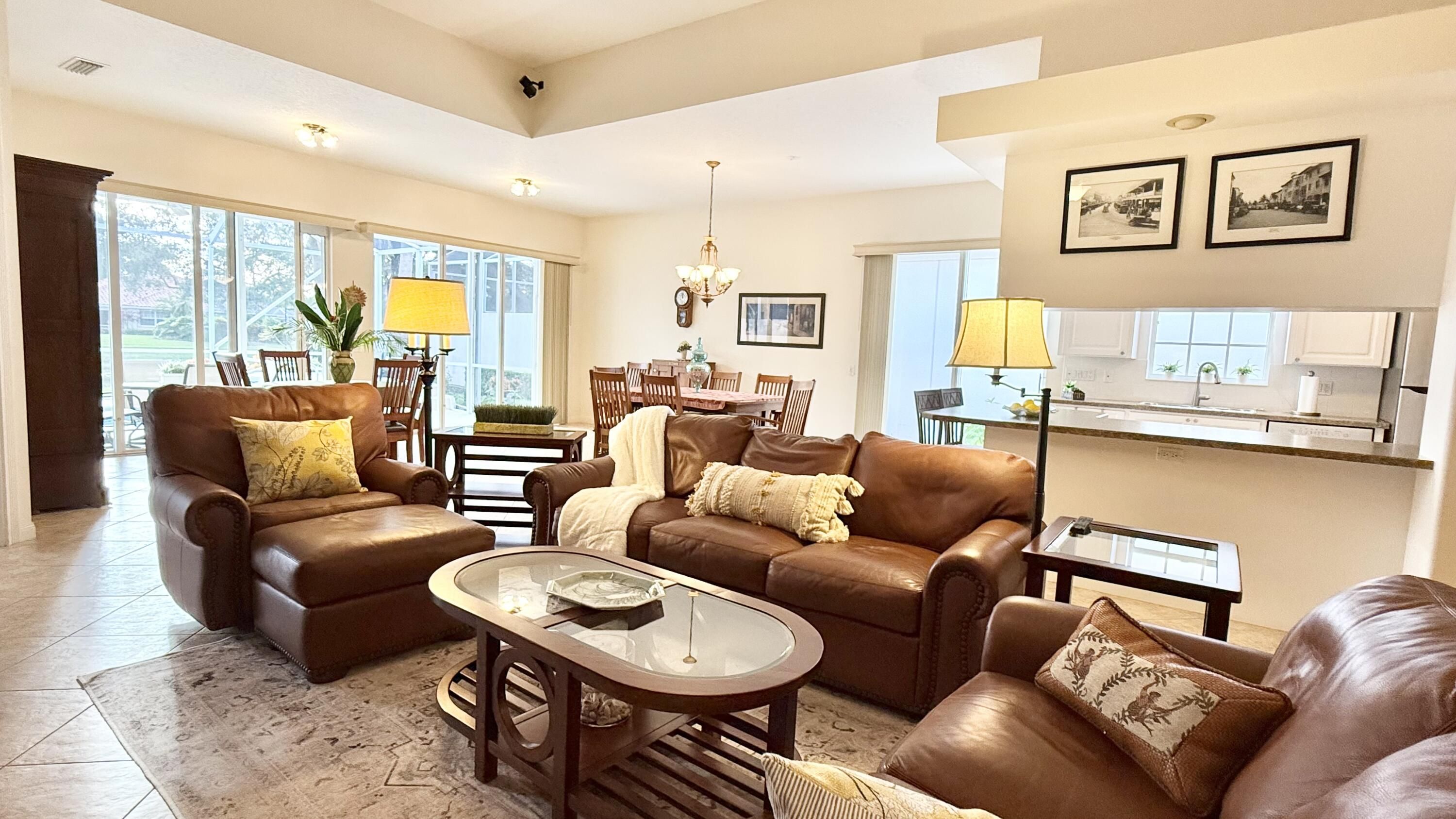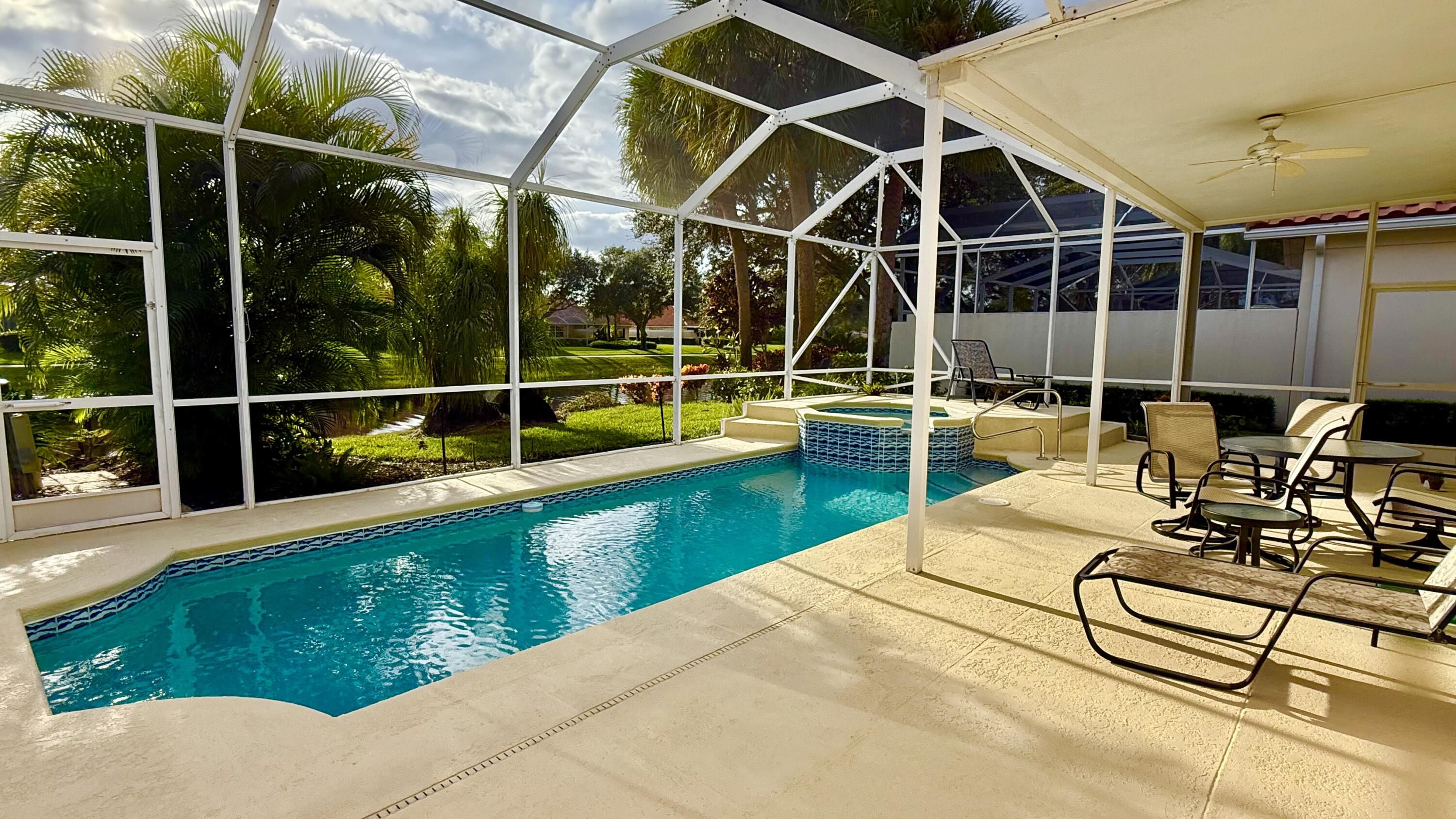 Stunning Oakmont model single-family home ideally situated on a quiet cul-de-sac with stunning lake views! This 3-bedroom plus den, 2-bath residence offers a bright open floor plan with soaring 12-foot ceilings in the great room, arched windows in the den and abundant natural light.The spacious primary suite features a unique his-and-hers bathroom arrangement and generous closet space. Tiled flooring throughout the main living area. Enjoy outdoor living at its best with a custom pool overlooking the lake and plenty of patio space for relaxing or entertaining. Additional highlights include a side-load 2-car garage with extra parking, laundry room with utility sink, and a new roof (2024) for peace of mind. Conveniently located just a short distance from the community's town center amenities
