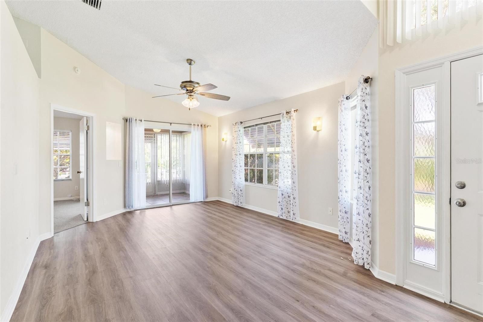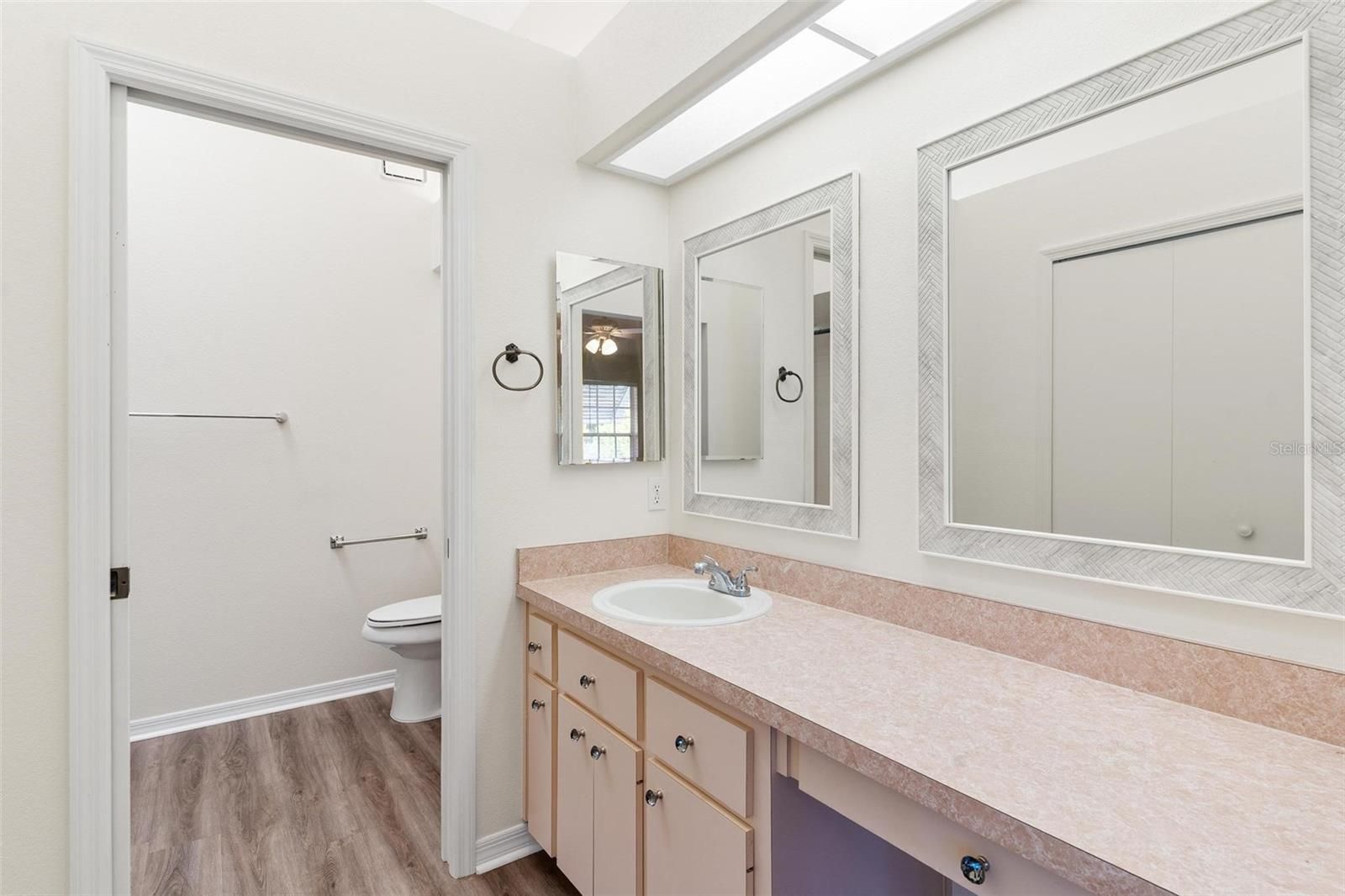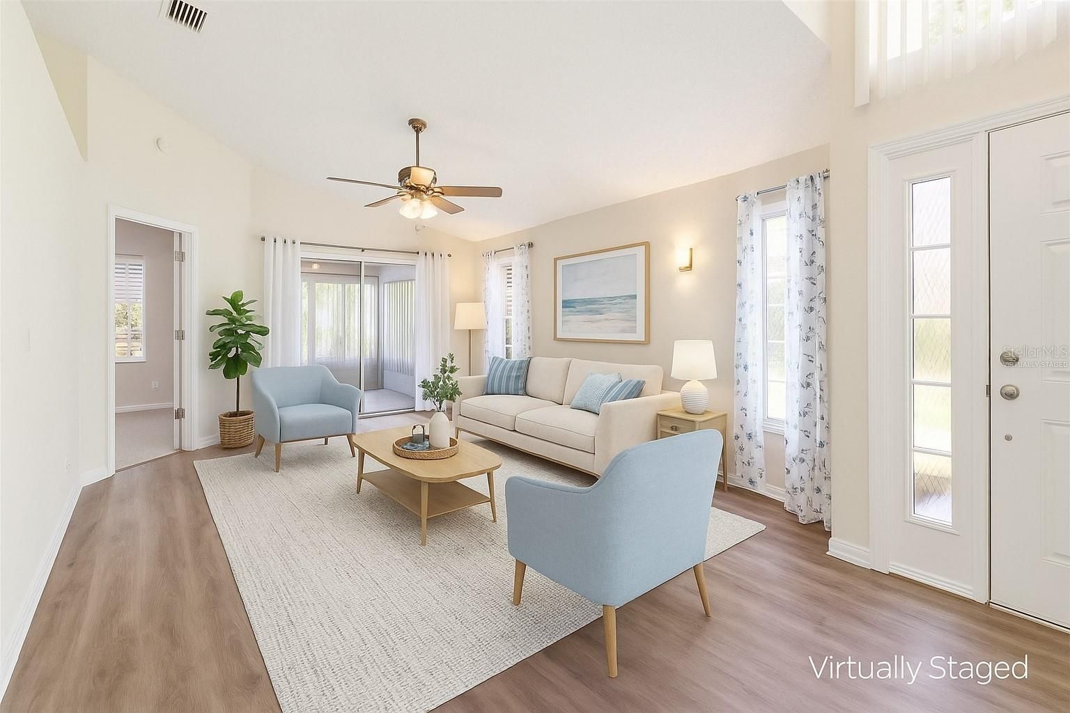 One or more photo(s) has been virtually staged. Charming Villa in Highland Lakes – A Premier 55+ Community in Leesburg! Come see this beautifully maintained villa in the highly desirable Highland Lakes, an active 55+ community offering resort-style amenities and a vibrant social atmosphere. This home features an open floor plan with luxury laminate flooring throughout and two spacious master suites. The living and dining area boasts vaulted ceilings and opens to a glass-enclosed Florida room—perfect for relaxing or entertaining. The kitchen offers a breakfast bar, abundant cabinet space, closet pantry, glass cooktop, and a cozy breakfast nook. The primary suite includes a walk-in closet, access to the enclosed porch and back patio, and a tiled bathroom with walk-in shower, skylight, and vanity with makeup area. The second suite has patio access, a walk-in closet, its own vanity and makeup area, and a pocket door leading to the water closet and tub/shower. Enjoy a 10x8 glass-enclosed Florida room and 10x8 open patios at both the front and back. The two-car garage includes built-in closets, washer and dryer area, an electric opener, a sliding screen door, and an updated electrical panel for added peace of mind. The yard is nicely landscaped with a sprinkler system, and lawn maintenance is included in the low HOA fee. Guest parking is conveniently located across the street. Highland Lakes offers a clubhouse, indoor pool, tennis and pickleball courts, bocce ball, softball field, RV/boat storage, and plenty of community activities. Located just minutes from the Turnpike for easy access to Orlando. Schedule your private tour today!