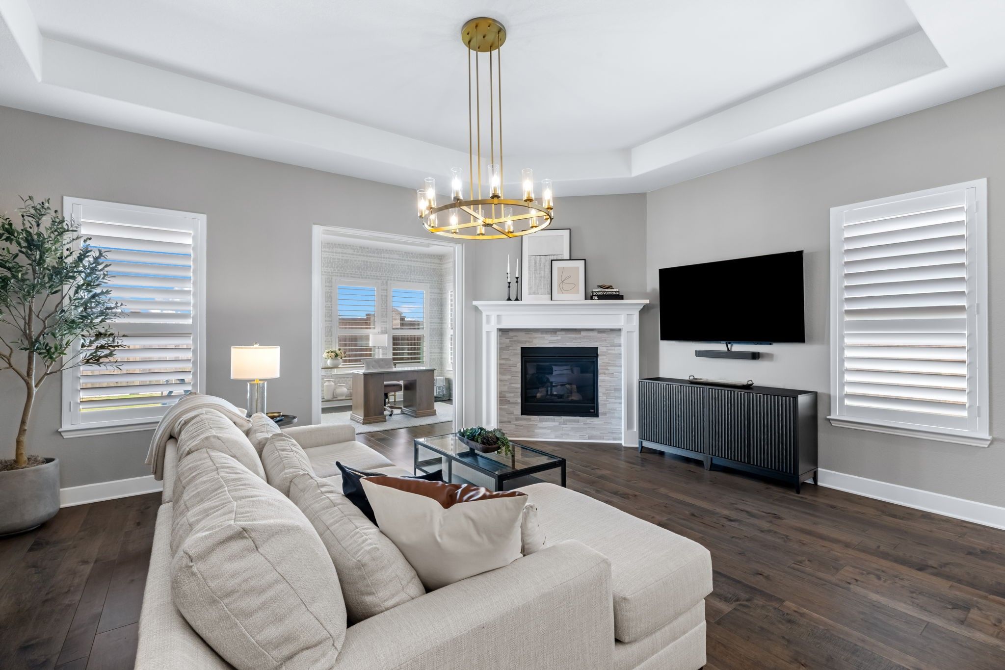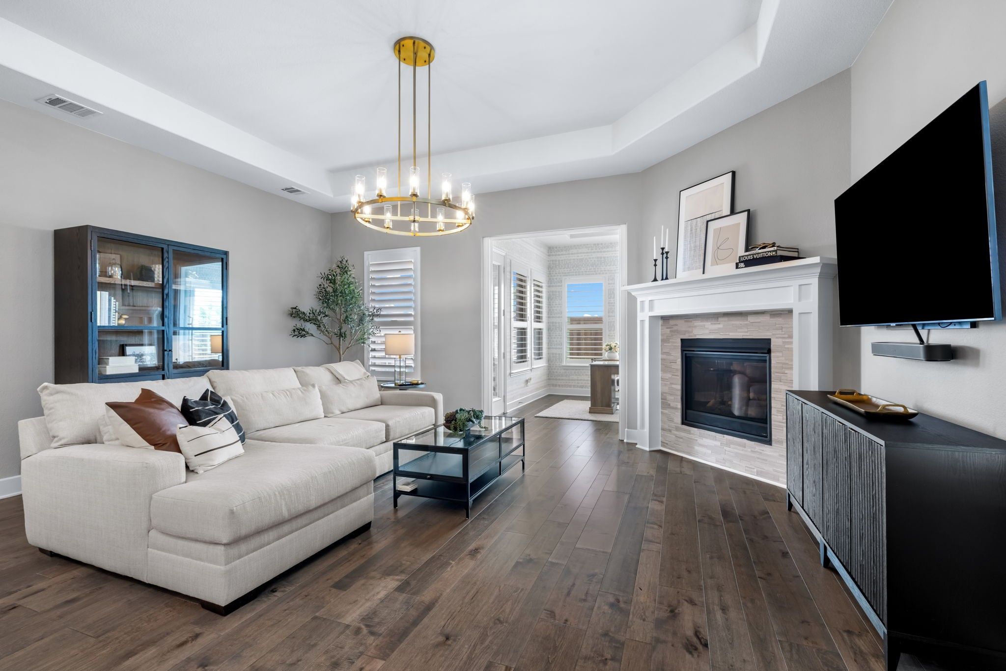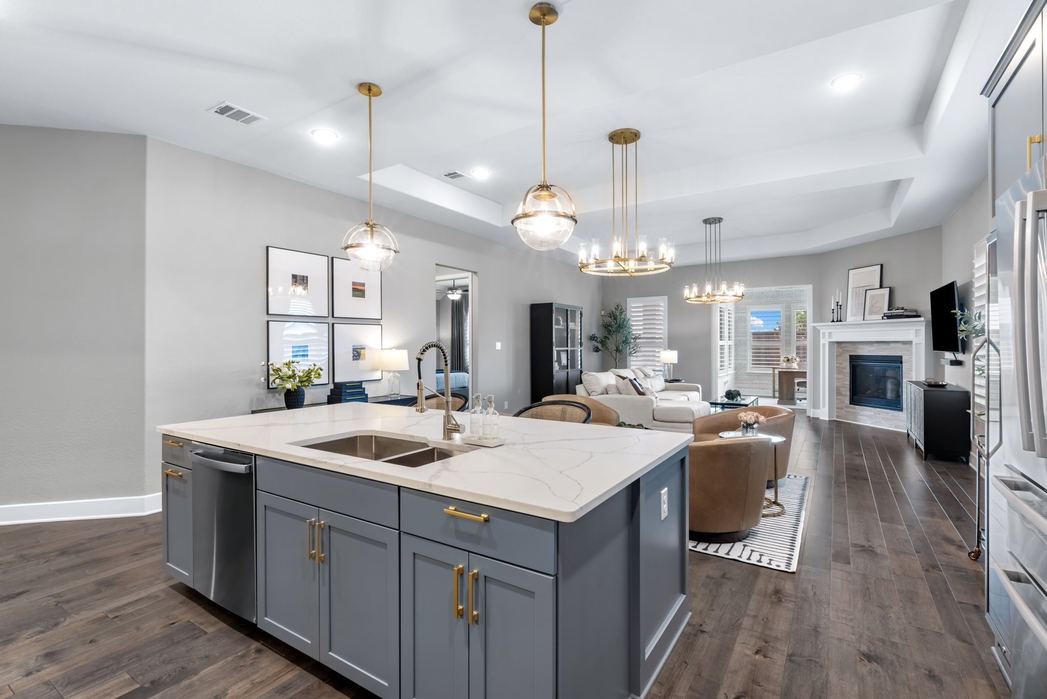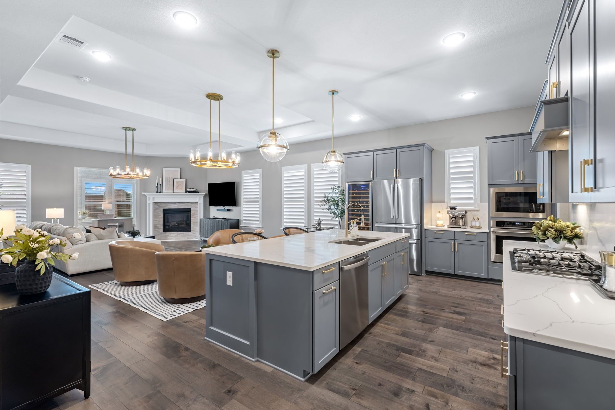 Pristine one-story Taylor Morrison home in the highly sought-after Tribute community, located in the Waterford Point section! This beautifully maintained home offers 2 bedrooms, 2 baths, and a versatile sunroom perfect for an office or additional living space. Stunning lush landscaping welcomes you and sets the tone for this thoughtfully upgraded home. Inside, you'll find engineered hardwoods and plantation shutters throughout, along with a spacious open floorplan designed for comfortable living and entertaining. The kitchen is a standout feature with customized cabinetry, quartz countertops and backsplash, a Texas-sized island, and a 6-foot built-in wine fridge. The living area flows seamlessly to the dining space and sunroom, creating a bright and inviting atmosphere. The split-bedroom layout offers added privacy with a sliding door separation. The primary suite features an oversized shower and beautifully updated bath with quartz finishes. A built-in Murphy bed with shelving provides flexible space for guests or multi-use needs. Enjoy outdoor living on the large covered patio, complete with 8-foot board-on-board fencing for added privacy. The extended garage includes an extra 4 feet of length and built-in cabinets for excellent storage. Garage with storage and attic lift! Residents of Waterford Point enjoy exclusive access to a private clubhouse, fitness center, and pool overlooking Lake Lewisville. The Tribute offers 10+ miles of nature trails, multiple resort-style pools, playgrounds, dog park, and two award-winning golf courses. Ideally located near Prestwick STEM Academy and Strike Middle School with nearby athletic facilities. This beautifully upgraded home offers comfort, style, and resort-style living in one of the area's premier communities.