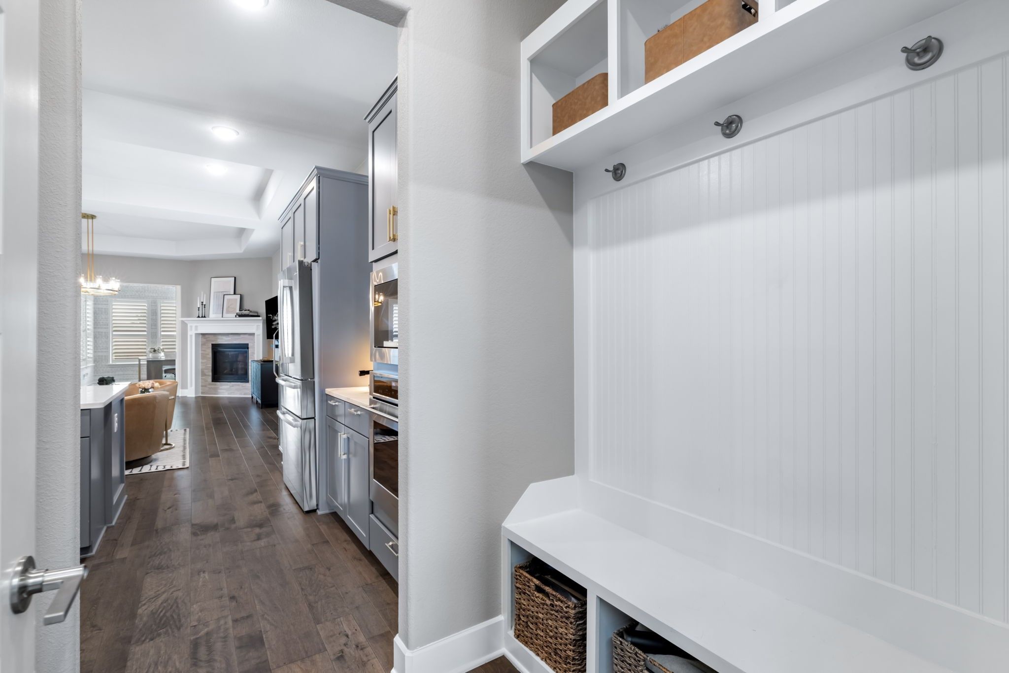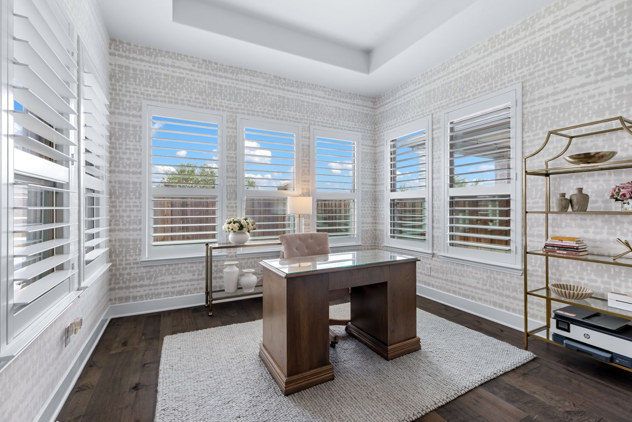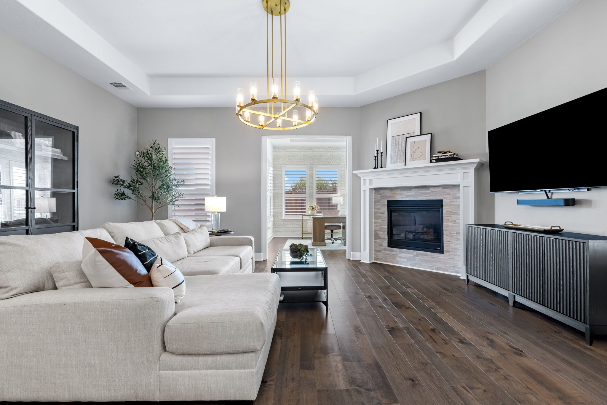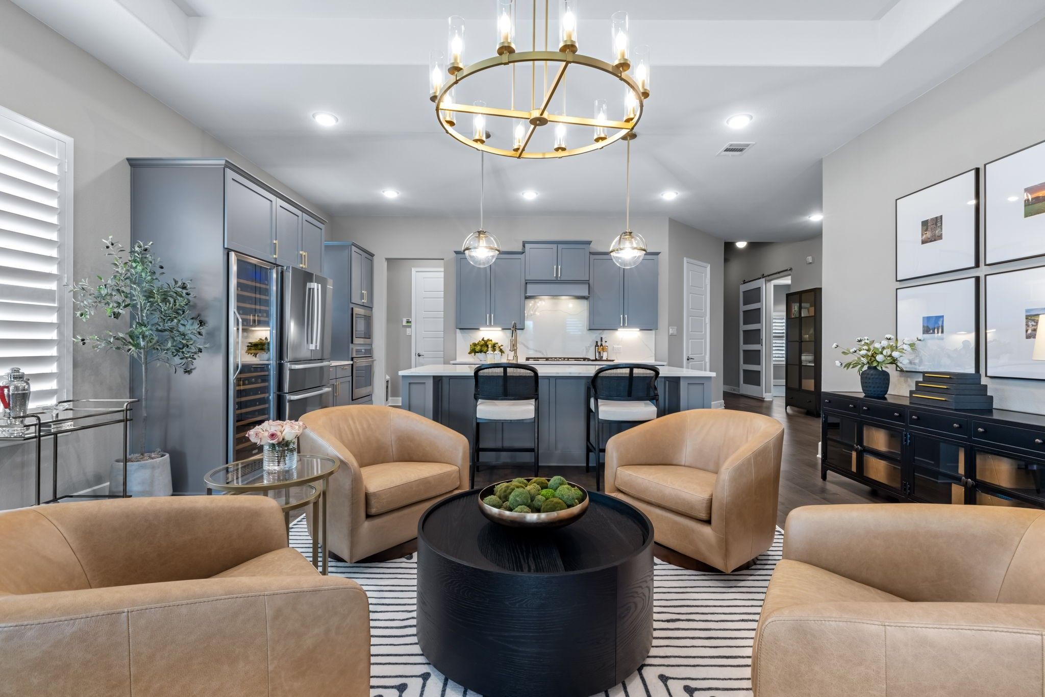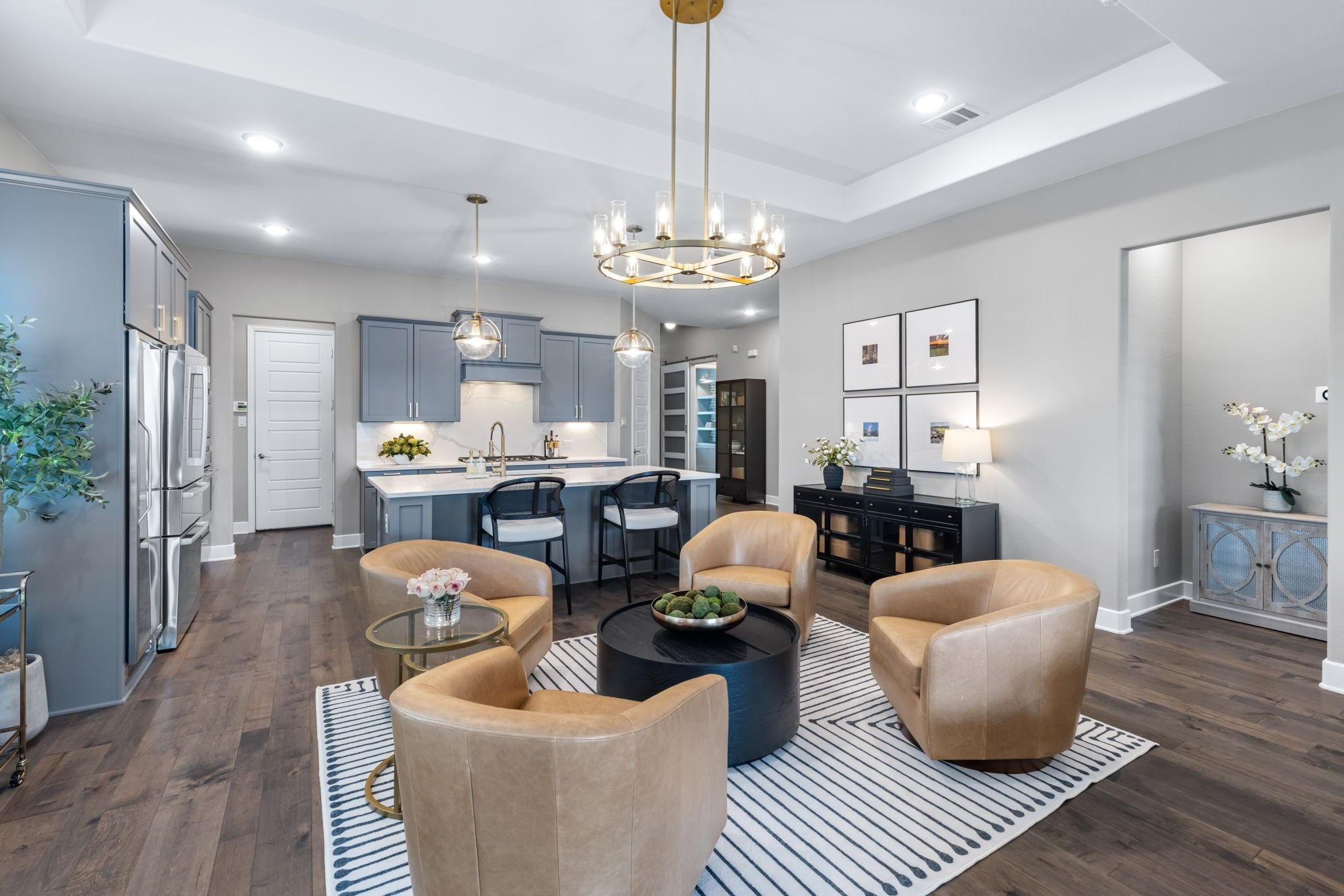 Pristine one-story Taylor Morrison home in the highly sought-after Tribute community, located in the Waterford Point section! This beautifully maintained home offers 2 bedrooms, 2 baths, and a versatile sunroom perfect for an office or additional living space. Stunning lush landscaping welcomes you and sets the tone for this thoughtfully upgraded home. Inside, you'll find engineered hardwoods and plantation shutters throughout, along with a spacious open floorplan designed for comfortable living and entertaining. The kitchen is a standout feature with customized cabinetry, quartz countertops and backsplash, a Texas-sized island, and a 6-foot built-in wine fridge. The living area flows seamlessly to the dining space and sunroom, creating a bright and inviting atmosphere. The split-bedroom layout offers added privacy with a sliding door separation. The primary suite features an oversized shower and beautifully updated bath with quartz finishes. A built-in Murphy bed with shelving provides flexible space for guests or multi-use needs. Enjoy outdoor living on the large covered patio, complete with 8-foot board-on-board fencing for added privacy. The extended garage includes an extra 4 feet of length and built-in cabinets for excellent storage. Garage with storage and attic lift! Residents of Waterford Point enjoy exclusive access to a private clubhouse, fitness center, and pool overlooking Lake Lewisville. The Tribute offers 10+ miles of nature trails, multiple resort-style pools, playgrounds, dog park, and two award-winning golf courses. Ideally located near Prestwick STEM Academy and Strike Middle School with nearby athletic facilities. This beautifully upgraded home offers comfort, style, and resort-style living in one of the area's premier communities.