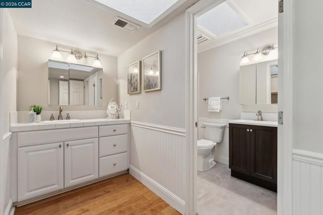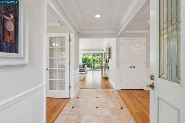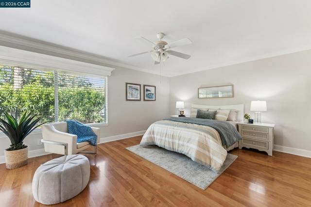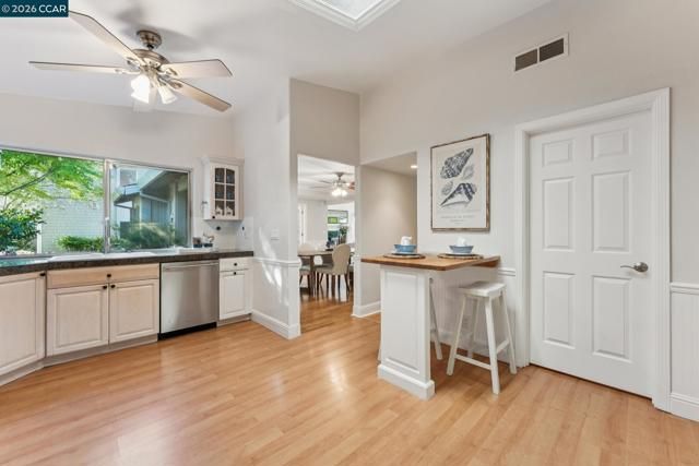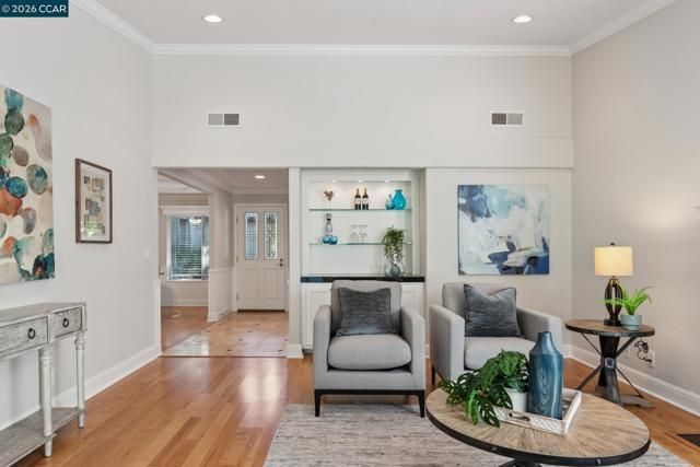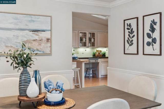 Located in Rossmoor, this updated single-level Whitney model offers bright, low-maintenance living in a premier 55+ Walnut Creek community. As a light-filled end unit, it features vaulted ceilings, expansive windows, and a cozy fireplace, plus a versatile den ideal for an office or guest space. The kitchen with skylight opens to a formal dining area, while the primary suite includes an en suite bath and a second bedroom sits near a hall bath. Enjoy a private patio with greenbelt views, the rare convenience of an attached two-car garage, and access to golf, swimming, fitness, and more—just minutes from downtown Walnut Creek and BART.