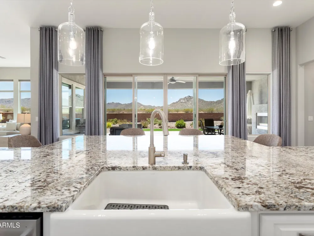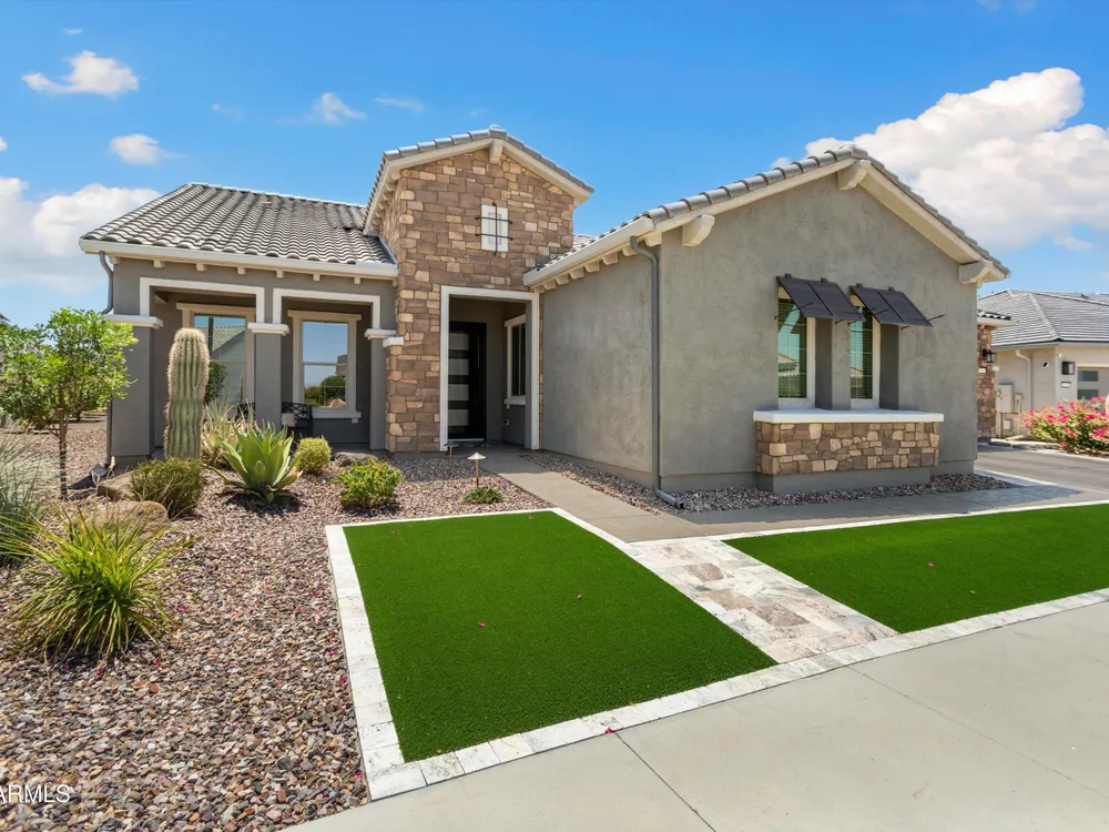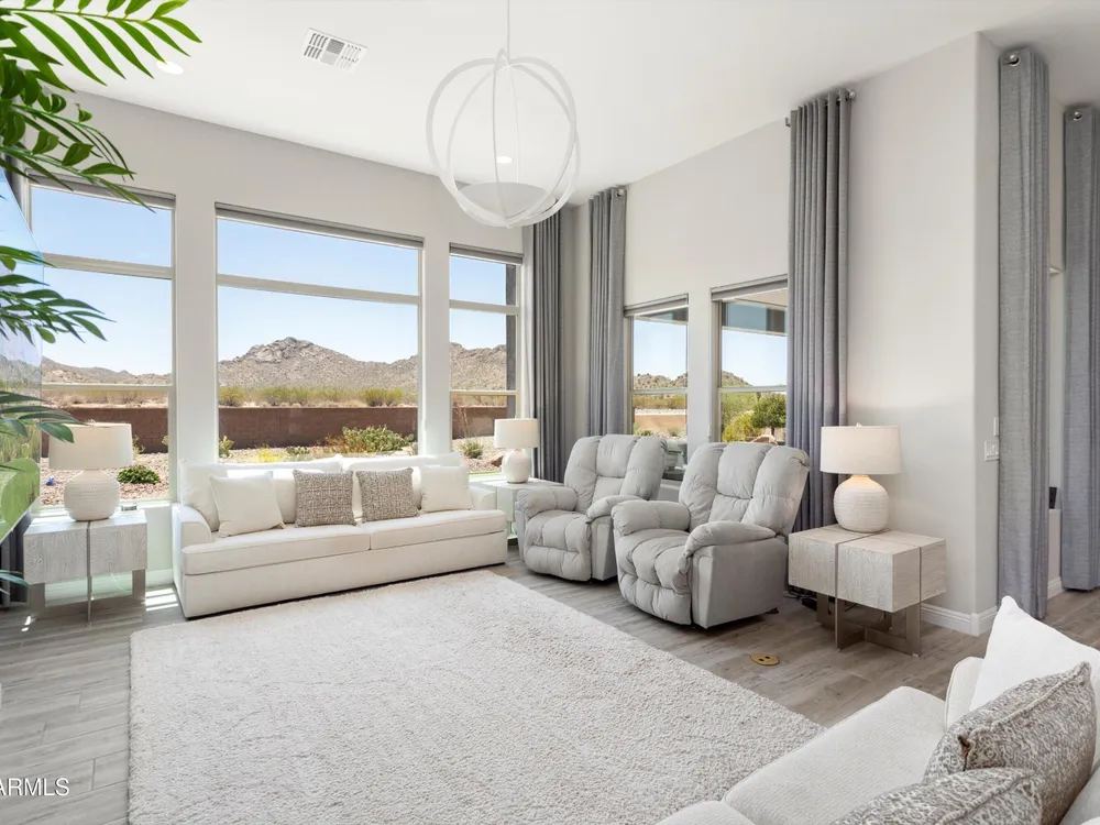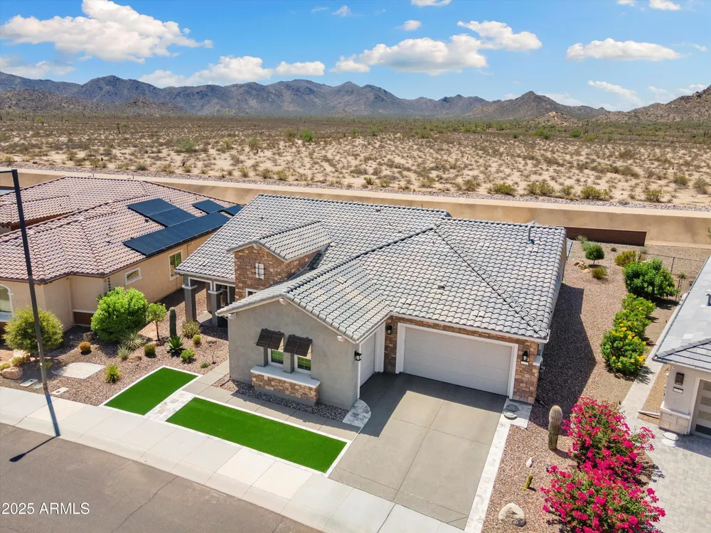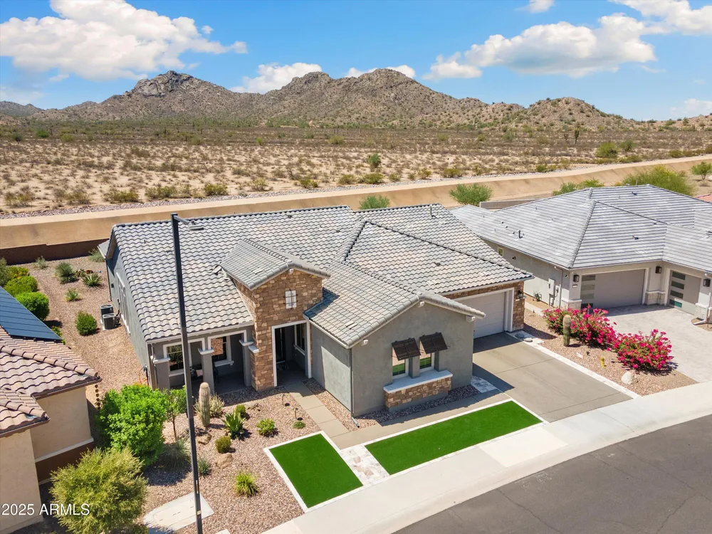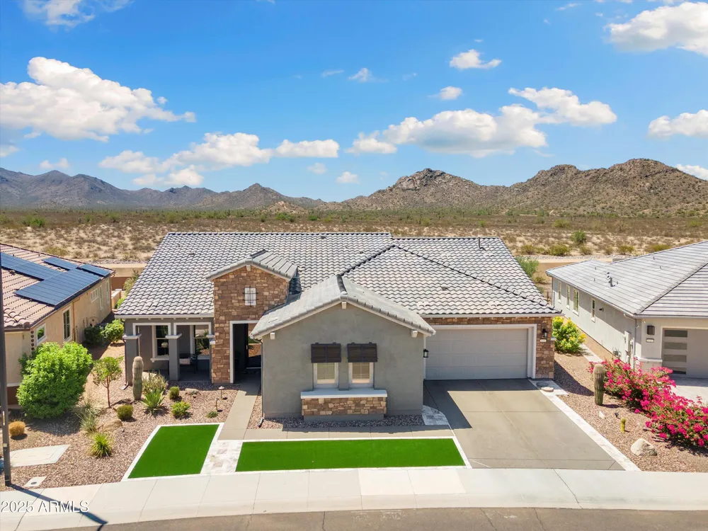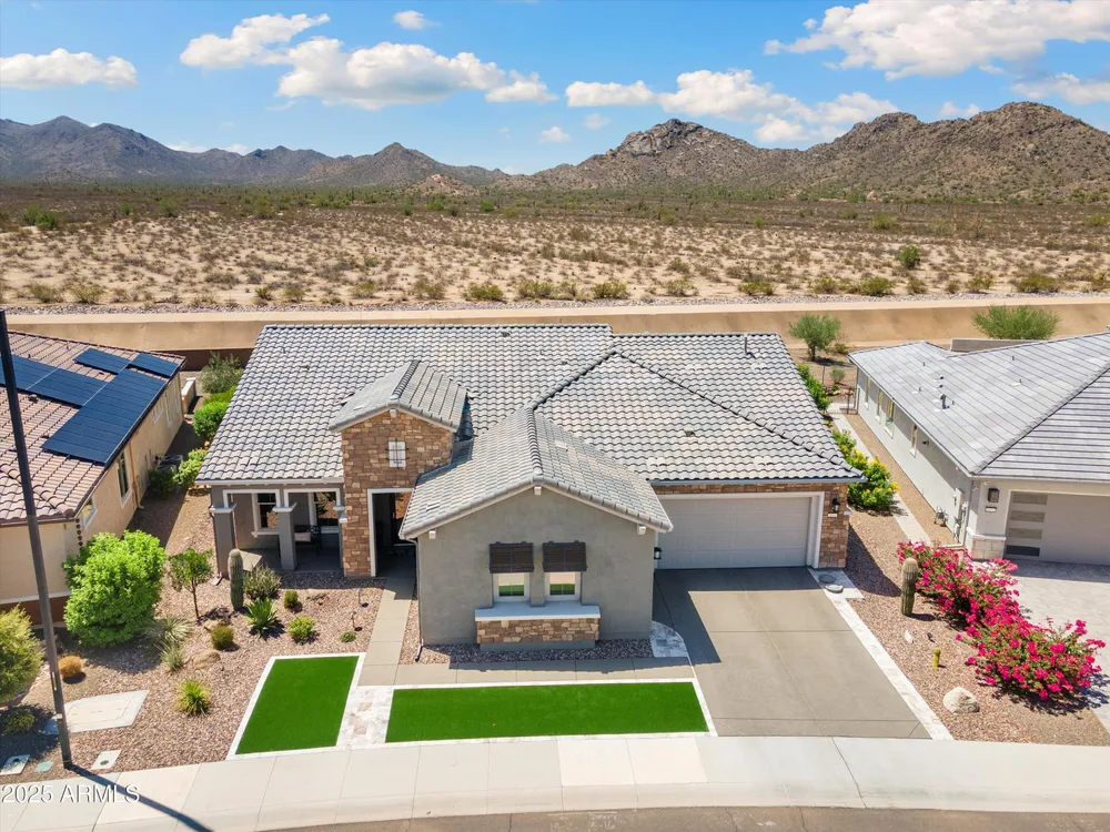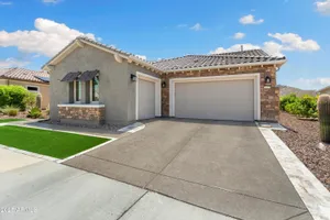 EXPERIENCE THE PINNACLE OF SUN CITY FESTIVAL LIVING. THIS ESTATE SERIES HOME IS NESTLED ON A PREMIUM LOT WITH UNPARELLELED PANORMIC DESERT VIEWS AND MOUNTAIN VISTAS. Step inside to this spacious, open concept floorplan w/soaring ceilings. Walls of windows throughout the main living areas flood the home with natural light and frame the dramatic landscape. The chef's kitchen is thoughtfully appointed w/an executive island, modern quartz counters, pendant lighting & lux culinary cabinet layout. This design seamlessly flows into the expansive gathering space & dining area. The primary suite is a spacious retreat, complete w/luxurious bath. The 2 additional ensuite bedrooms are perfect for visitors. Step outside to this amazing mountain-view sanctuary, ideal for entertainment or relaxation!
