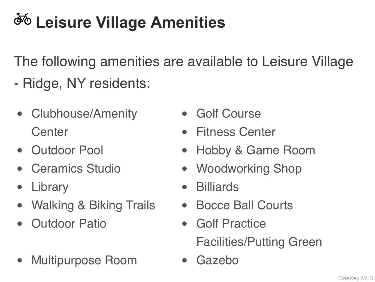 The following amenities are available to Leisure Village - Ridge, NY residents:
