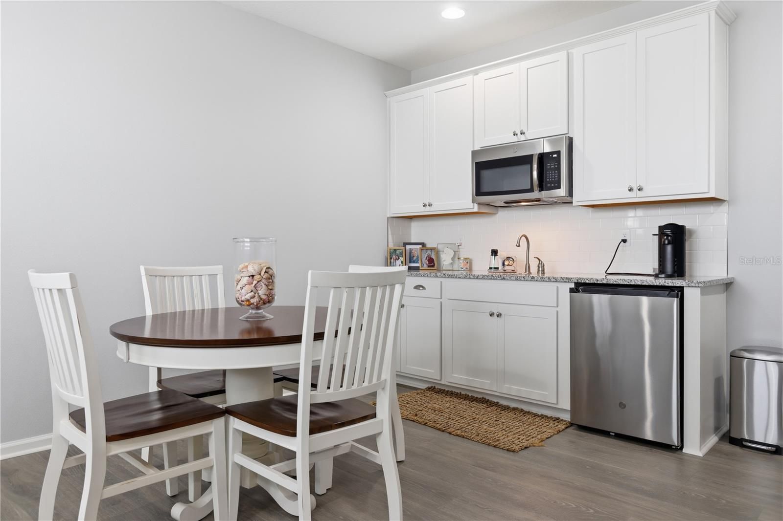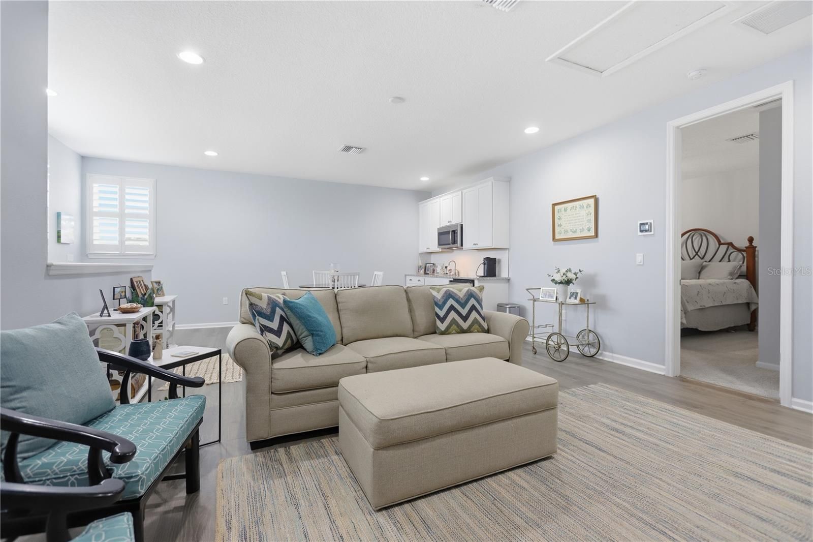 VICTORIA GARDENS BEAUTY! Look no further—this upgraded and immaculate Lily model with bonus in-law suite has everything you’re looking for and more. Thoughtfully selected structural and design upgrades during the original build make this home both beautiful and a solid investment. As you enter, you’ll immediately notice the new luxury vinyl flooring throughout the main living areas. The first floor features a guest bedroom and full bathroom, along with a gourmet kitchen offering abundant cabinet space, granite countertops, tile backsplash, breakfast bar island, gas range, and stainless steel appliances—all open to the great room and dining area, creating the perfect space for entertaining. The spacious primary suite includes dual vanities, a walk-in shower, and a walk-in closet, with peaceful views of the water feature behind the home. Upstairs you’ll find a private in-law suite, ideal for extended family or a college student. This space features a 16x16 living room with kitchenette, dinette area, large bedroom, and private bath with walk-in shower. Relax and unwind outdoors on the brick-paver patio overlooking the tranquil water feature—perfect for enjoying your morning coffee or evening beverage. This home truly has so much to offer. Come take a look… you may never want to leave!