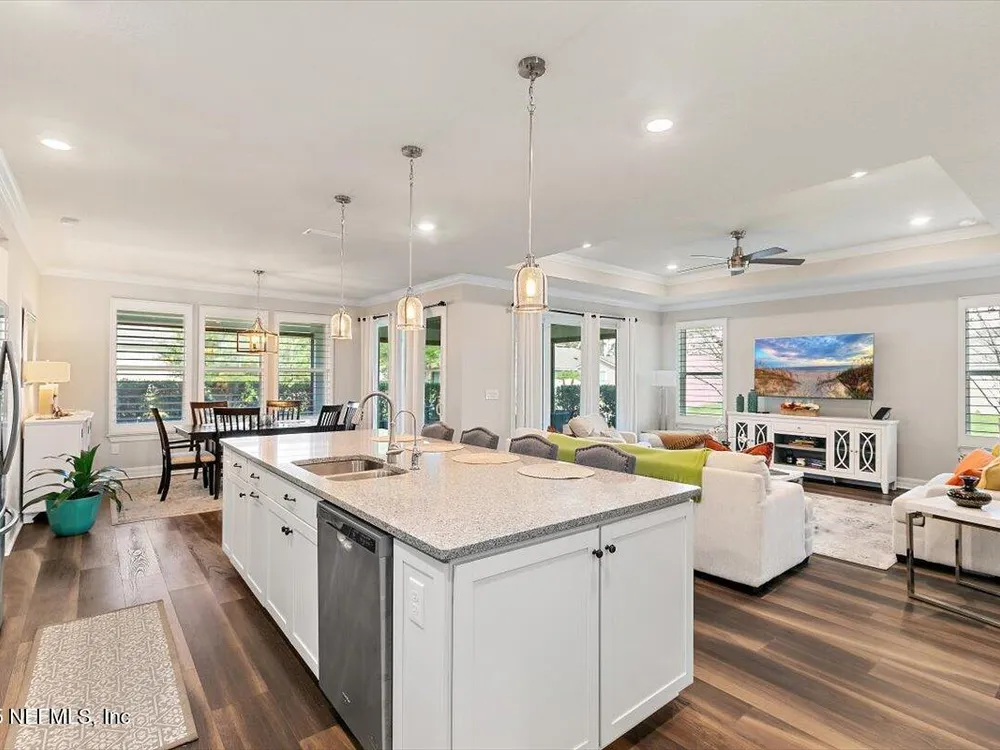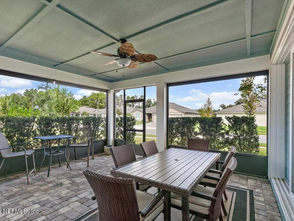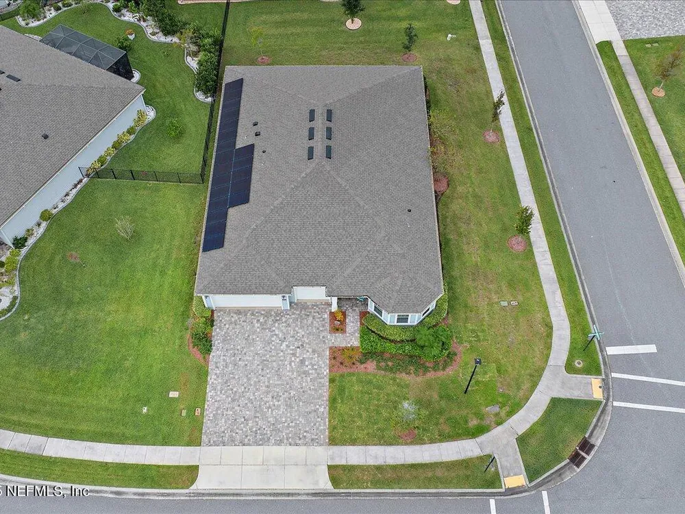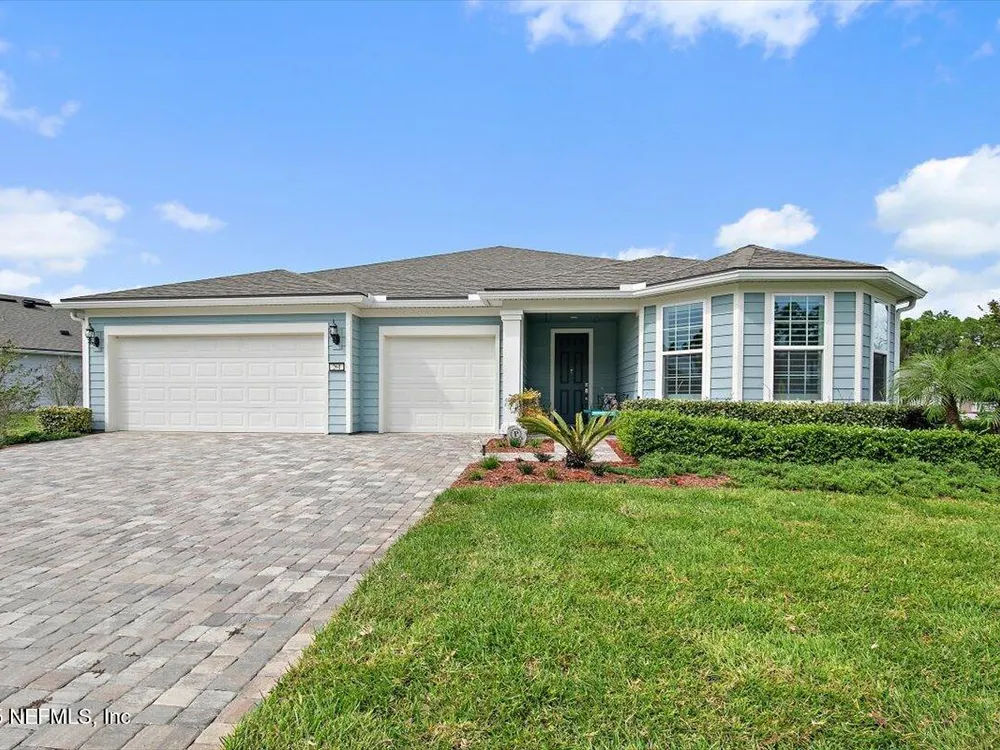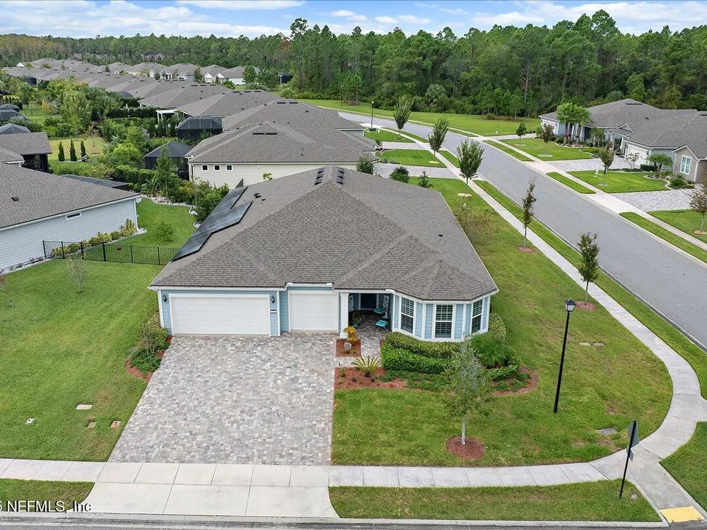 Welcome to the highly sought after Renown model. This spacious single-story home features 3 bedrooms, 3.5 bathrooms, a flex room (possible 4th bedroom) & an oversized 3-car garage. The gourmet kitchen with stainless steel appliances, a large center island & abundant cabinets, seamlessly connected to the spacious great room & inviting dining area, perfect for hosting. Sliding glass doors open to an expansive screened and covered lanai, perfect for unwinding. The luxurious owner's suite includes a spa-inspired bathroom, walk-in shower, dual vanities, and two large walk-in closets. Each guest bedroom features its own private full bathroom, offering exceptional comfort and privacy. The flex room can serve as an office or 4th bedroom. Premium features and upgrades include solar panels, typical electric bill under $50 per month, water softener, an electric vehicle charging station & whole house surge protector. This gorgeous move-in ready home offers space, style & unmatched value. see mor Del Webb Nocatee, the newest 55+ community where luxury living meets unparalleled amenities including: resort pools, spa tub, pickle ball (over 300 members), tennis, bocce, billiards, a full service restaurant and bar, ballroom, fitness center, community garden, kayak launch to the intracoastal etc. If that is not enough, you can enjoy all that the community of Nocatee has to offer just a few miles away on golf cart paths, including waterparks, concerts, food trucks, restaurants and shopping.