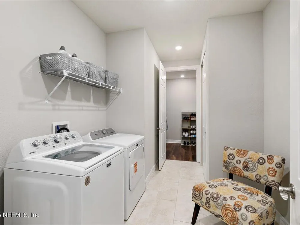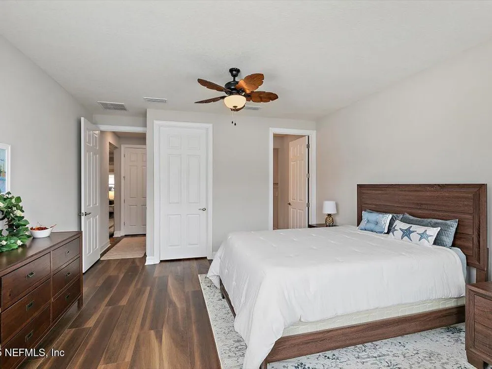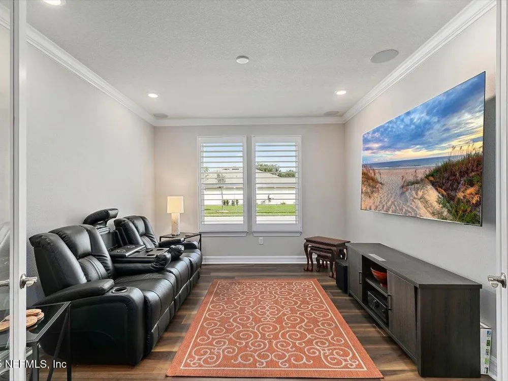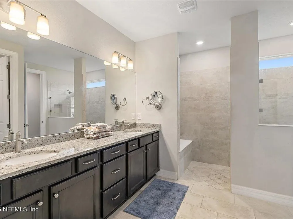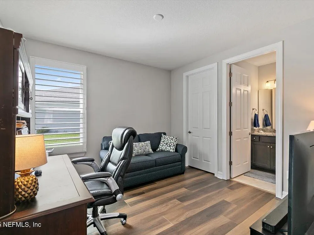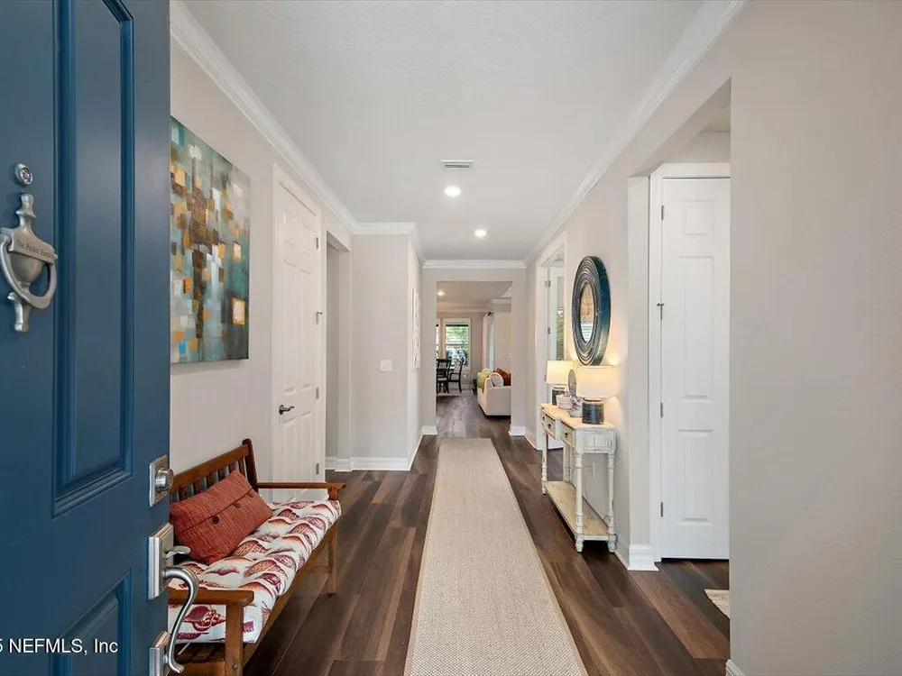 Welcome to the highly sought after Renown model. This spacious single-story home features 3 bedrooms, 3.5 bathrooms, a flex room (possible 4th bedroom) & an oversized 3-car garage. The gourmet kitchen with stainless steel appliances, a large center island & abundant cabinets, seamlessly connected to the spacious great room & inviting dining area, perfect for hosting. Sliding glass doors open to an expansive screened and covered lanai, perfect for unwinding. The luxurious owner's suite includes a spa-inspired bathroom, walk-in shower, dual vanities, and two large walk-in closets. Each guest bedroom features its own private full bathroom, offering exceptional comfort and privacy. The flex room can serve as an office or 4th bedroom. Premium features and upgrades include solar panels, typical electric bill under $50 per month, water softener, an electric vehicle charging station & whole house surge protector. This gorgeous move-in ready home offers space, style & unmatched value. see mor Del Webb Nocatee, the newest 55+ community where luxury living meets unparalleled amenities including: resort pools, spa tub, pickle ball (over 300 members), tennis, bocce, billiards, a full service restaurant and bar, ballroom, fitness center, community garden, kayak launch to the intracoastal etc. If that is not enough, you can enjoy all that the community of Nocatee has to offer just a few miles away on golf cart paths, including waterparks, concerts, food trucks, restaurants and shopping.