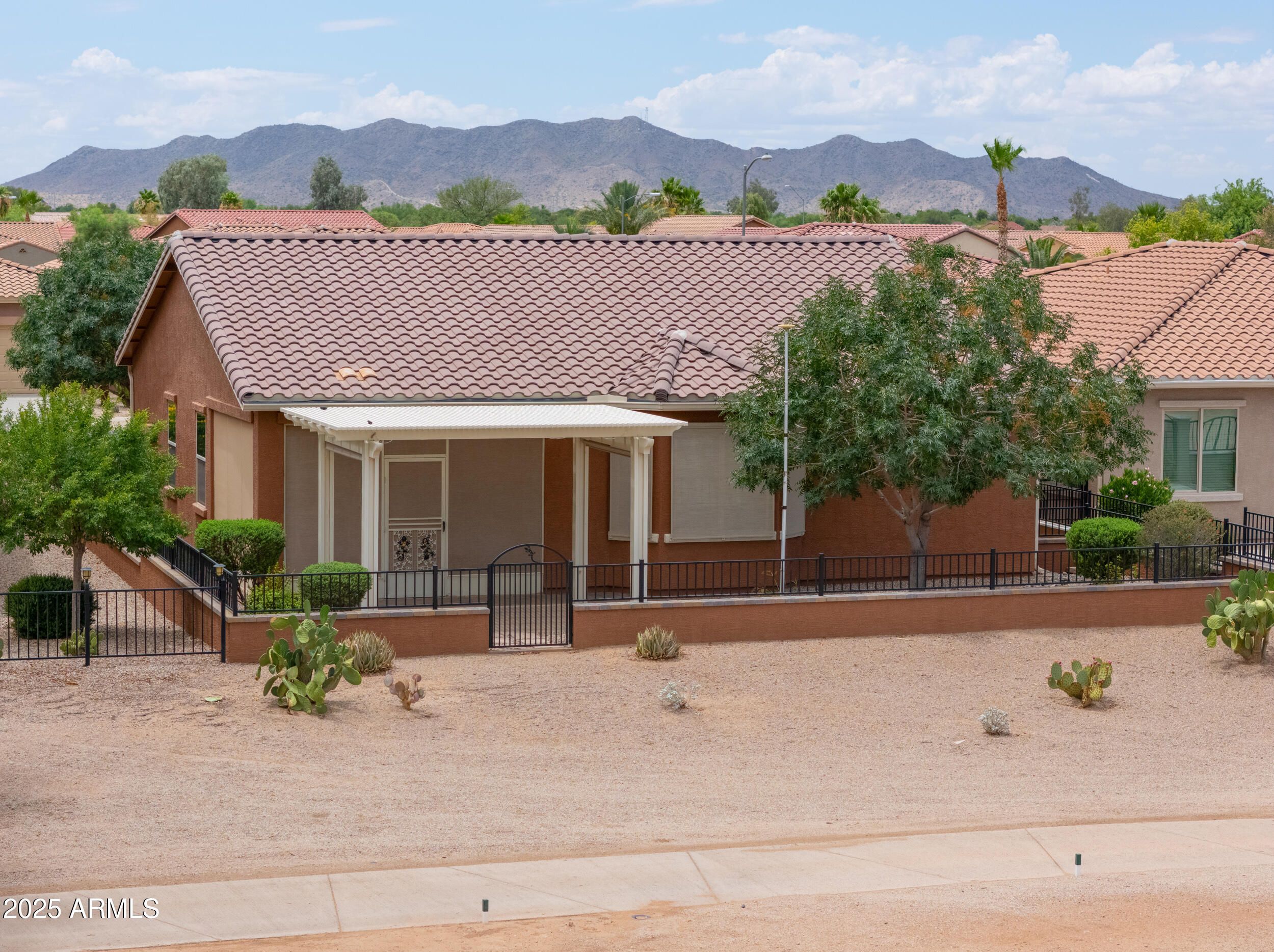 This 2 Bd 2Ba home features a Den, Golf Cart Garage & is situated just off of the 6th Fairway in Mission Royale Active Adult Golf Course Community. Inside, you'll find many custom features including tile flooring & paint throughout, custom interior & security doors as well as plantation shutters & ceiling fans for year-round comfort. The kitchen is a showstopper w/granite countertops, SS appliances including a double oven & staggered cabinetry. The center island offers additional space for prepping & storage. The primary suite is designed for relaxation w/a large walk in closet, dual sink vanity, private toilet room & stunning walk in shower. The extended garage is complete w/work bench, home water filtration & garage screen. Enjoy Arizona living at its finest w/ an Arizona room & a covered patio overlooking the fenced backyard & picturesque golf course. Mature landscaping & N/S exposure add to the home's appeal. Just a short distance away from the Club House, you wont want to miss all of the activities that Mission Royale has to offer. Two heated swimming pools, hot tub, gym, billiards room, pickleball, activity rooms & so much more!