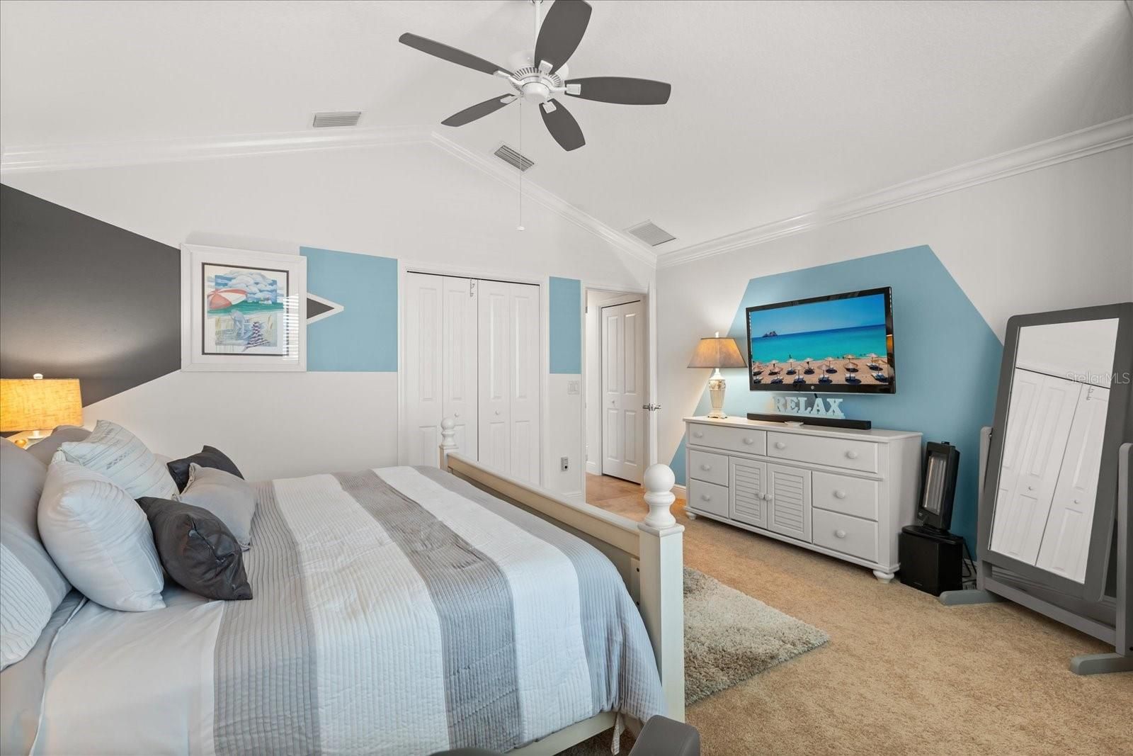- Ceiling Fan(s), Crown Molding, Dry Bar, Eat-in Kitchen, High Ceilings, Open Floorplan, Thermostat, Vaulted Ceiling(s), Walk-In Closet(s), Window Treatments