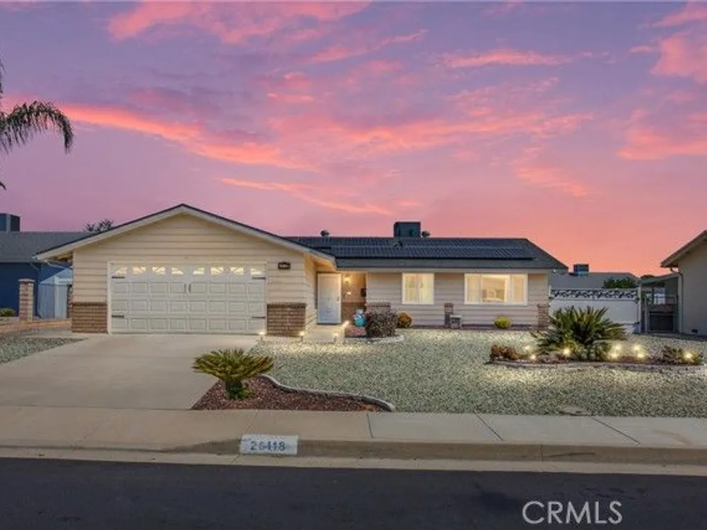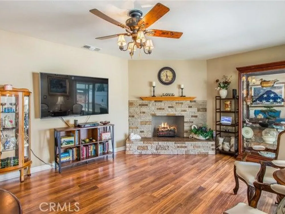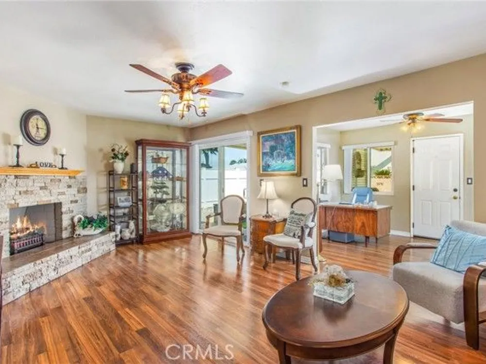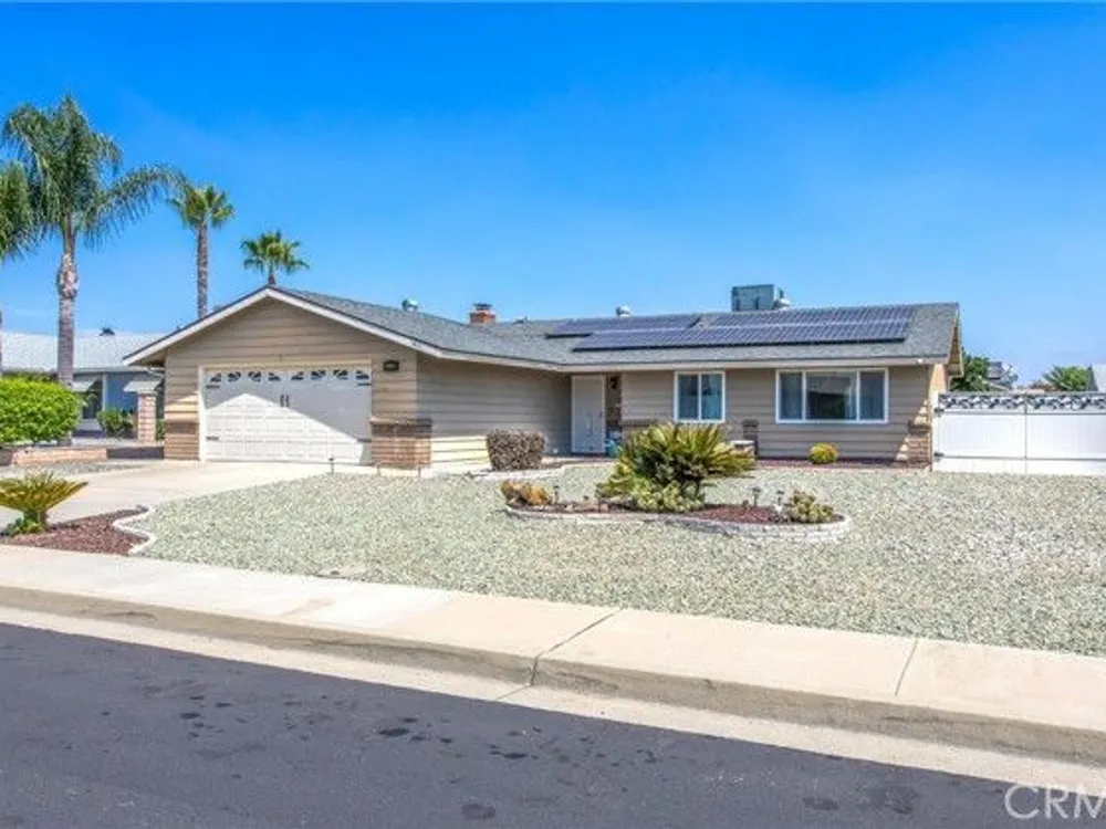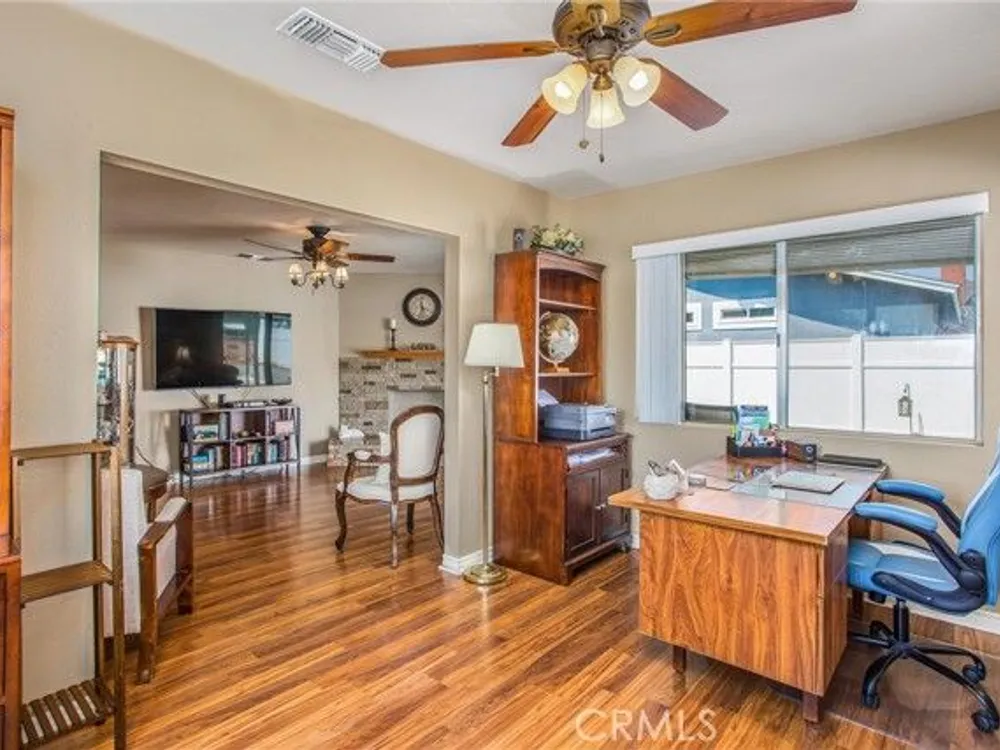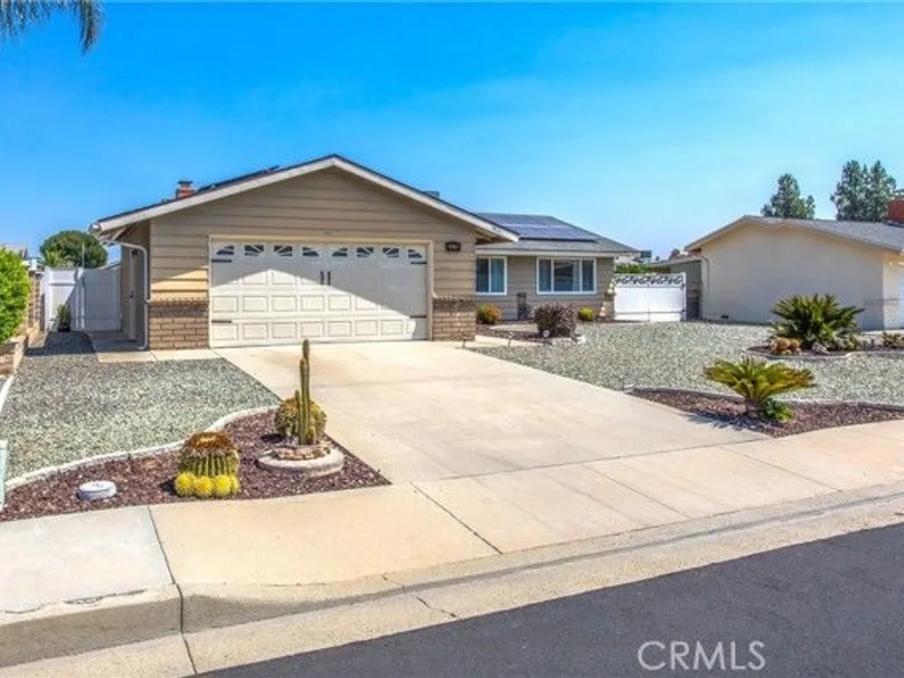 Located in the Sun City Civic Association, a 55+ active adult community, this single-story home offers a functional layout with thoughtful upgrades. Inside, the spacious kitchen sits at the front of the home and features neutral tile flooring, Corian countertops, a breakfast nook, a built-in pantry with pull-out drawers, and stainless steel appliances include a stove, microwave, and dishwasher. The family room is at the rear of the home and includes a ceiling fan, raised hearth flagstone fireplace with an electric insert, and nearby sliding glass doors that lead to the covered patio and backyard. Adjacent to the family room is a bonus room that’s currently used as an office, also with access to the rear patio. Neutral paint and laminate wood flooring run throughout the main living areas, and the thoughtful layout allows for plenty of natural light. There are three bedrooms down the hall including a spacious primary suite with a ceiling fan, recessed lighting, and an en-suite bathroom offering Corian counters and a walk-in shower. The two additional bedrooms also feature updated ceiling fans and share a nearby full bathroom also with a Corian vanity and a shower/tub combo. Additional features include a whole house water purification system, radiant heat barrier in the attic, whole house surge protector, air purifier, and a whole house fan. The roof and HVAC system were both replaced approximately five years ago, providing peace of mind and improved energy efficiency. The front and rear yards are both landscaped for low maintenance and water efficiency, with the backyard featuring a covered patio and sitting area. The clean epoxy flooring two-car garage provides extra storage space, laundry hookups, and the large side yard offers the potential for RV or golf cart parking. As part of the Sun City Civic Association, homeowners enjoy access to a wide range of community amenities including indoor shuffleboard courts, tournament horseshoe pits, a fitness center, two swimming pools, spa, lawn bowling, and a full calendar of clubs and social events. This home offers the ease of single-level living in a vibrant 55+ community designed for an active, social lifestyle, with the added convenience of nearby shopping and easy freeway access.