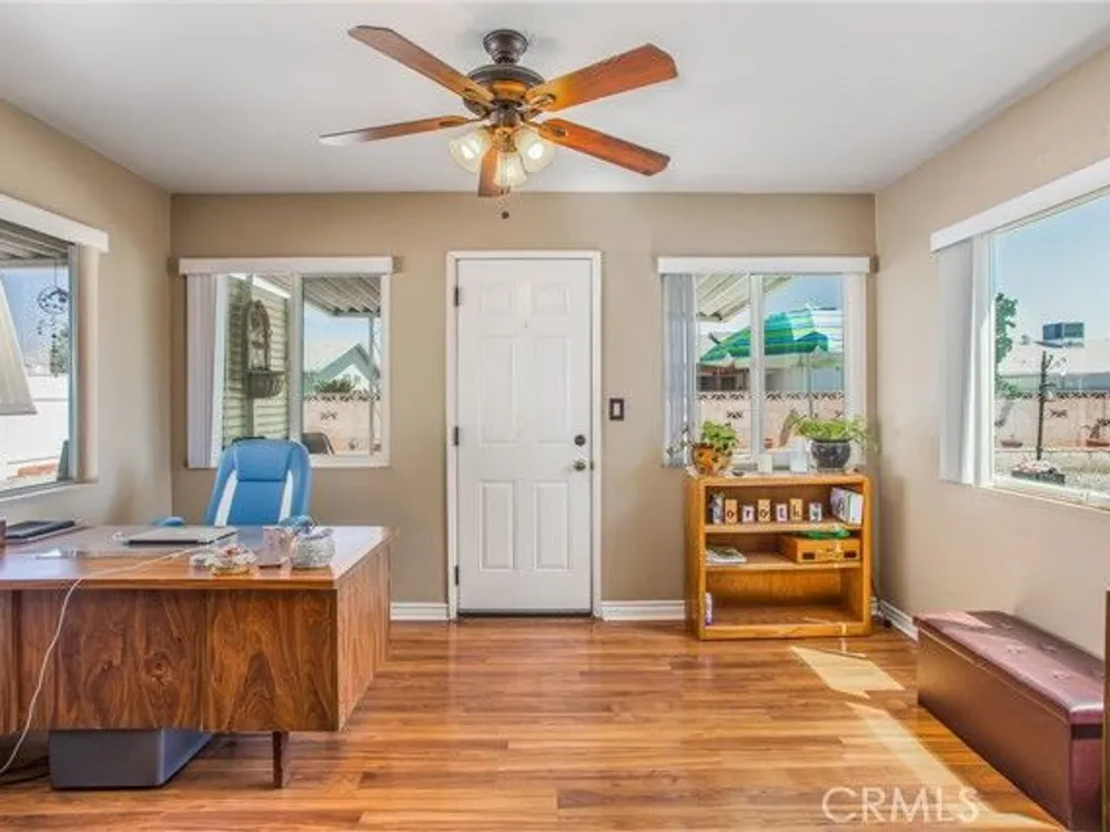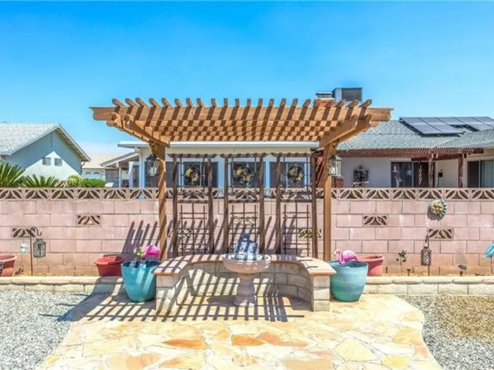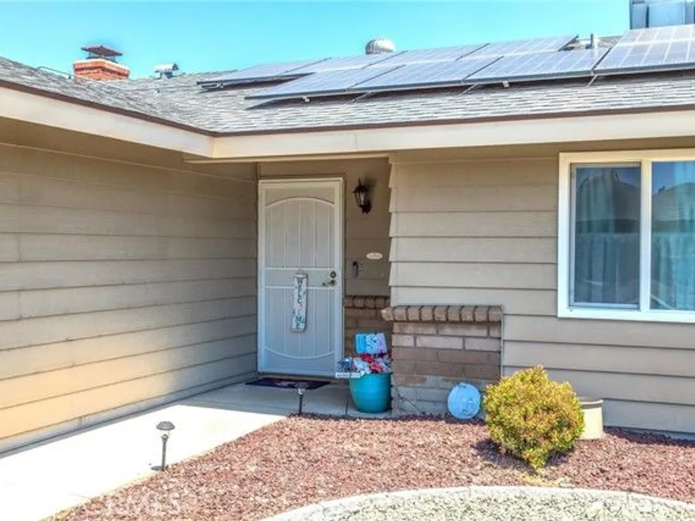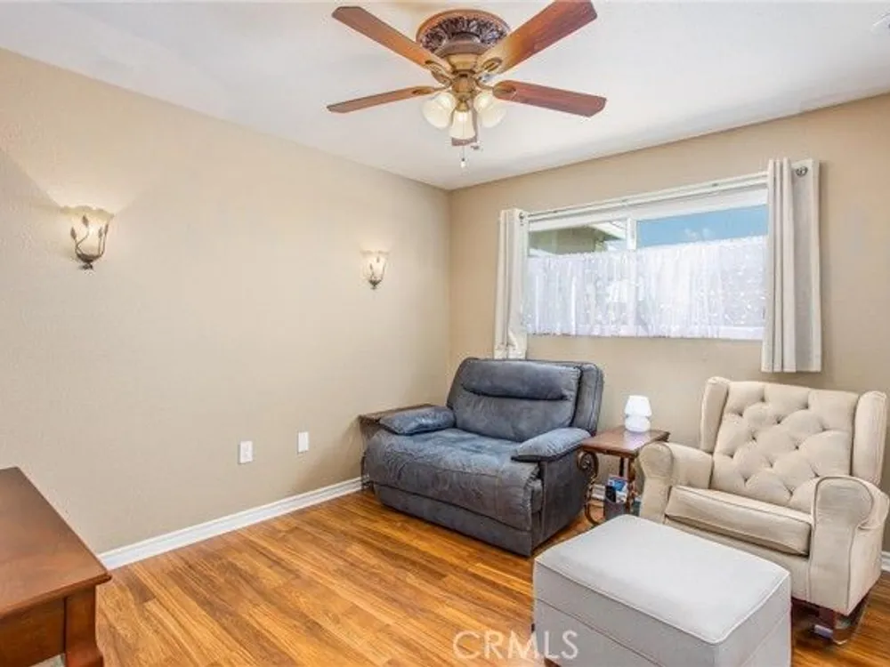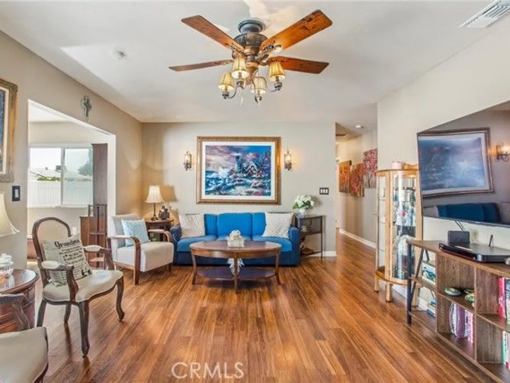 Located in the Sun City Civic Association, a 55+ active adult community, this single-story home offers a functional layout with thoughtful upgrades. Inside, the spacious kitchen sits at the front of the home and features neutral tile flooring, Corian countertops, a breakfast nook, a built-in pantry with pull-out drawers, and stainless steel appliances include a stove, microwave, and dishwasher. The family room is at the rear of the home and includes a ceiling fan, raised hearth flagstone fireplace with an electric insert, and nearby sliding glass doors that lead to the covered patio and backyard. Adjacent to the family room is a bonus room that’s currently used as an office, also with access to the rear patio. Neutral paint and laminate wood flooring run throughout the main living areas, and the thoughtful layout allows for plenty of natural light. There are three bedrooms down the hall including a spacious primary suite with a ceiling fan, recessed lighting, and an en-suite bathroom offering Corian counters and a walk-in shower. The two additional bedrooms also feature updated ceiling fans and share a nearby full bathroom also with a Corian vanity and a shower/tub combo. Additional features include a whole house water purification system, radiant heat barrier in the attic, whole house surge protector, air purifier, and a whole house fan. The roof and HVAC system were both replaced approximately five years ago, providing peace of mind and improved energy efficiency. The front and rear yards are both landscaped for low maintenance and water efficiency, with the backyard featuring a covered patio and sitting area. The clean epoxy flooring two-car garage provides extra storage space, laundry hookups, and the large side yard offers the potential for RV or golf cart parking. As part of the Sun City Civic Association, homeowners enjoy access to a wide range of community amenities including indoor shuffleboard courts, tournament horseshoe pits, a fitness center, two swimming pools, spa, lawn bowling, and a full calendar of clubs and social events. This home offers the ease of single-level living in a vibrant 55+ community designed for an active, social lifestyle, with the added convenience of nearby shopping and easy freeway access.