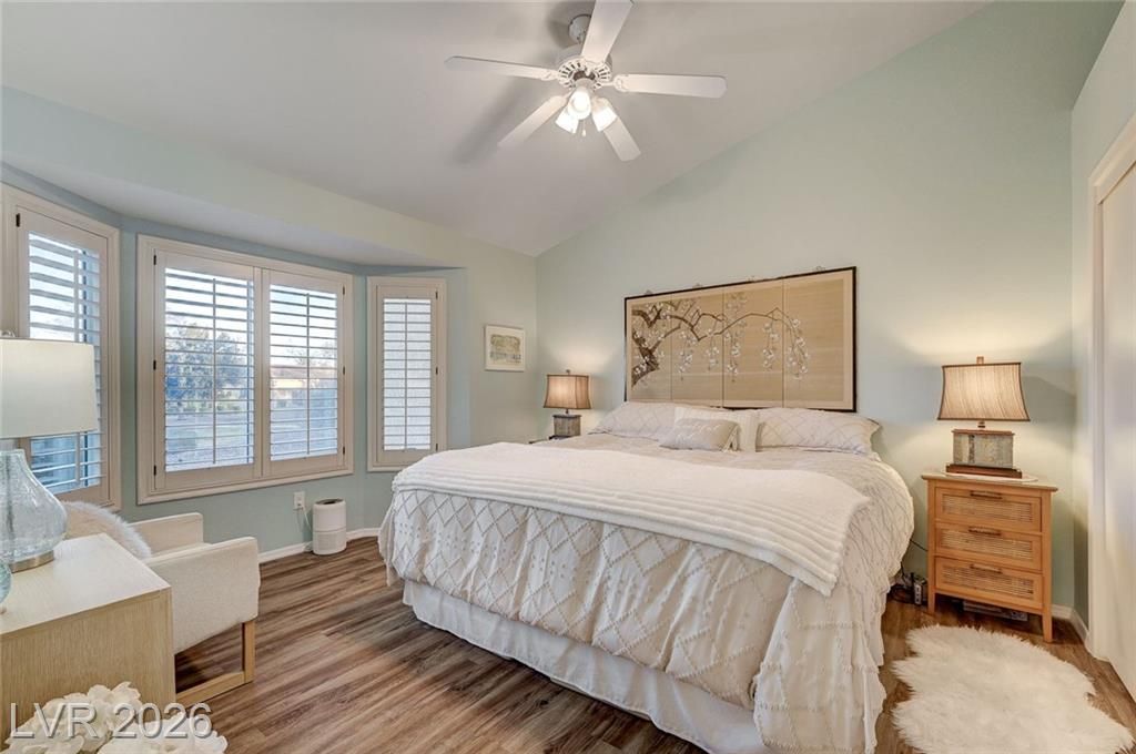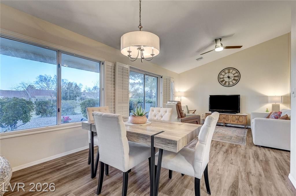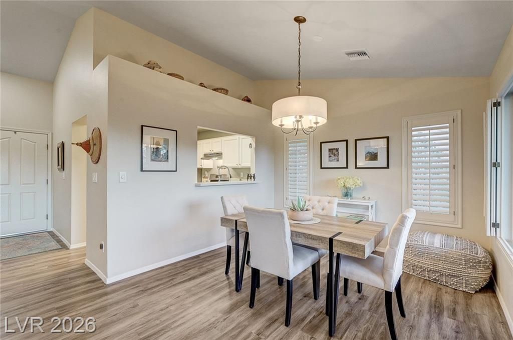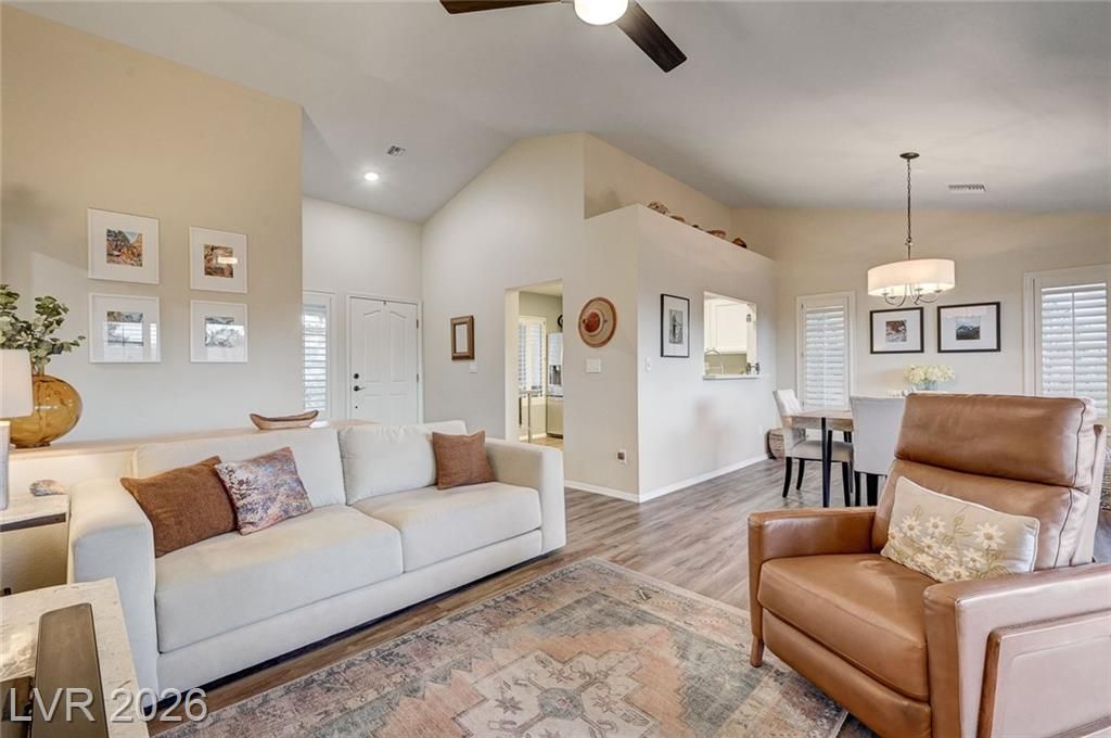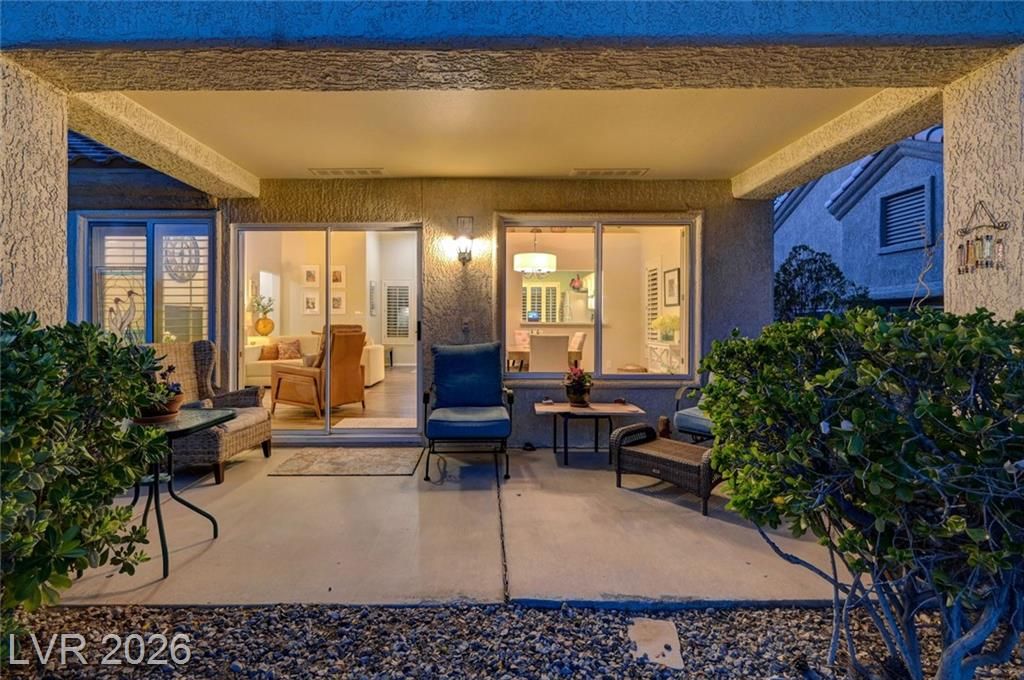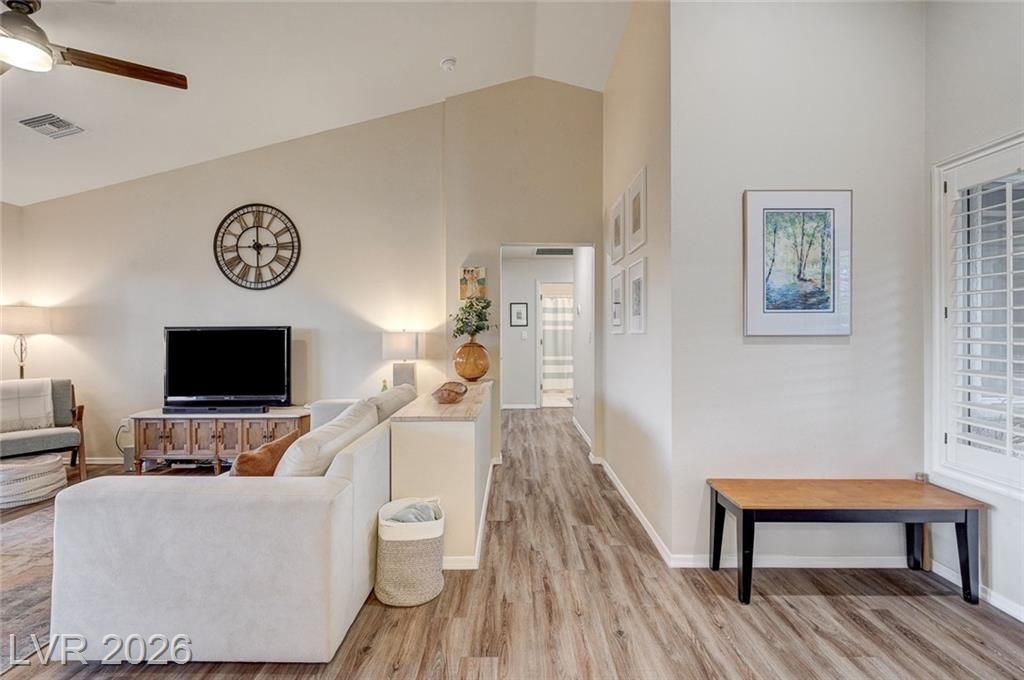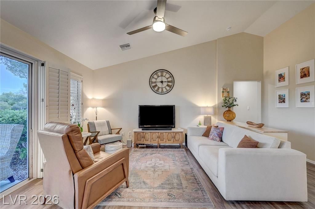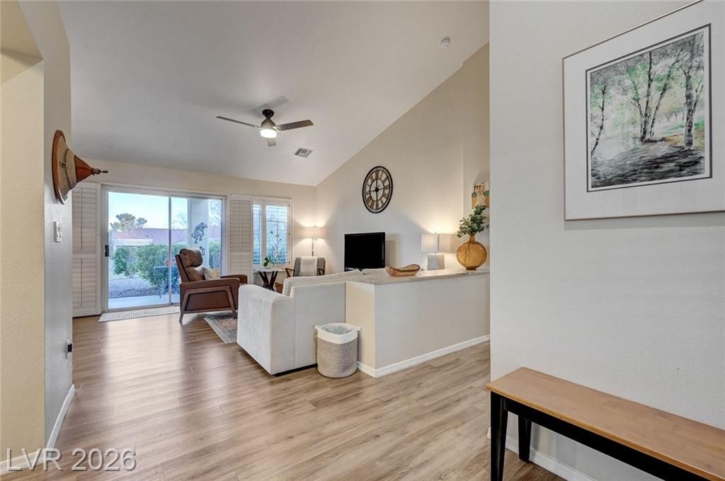 Charming and beautifully maintained home in the 55+ community of Sun City Summerlin. This 2 bedroom, 2 bath property is perfectly situated backing to a peaceful greenbelt, offering added privacy and serene views. A spacious front courtyard with desert landscaping creates a welcoming outdoor space perfect for relaxing or entertaining. Inside, the home features wood-like flooring, plantation shutters throughout, and a light, calming atmosphere that makes it feel instantly inviting. Thoughtfully cared for by the sellers, the home also includes a newer AC, water heater and dishwasher. Located in one of Summerlin’s premier active adult communities with access to golf, pools, fitness centers, social clubs, and more.