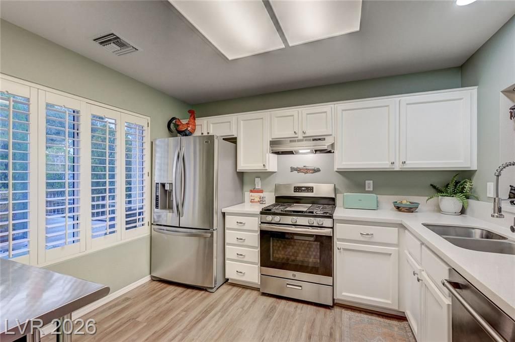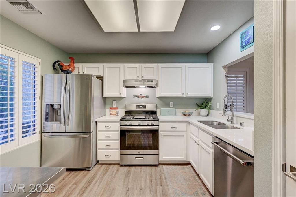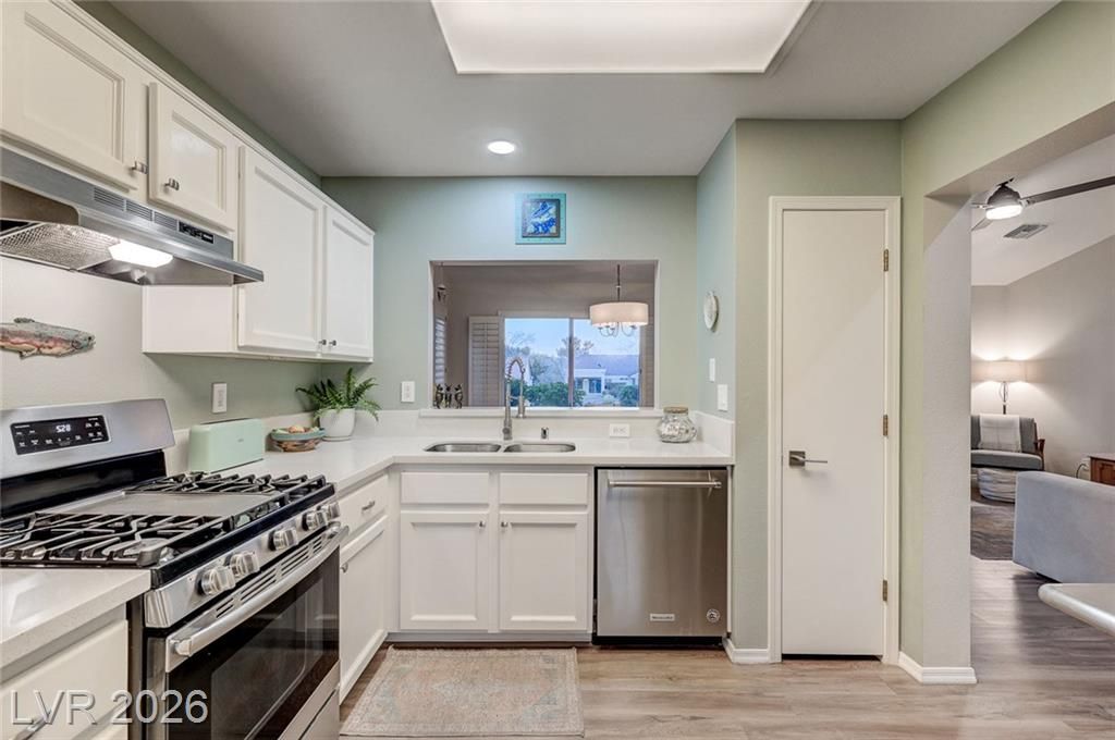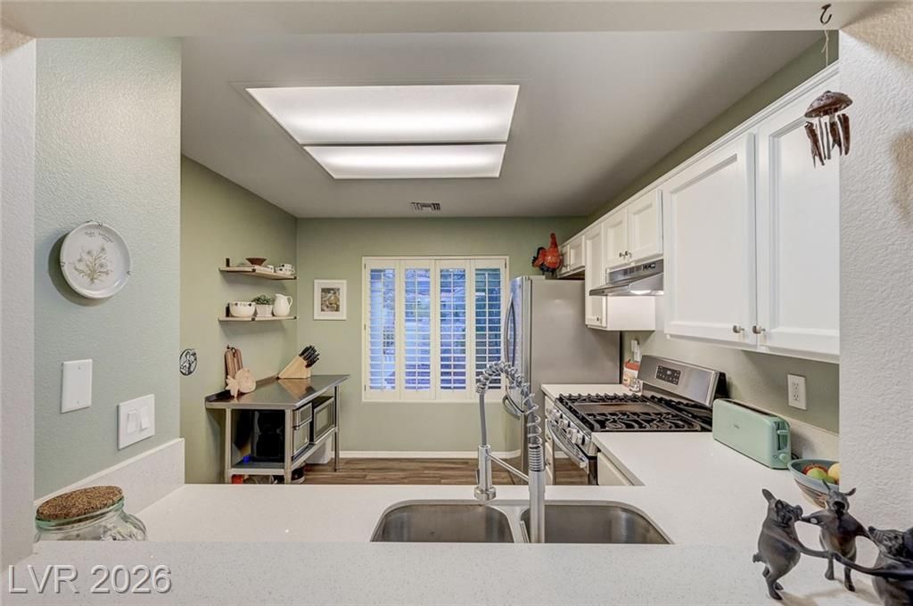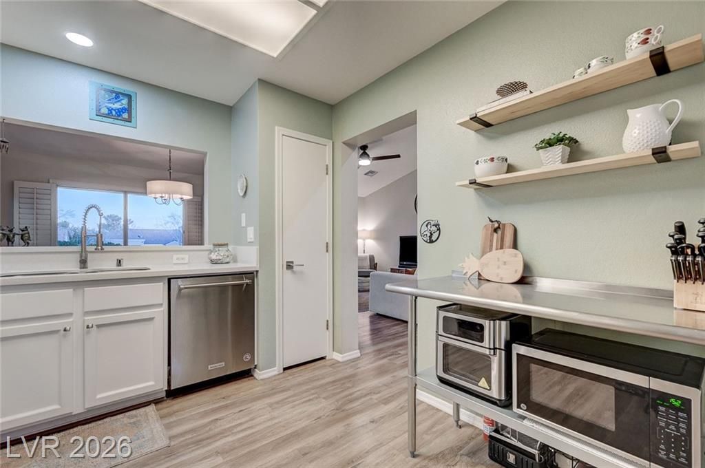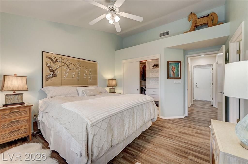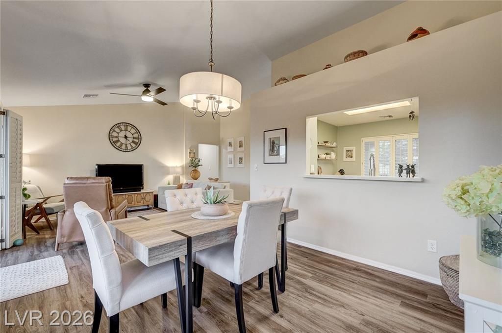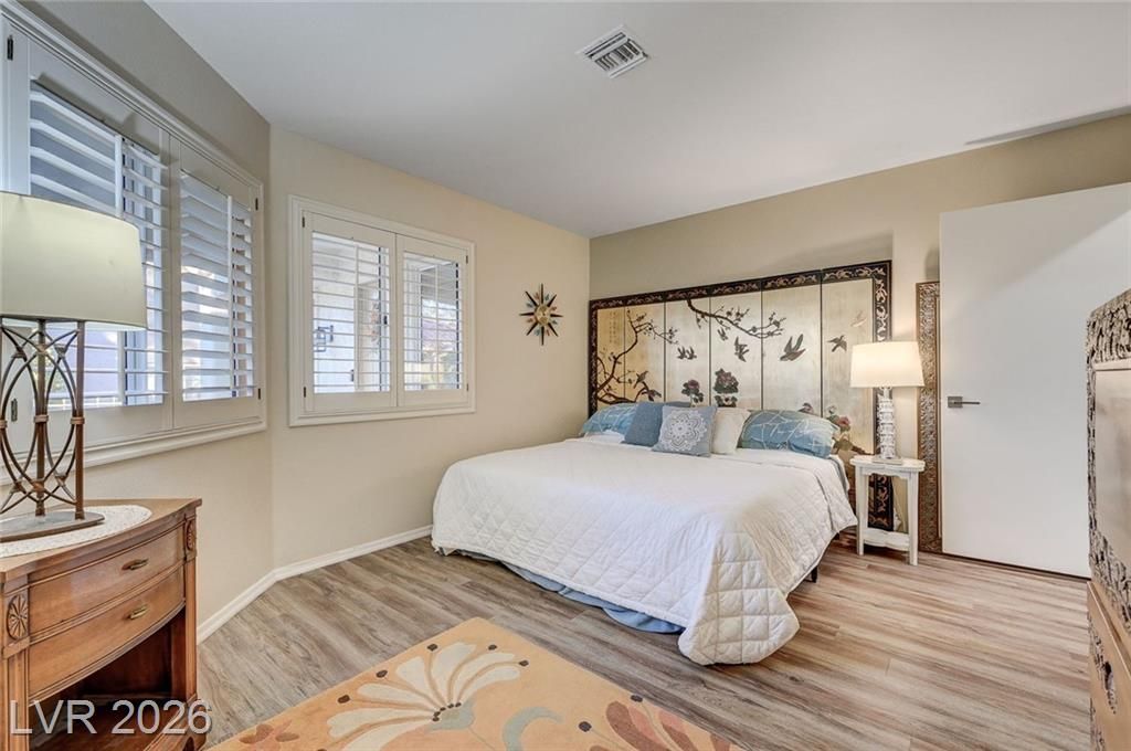 Charming and beautifully maintained home in the 55+ community of Sun City Summerlin. This 2 bedroom, 2 bath property is perfectly situated backing to a peaceful greenbelt, offering added privacy and serene views. A spacious front courtyard with desert landscaping creates a welcoming outdoor space perfect for relaxing or entertaining. Inside, the home features wood-like flooring, plantation shutters throughout, and a light, calming atmosphere that makes it feel instantly inviting. Thoughtfully cared for by the sellers, the home also includes a newer AC, water heater and dishwasher. Located in one of Summerlin’s premier active adult communities with access to golf, pools, fitness centers, social clubs, and more.
