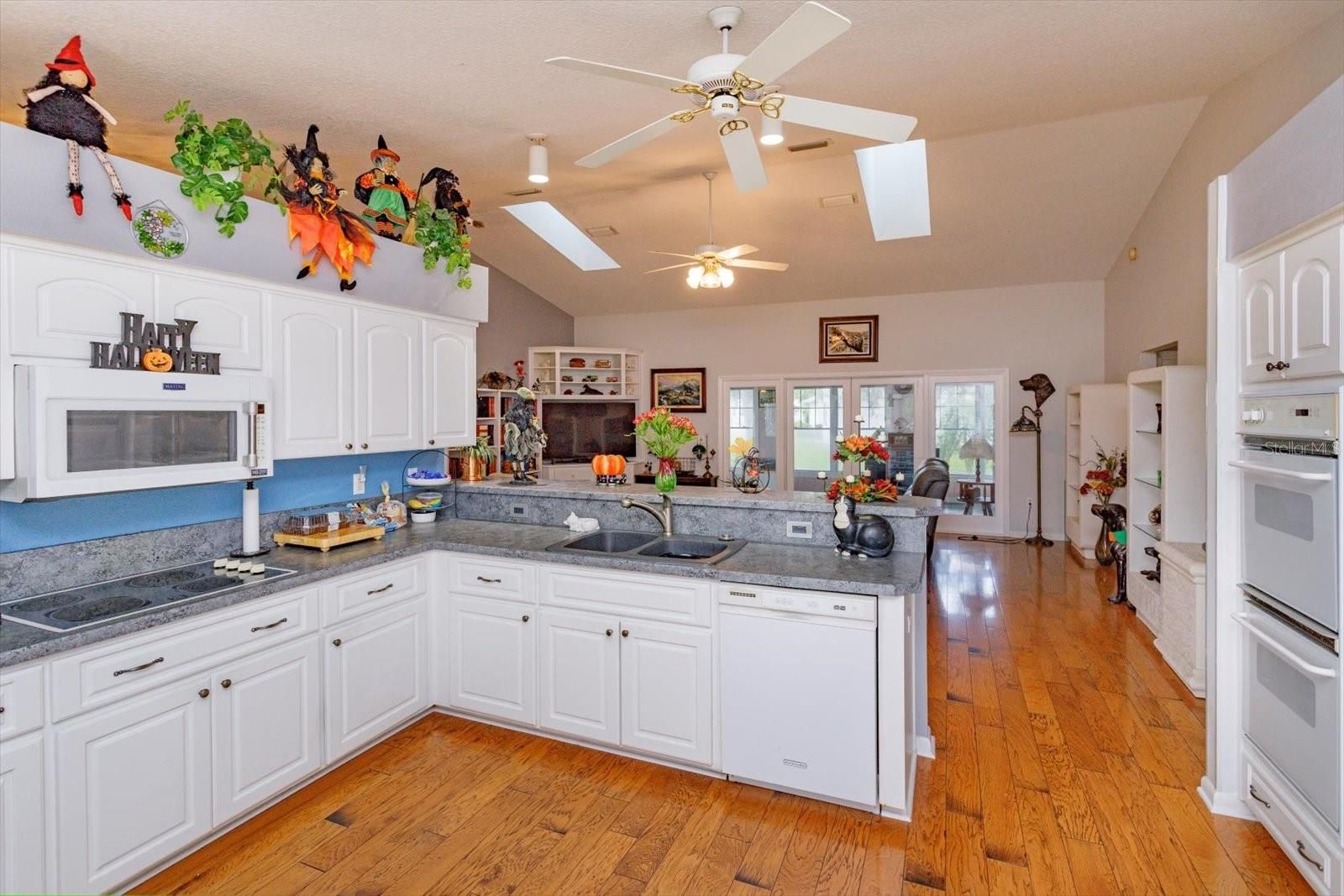 Welcome Home to Relaxed, Resort-Style Living in Lake Highlands 55+ Community Experience comfort, convenience, and community in this beautifully maintained 3-bedroom, 2-bath home nestled in one of Leesburg's most desirable 55+ gated neighborhoods. From the moment you arrive, the lush landscaping and screened front entryway set the tone for easy, enjoyable living. Step inside to a spacious foyer with coat closet leading into the open-concept Great Room, featuring a cathedral ceiling, skylights, and built-in cabinetry—perfect for entertaining or relaxing. The well-designed eat-in kitchen offers a bay window dining area, double ovens, generous cabinetry and pantry space, and a breakfast bar for casual meals. You’ll love the distressed hickory solid wood flooring that flows through most of the home, adding warmth and elegance. The Florida Room, with its tinted double-pane windows, provides a peaceful spot to enjoy morning coffee with a serene view of the trees—or step out to the patio for grilling and fresh air. The Primary Suite offers a private retreat with a garden tub, large walk-in shower, solid surface vanity, sit-down dressing area, and walk-in closet. Two additional bedrooms with full closets, a guest bath, and a dedicated home office nook with built-in desk and cabinetry complete the thoughtful floor plan. Recent updates include a new roof (2022) and newer kitchen appliances. The garage and driveway have been professionally finished for a clean, polished look. Enjoy the active, social lifestyle this community is known for—with a clubhouse offering billiards, cards, and gatherings, plus a fitness center, indoor (heated) and outdoor pools, tennis and pickleball courts, bocce, shuffleboard, softball field, and nature trails. There’s even free boat and RV storage, a craftsman woodworking shop that is optional at a reasonable $12 annually, and lakes for catch-and-release fishing. This is more than a home—it’s a lifestyle. Don’t miss your chance to live in Lake Highlands’ premier 55+ community. Schedule your private tour today!