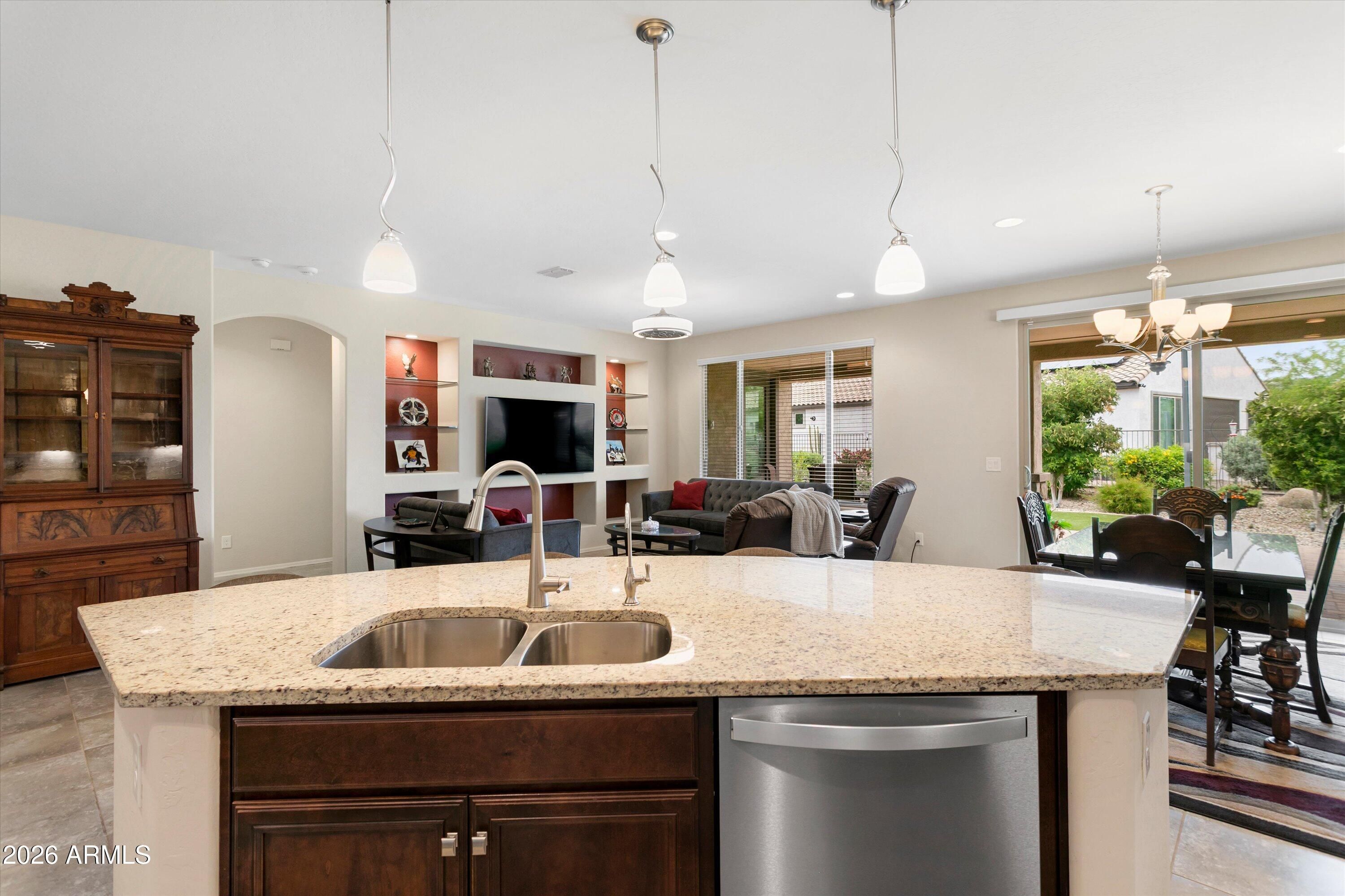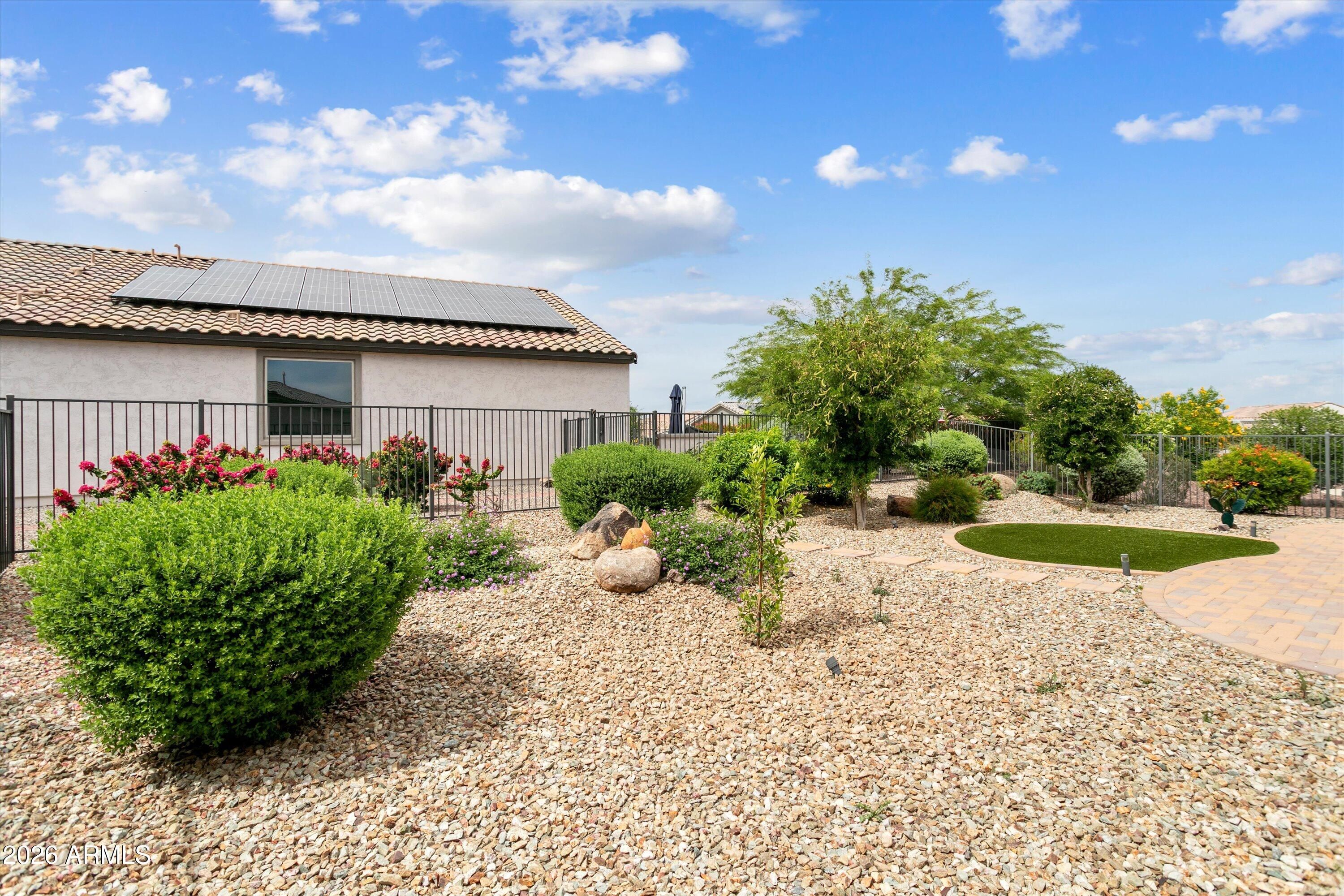 YOUR DESERT HIDEAWAY WITH OWNED SOLAR AND 4 FT EXTENDED GARAGE AWAIT YOUR ENJOYMENT! Enter this thoughtfully designed floorplan w/neutral tile and carpet, designer lighting & window treatments throughout. The Inviting gathering space showcases media wall w lighting and plenty of room for dining. A chef's kitchen featuring upgraded cabinet layout, custom backsplash, walk in pantry, & huge Island w/ pendant lights & seating. An Owners suite complete with a bay window, adjoining bath w/dual sinks, step in shower & large walk-in closet. The light & bright 2nd bedroom w/adjacent full bath is perfect for visitors. The extended garage & additional storage room are climate controlled. Enjoy outdoor living on your extended paved patio overlooking the beautifully landscaped, fenced backyard.