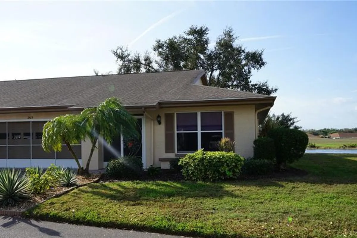 Do you want a beautiful condo on the water ? Furniture can be purchased separately making this an easy move. This home is located in Kings Point, an age restricted community where you have plenty of things to keep you busy every day. This split bedroom plan features 2 bedroom and 2 full baths. You'll enter into the screened front porch into the foyer where you have the guest area to your right. There is a coat closet and linen closet here for convenience. The living room has high ceilings and has been extended into a bonus area to enjoy the shade tree and water view. The dining area is off the living space with the kitchen right here. The cabinets are a maple with a glaze, quartz countertops and stainless appliances complete a beautiful place to cook. The breakfast area is next to a window for bird watching over the morning paper. You bonus room takes you out to you open patio and private relaxing space. The owner's bedroom is large enough for a king size bed. The hallway os all closet space that wraps around to the dual sink vanity and walk in shower. The home has laminate and tile floors throughout, solar tubes for extra lighting, a water tank installed January 2026 and a water softner. Sun City Center is located near 3 airports, multiple beaches and lots of tourist attractions.