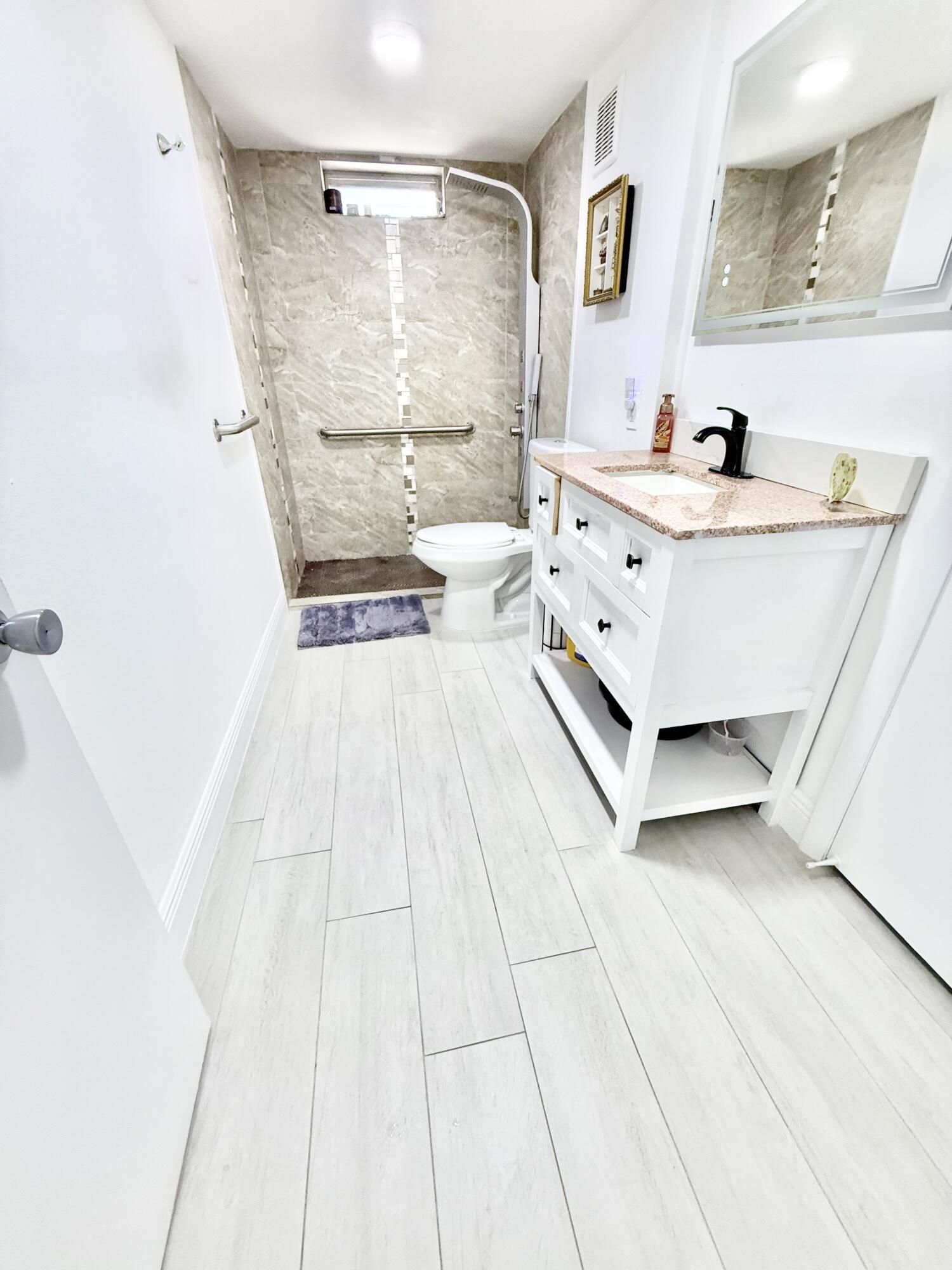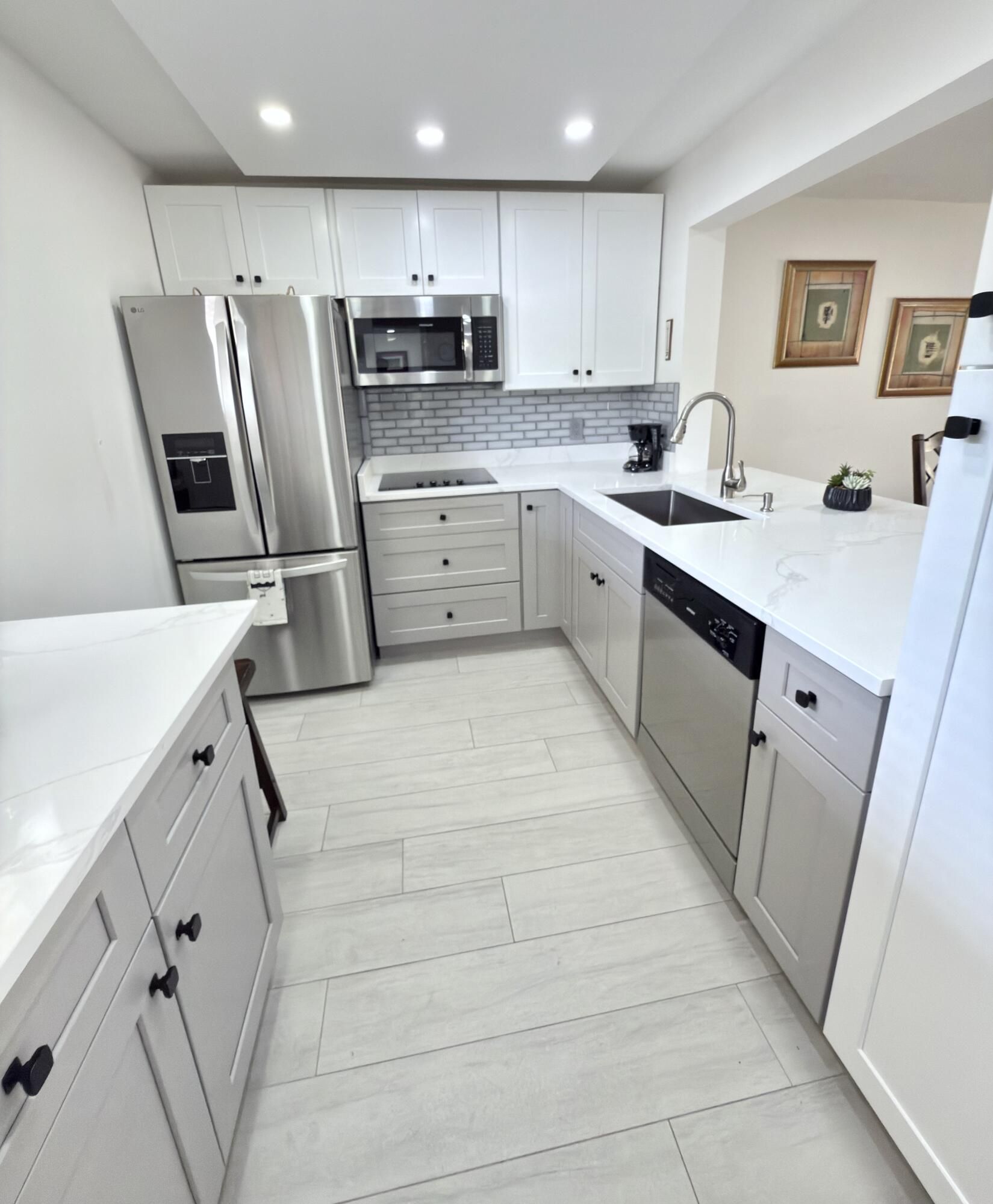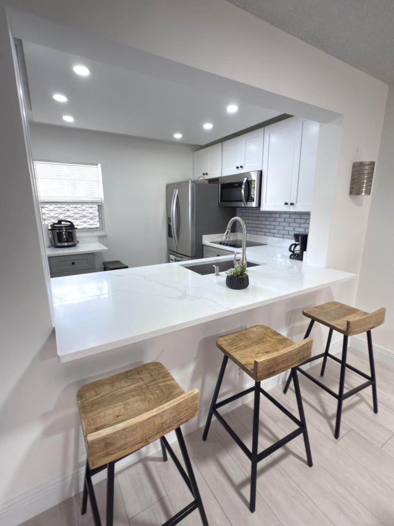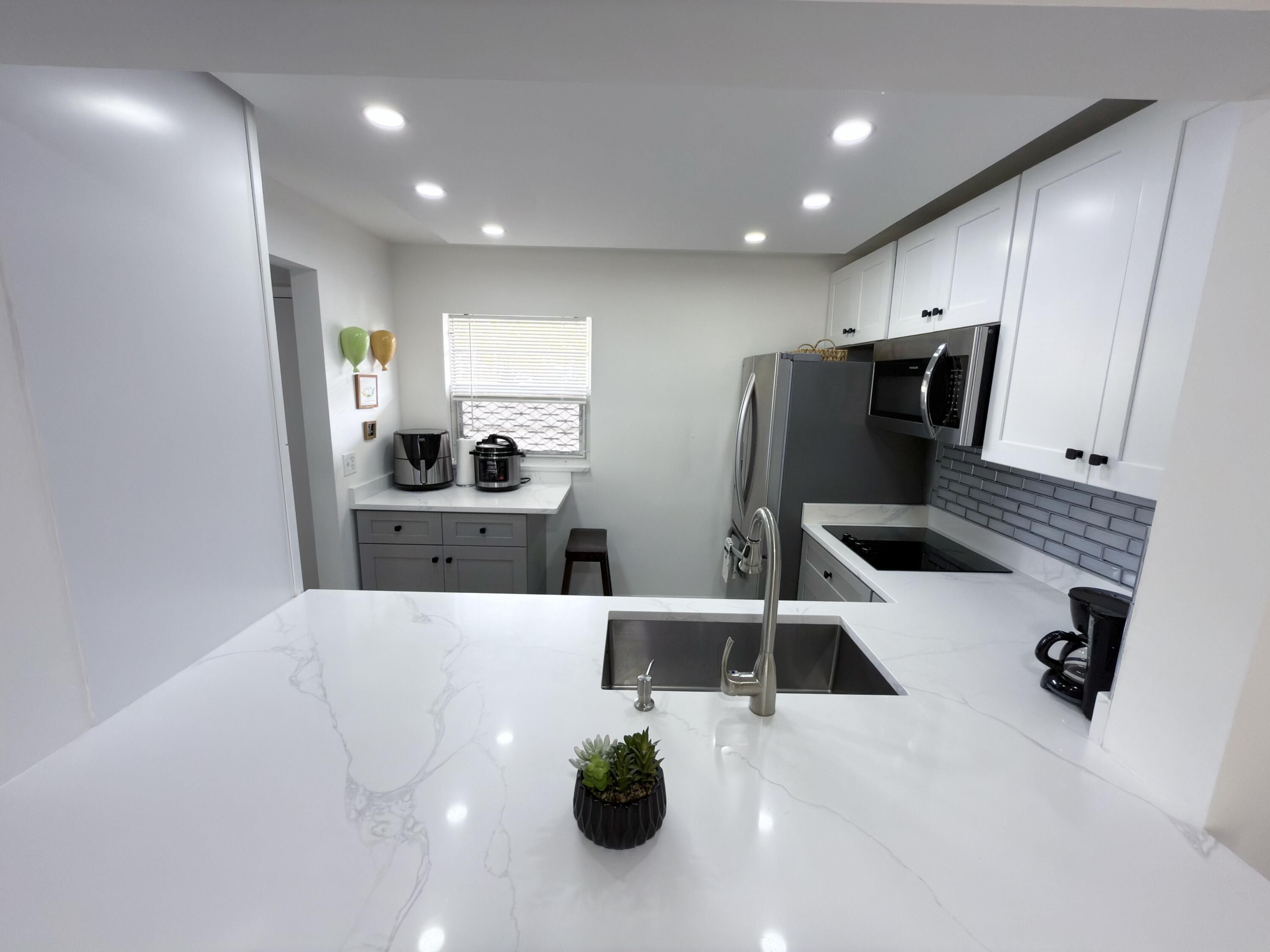 Remodeled, Move in ready beautiful 1 Bedroom 1.5 Bathrooms with convertible porch area, Great location! First Floor with Parking right on front. This home offers a bright and open floor plan with beautiful and serene garden views and BBQ Area. Beautiful brand new kitchen featuring shaker cabinets, sleek quartz countertops with extra space for barstools area, new SS appliances and LED lights. New neutral porcelain wood looking tile throughout the whole unit. Remodeled bathrooms, Fresh Paint. Concrete roof, New barn doors dividing Living room from Florida/Porch area. fantastic 55+ community with two clubhouses,two pools ,Spa, Theater, Gym, Tennis/Pickeball courts, HOA includes Cable, Water, Building insurance, Pest control, Elevator etc. Five minutes drive to Beaches, near restaurants, medical facilities, Shoppings, museums etc.. Enjoy the Florida Lifestyle