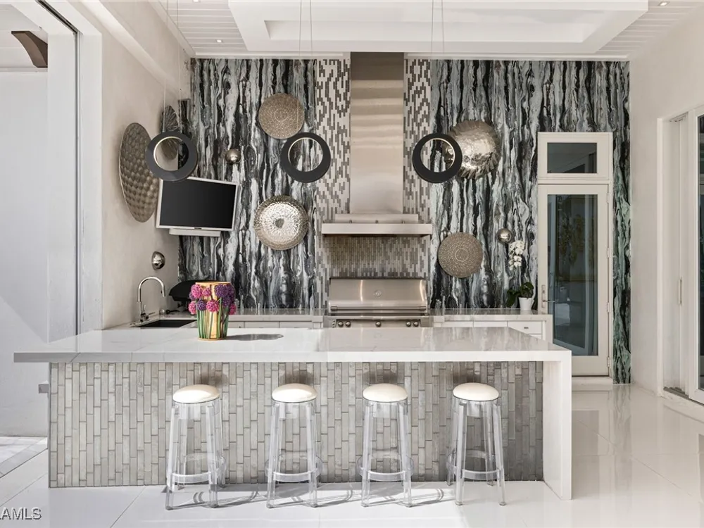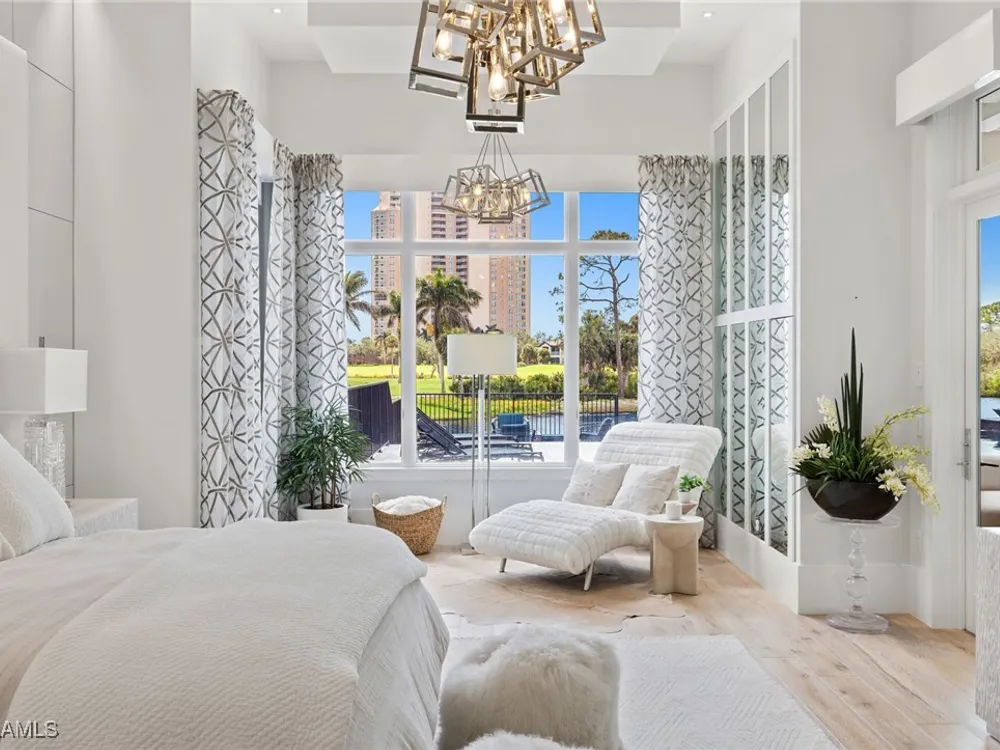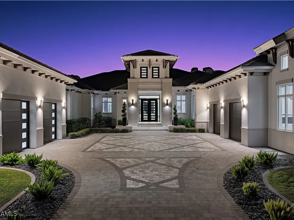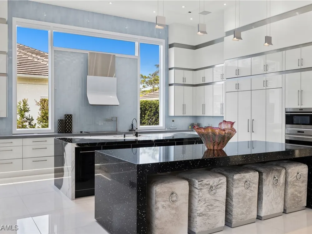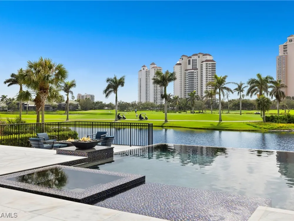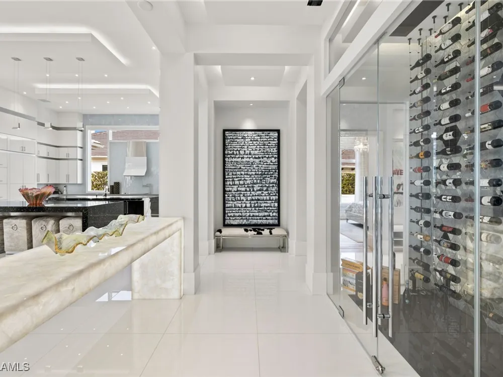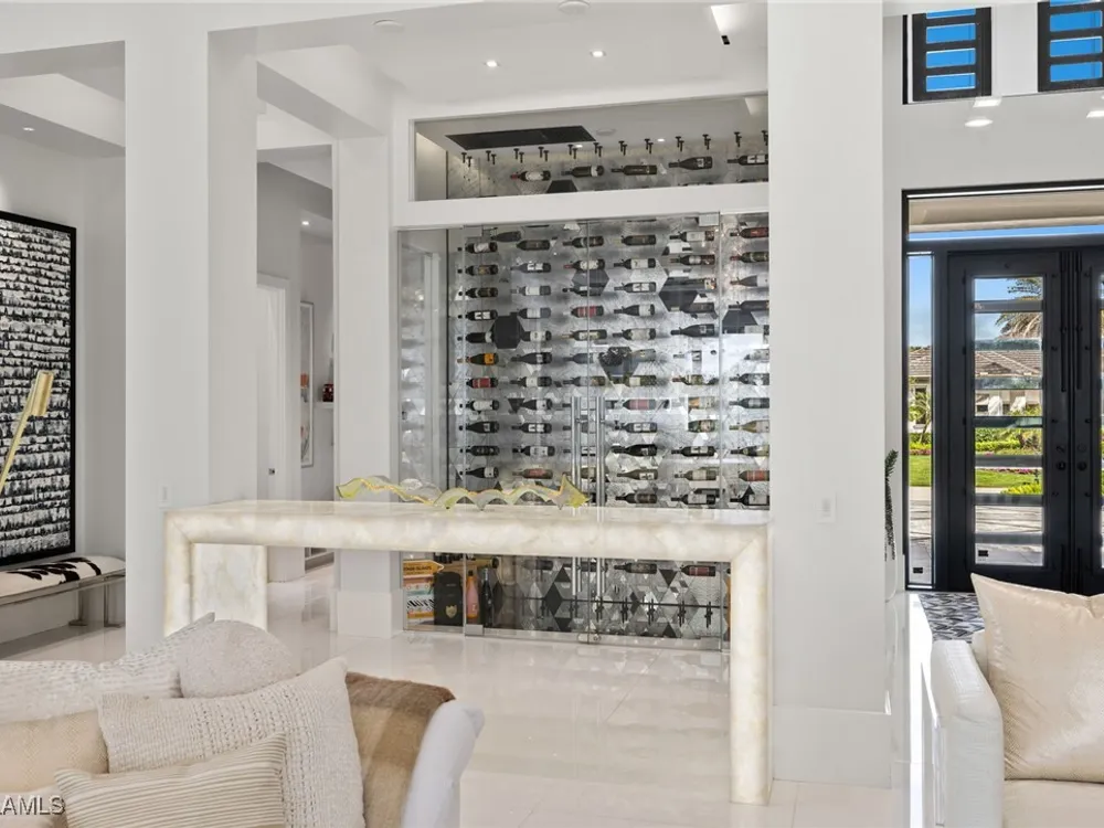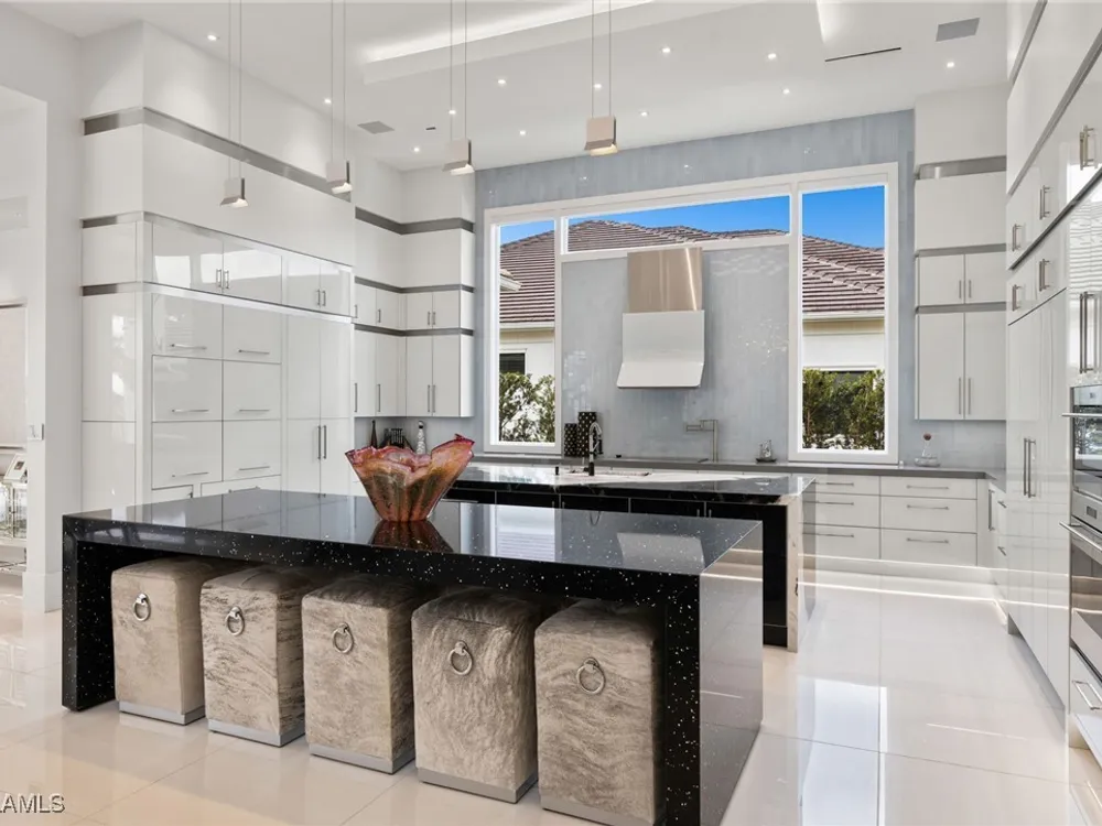 Luxury and sophistication are combined with world-class craftsmanship to deliver this award-winning STOCK custom home in the exclusive Bay Woods at Bonita Bay. Thoughtfully designed by New Architectura in collaboration with Wilfredo Emanuel Designs and Clive Daniel, this Cosmopolitan Chic home was the winner of the prestigious Sand Dollar Award. Situated on a premium lot with unobstructed lake and golf course views, this home boasts 4 bedrooms, 6 bathrooms, bonus room, and an oversized 4-car garage with room for 5 plus cars. As you enter through the grand contemporary steel doors, you are immediately struck by the dramatic geometric ceiling details, white glass tile flooring, suspended lighting, illuminated quartz wine bar and glass-enclosed wine room. The Cosmopolitan theme is carried into the kitchen, featuring glass-faced cabinetry, quartz and semi-precious stone islands with waterfall, Wolf and SubZero built-in paneled appliances, Miele coffee machine, a walk-in pantry and more. The massive primary suite is nothing short of breathtaking. From its white oak flooring to the oversized seating area, dual walk-in closets, mirrored wall panels, textured wallpaper and built-in headboard with custom lighting. As you enter the primary bathroom, you will find two separate water closets, a free-standing tub, oversized shower with multiple heads, gorgeous tile and textured accent walls. Boasting more than 3,000SF of covered space, the outdoor area is a true focal point of the home and features countless upgrades such as electric shutters and screens, bug mist system, gas fireplace and separate fire pit area, massive outdoor kitchen with waterfall quartz counters, geometric ceiling details, white marble pavers, and pool bathroom. Enjoy the sunset views over the infinity edge gas-heated pool and spa. Continuing throughout the home, you will find that every guest bedroom is ensuite and features white oak flooring, walk-in custom closets and each has its own unique design cues such as custom draperies, wallpapers, ceiling and wall details. Showcased by a floor-to-ceiling glass entry, the opulent billiards/bonus room is sure to impress with its custom leather-padded wall and illuminated stone accents. The full-home Control4 smart system provides automated electric blinds throughout, smart lighting switches, indoor and outdoor built-in speakers, security system and more. Bonita Bay offers an array of outstanding amenities and optional memberships, from a private beach club to a full-service marina and multiple dining options. Experience premier golfing with five recently renovated Arthur Hills and Tom Fazio championship courses and three expansive practice facilities. Enjoy miles of scenic walking and biking trails, kayaking, canoeing, boat launch, state-of-the-art fitness center, an 18-court tennis and pickleball complex, numerous community parks and more. This home is truly one-of-a-kind and masterfully designed to impress even the most discerning of buyers.