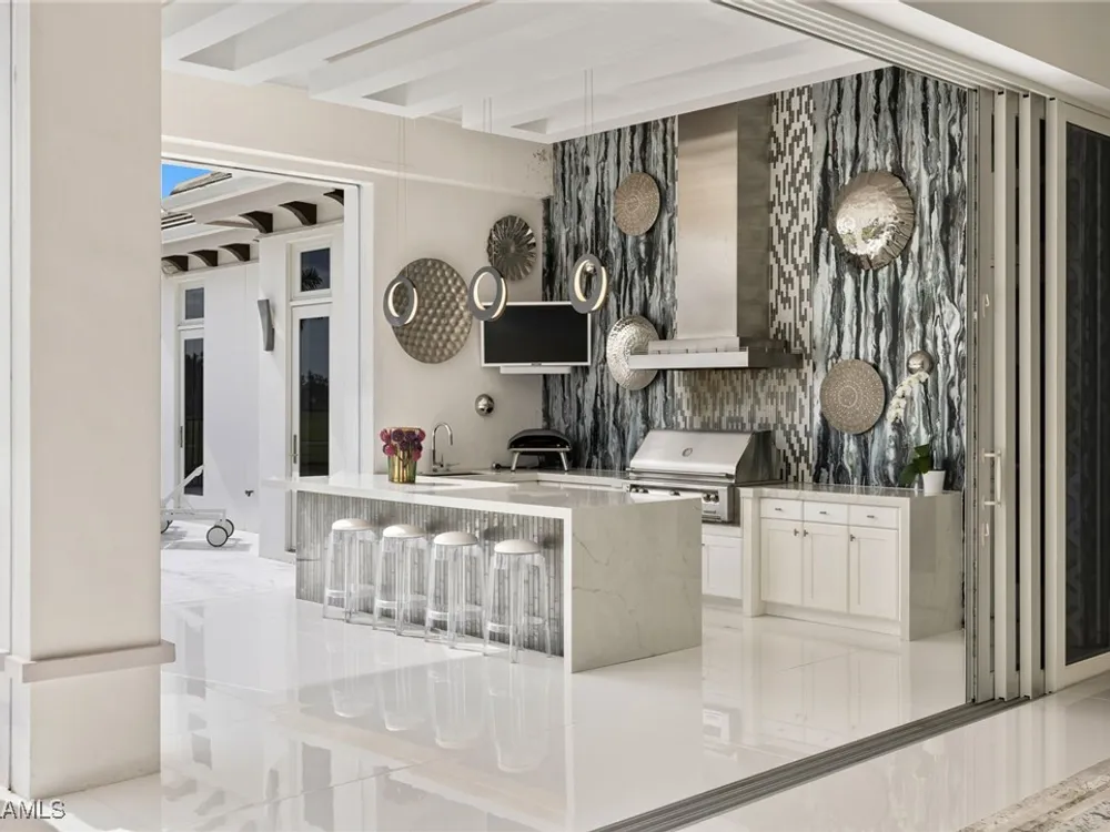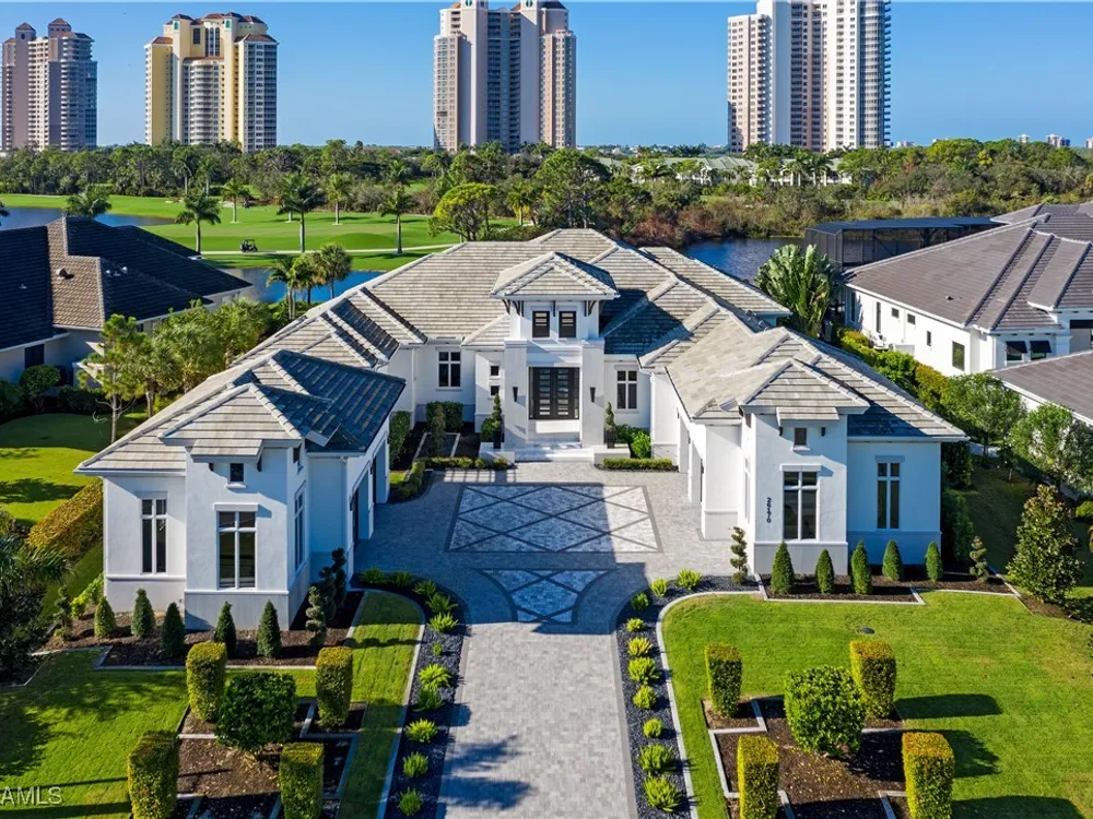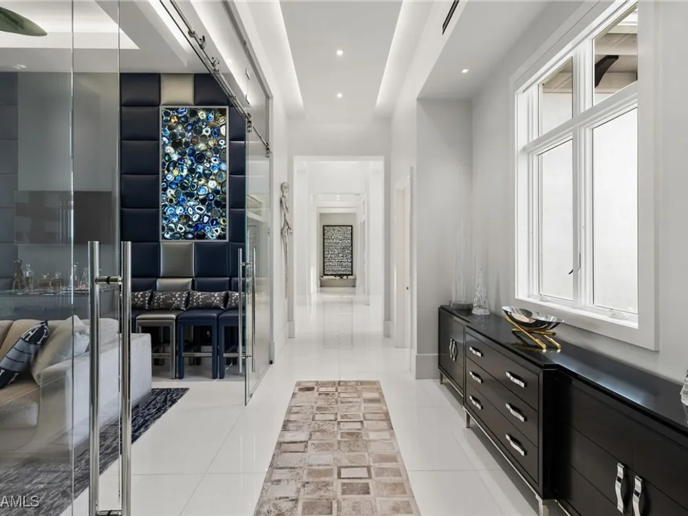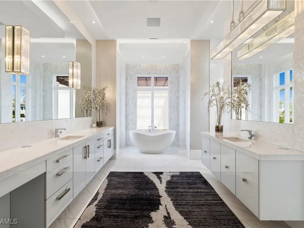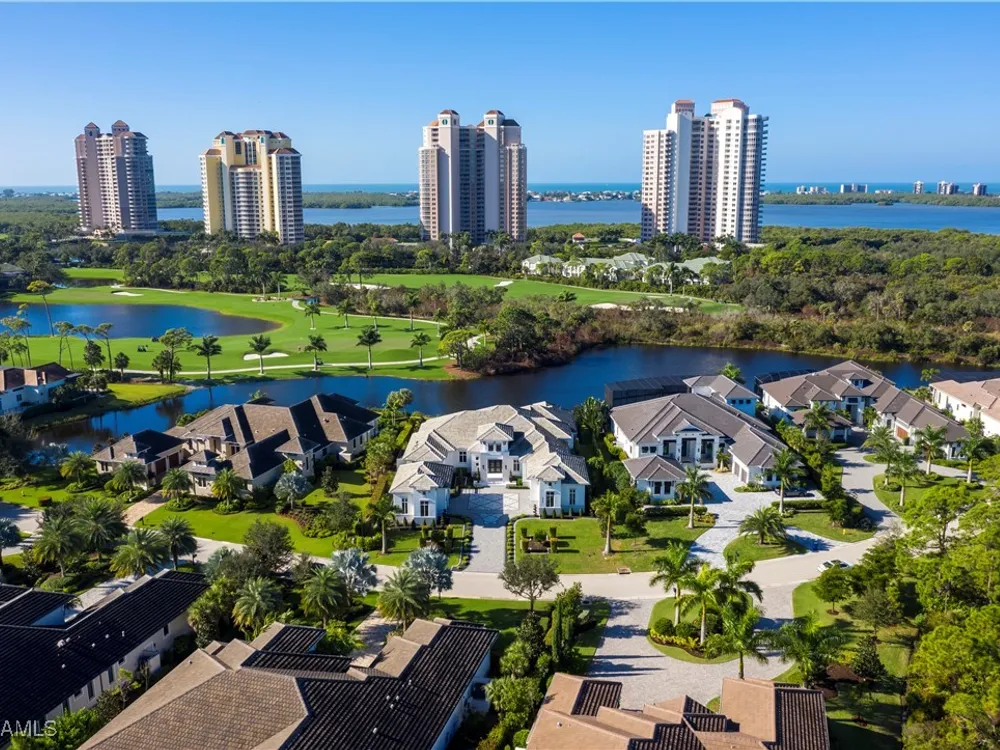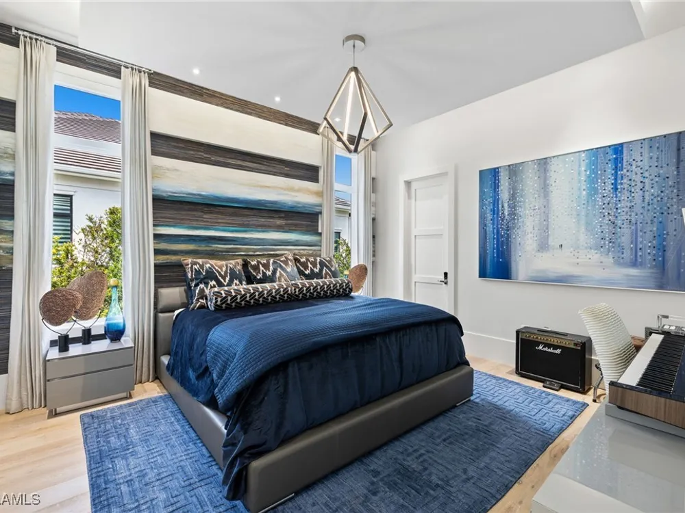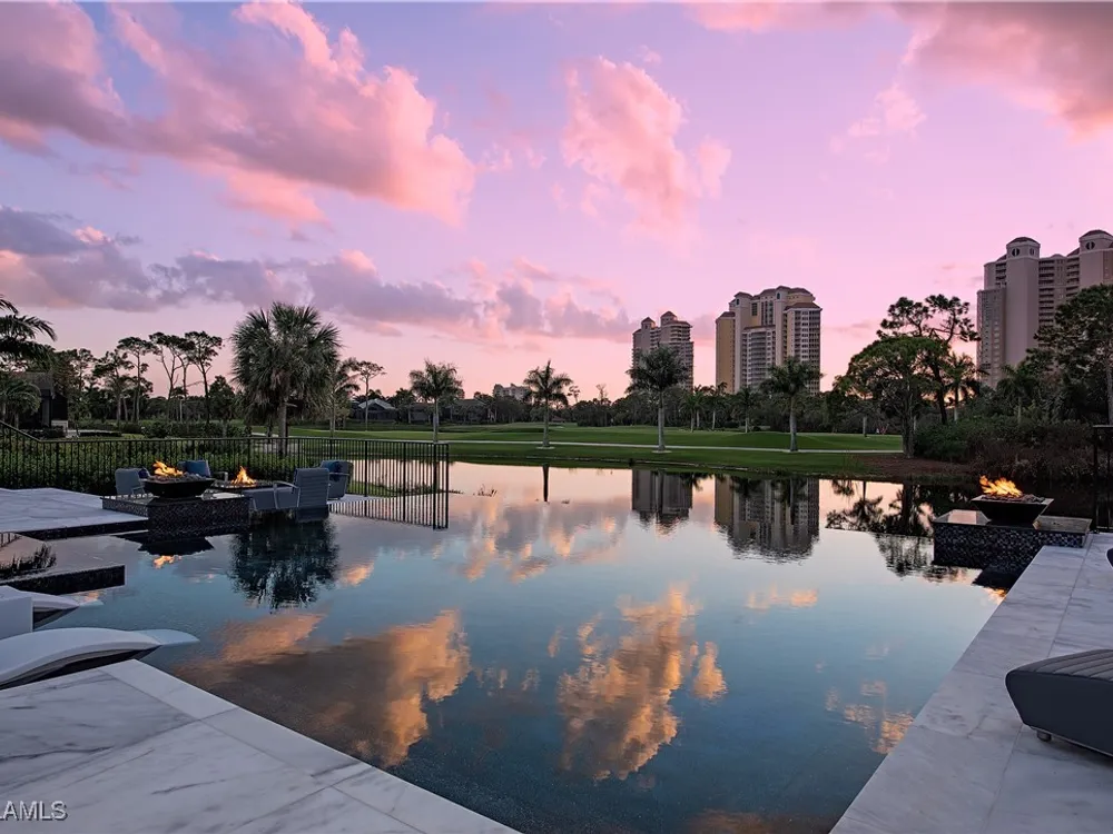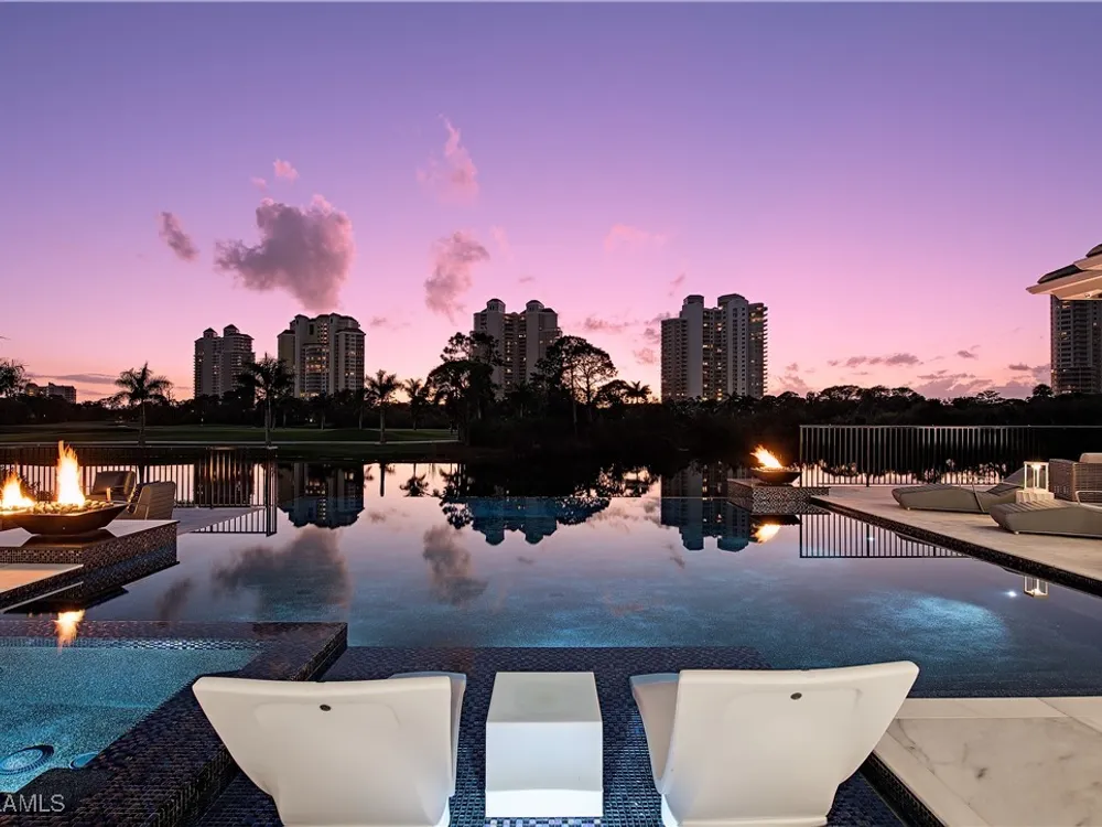 Luxury and sophistication are combined with world-class craftsmanship to deliver this award-winning STOCK custom home in the exclusive Bay Woods at Bonita Bay. Thoughtfully designed by New Architectura in collaboration with Wilfredo Emanuel Designs and Clive Daniel, this Cosmopolitan Chic home was the winner of the prestigious Sand Dollar Award. Situated on a premium lot with unobstructed lake and golf course views, this home boasts 4 bedrooms, 6 bathrooms, bonus room, and an oversized 4-car garage with room for 5 plus cars. As you enter through the grand contemporary steel doors, you are immediately struck by the dramatic geometric ceiling details, white glass tile flooring, suspended lighting, illuminated quartz wine bar and glass-enclosed wine room. The Cosmopolitan theme is carried into the kitchen, featuring glass-faced cabinetry, quartz and semi-precious stone islands with waterfall, Wolf and SubZero built-in paneled appliances, Miele coffee machine, a walk-in pantry and more. The massive primary suite is nothing short of breathtaking. From its white oak flooring to the oversized seating area, dual walk-in closets, mirrored wall panels, textured wallpaper and built-in headboard with custom lighting. As you enter the primary bathroom, you will find two separate water closets, a free-standing tub, oversized shower with multiple heads, gorgeous tile and textured accent walls. Boasting more than 3,000SF of covered space, the outdoor area is a true focal point of the home and features countless upgrades such as electric shutters and screens, bug mist system, gas fireplace and separate fire pit area, massive outdoor kitchen with waterfall quartz counters, geometric ceiling details, white marble pavers, and pool bathroom. Enjoy the sunset views over the infinity edge gas-heated pool and spa. Continuing throughout the home, you will find that every guest bedroom is ensuite and features white oak flooring, walk-in custom closets and each has its own unique design cues such as custom draperies, wallpapers, ceiling and wall details. Showcased by a floor-to-ceiling glass entry, the opulent billiards/bonus room is sure to impress with its custom leather-padded wall and illuminated stone accents. The full-home Control4 smart system provides automated electric blinds throughout, smart lighting switches, indoor and outdoor built-in speakers, security system and more. Bonita Bay offers an array of outstanding amenities and optional memberships, from a private beach club to a full-service marina and multiple dining options. Experience premier golfing with five recently renovated Arthur Hills and Tom Fazio championship courses and three expansive practice facilities. Enjoy miles of scenic walking and biking trails, kayaking, canoeing, boat launch, state-of-the-art fitness center, an 18-court tennis and pickleball complex, numerous community parks and more. This home is truly one-of-a-kind and masterfully designed to impress even the most discerning of buyers.