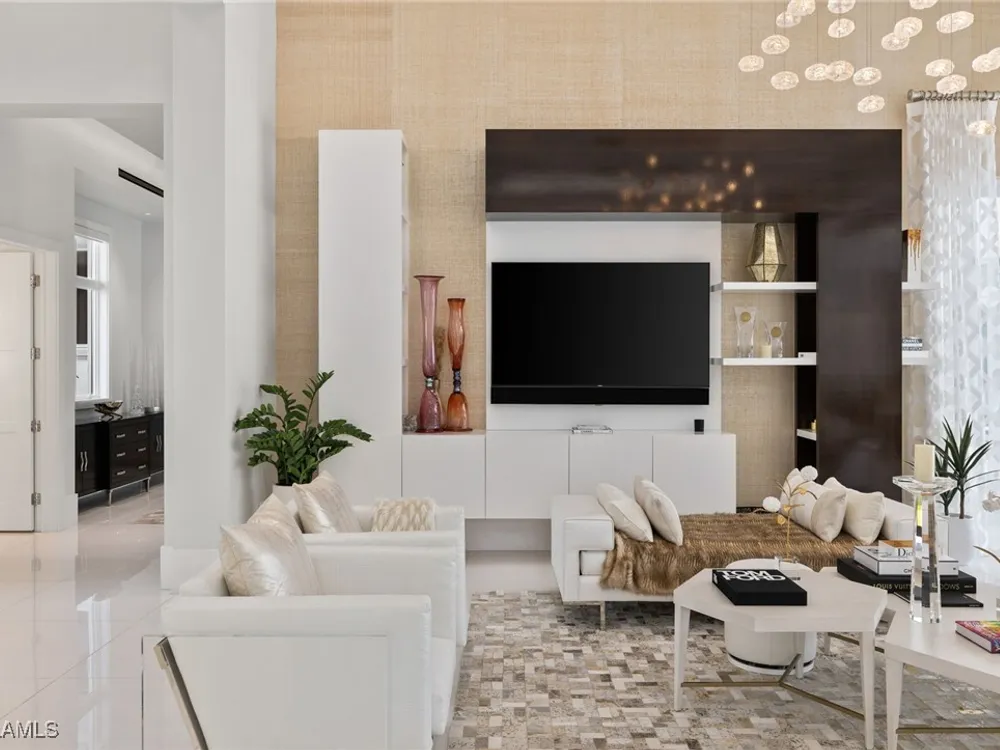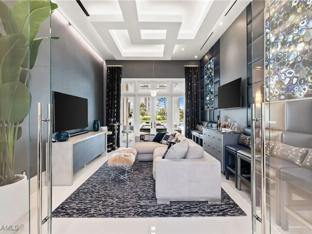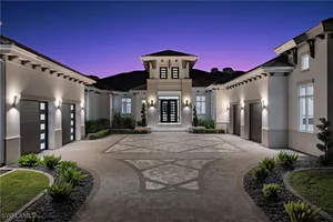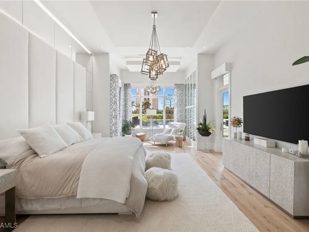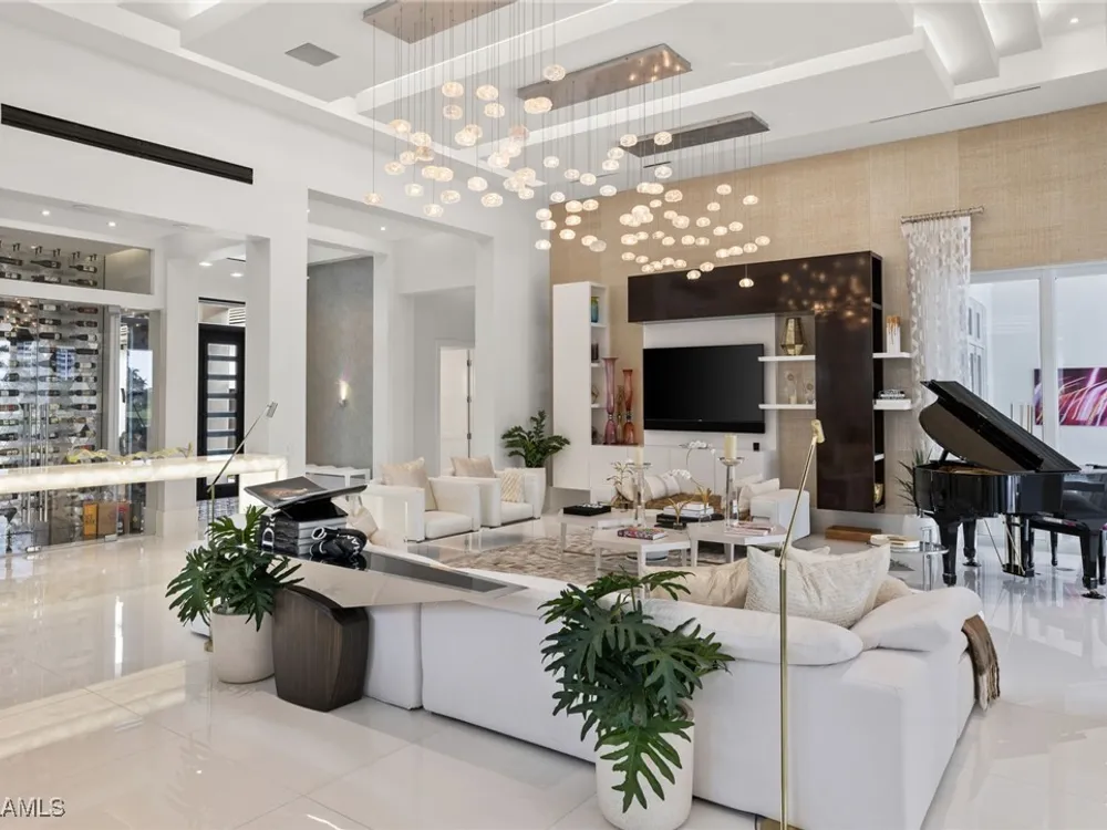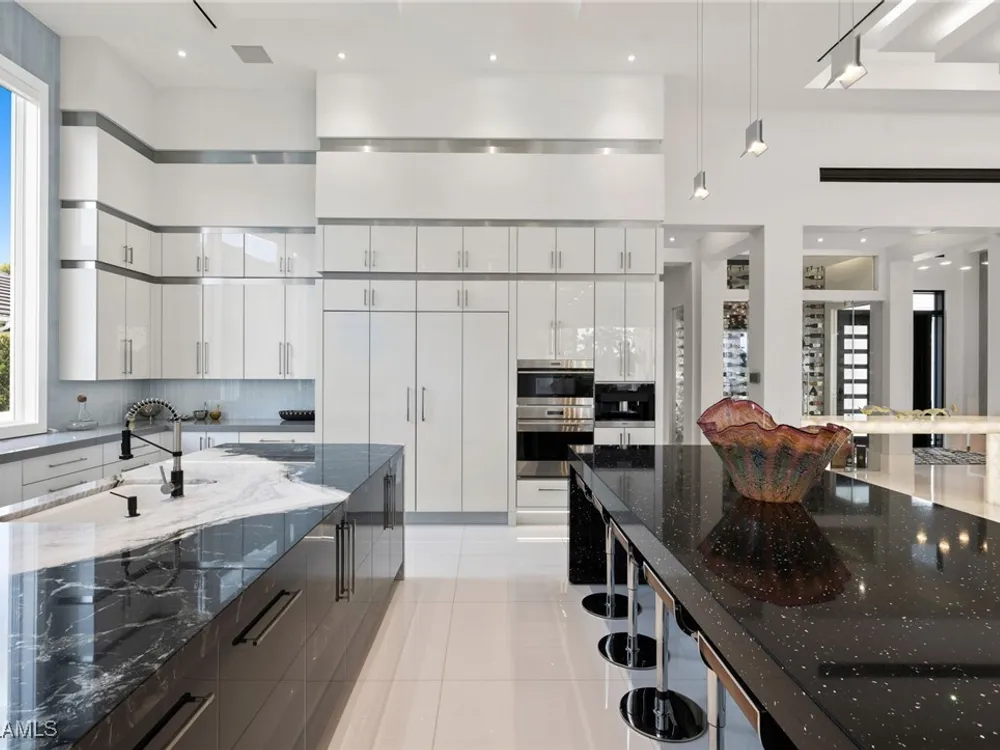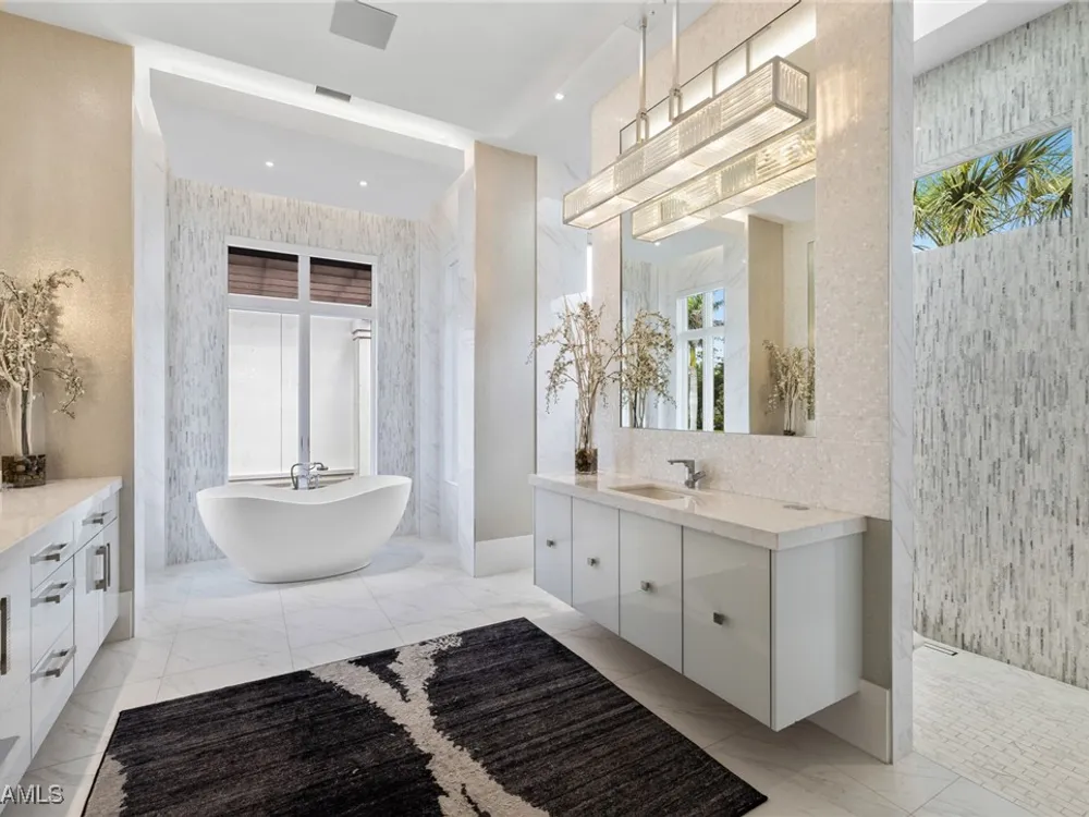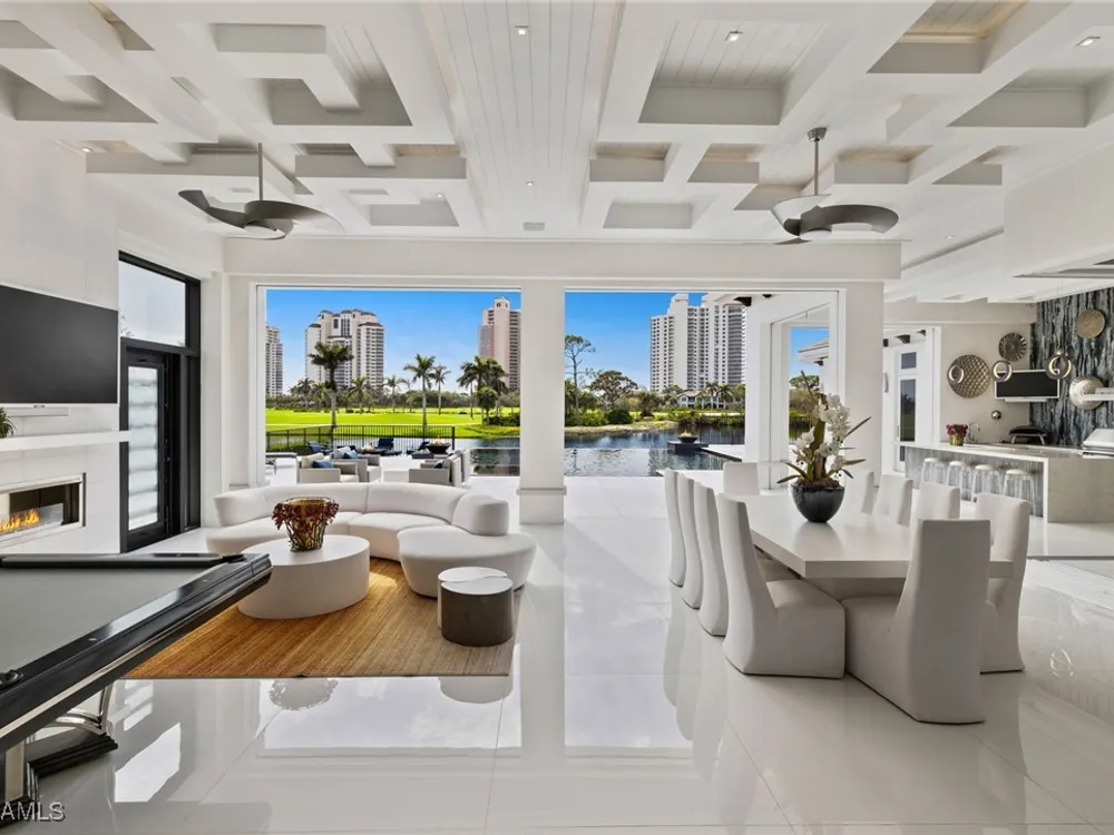 Luxury and sophistication are combined with world-class craftsmanship to deliver this award-winning STOCK custom home in the exclusive Bay Woods at Bonita Bay. Thoughtfully designed by New Architectura in collaboration with Wilfredo Emanuel Designs and Clive Daniel, this Cosmopolitan Chic home was the winner of the prestigious Sand Dollar Award. Situated on a premium lot with unobstructed lake and golf course views, this home boasts 4 bedrooms, 6 bathrooms, bonus room, and an oversized 4-car garage with room for 5 plus cars. As you enter through the grand contemporary steel doors, you are immediately struck by the dramatic geometric ceiling details, white glass tile flooring, suspended lighting, illuminated quartz wine bar and glass-enclosed wine room. The Cosmopolitan theme is carried into the kitchen, featuring glass-faced cabinetry, quartz and semi-precious stone islands with waterfall, Wolf and SubZero built-in paneled appliances, Miele coffee machine, a walk-in pantry and more. The massive primary suite is nothing short of breathtaking. From its white oak flooring to the oversized seating area, dual walk-in closets, mirrored wall panels, textured wallpaper and built-in headboard with custom lighting. As you enter the primary bathroom, you will find two separate water closets, a free-standing tub, oversized shower with multiple heads, gorgeous tile and textured accent walls. Boasting more than 3,000SF of covered space, the outdoor area is a true focal point of the home and features countless upgrades such as electric shutters and screens, bug mist system, gas fireplace and separate fire pit area, massive outdoor kitchen with waterfall quartz counters, geometric ceiling details, white marble pavers, and pool bathroom. Enjoy the sunset views over the infinity edge gas-heated pool and spa. Continuing throughout the home, you will find that every guest bedroom is ensuite and features white oak flooring, walk-in custom closets and each has its own unique design cues such as custom draperies, wallpapers, ceiling and wall details. Showcased by a floor-to-ceiling glass entry, the opulent billiards/bonus room is sure to impress with its custom leather-padded wall and illuminated stone accents. The full-home Control4 smart system provides automated electric blinds throughout, smart lighting switches, indoor and outdoor built-in speakers, security system and more. Bonita Bay offers an array of outstanding amenities and optional memberships, from a private beach club to a full-service marina and multiple dining options. Experience premier golfing with five recently renovated Arthur Hills and Tom Fazio championship courses and three expansive practice facilities. Enjoy miles of scenic walking and biking trails, kayaking, canoeing, boat launch, state-of-the-art fitness center, an 18-court tennis and pickleball complex, numerous community parks and more. This home is truly one-of-a-kind and masterfully designed to impress even the most discerning of buyers.