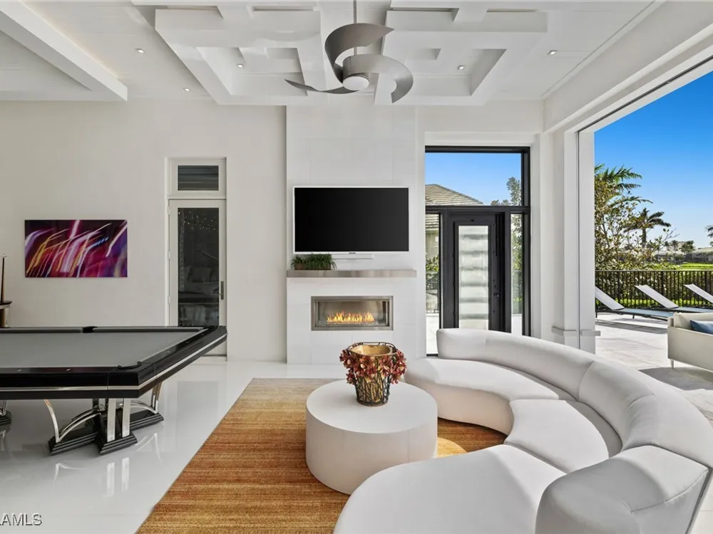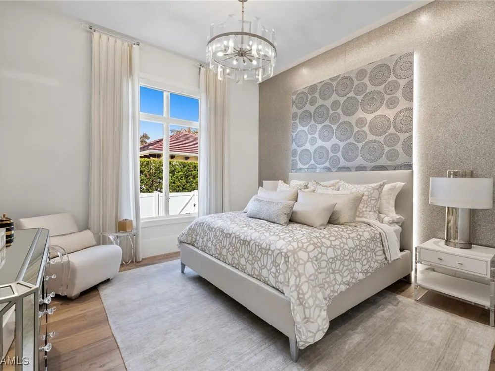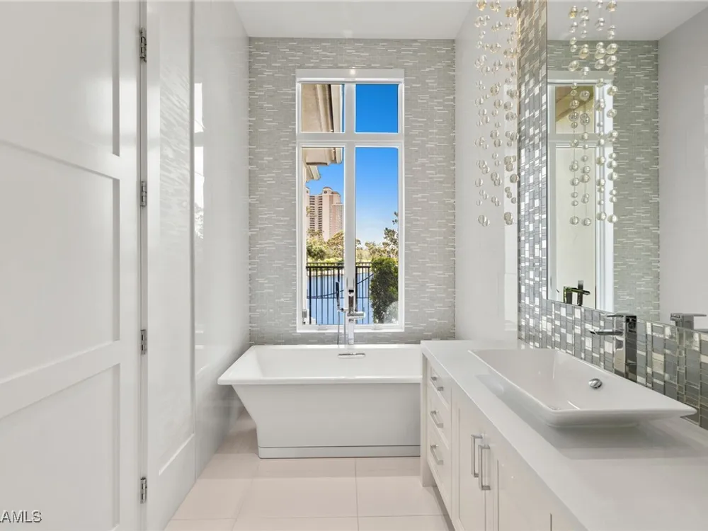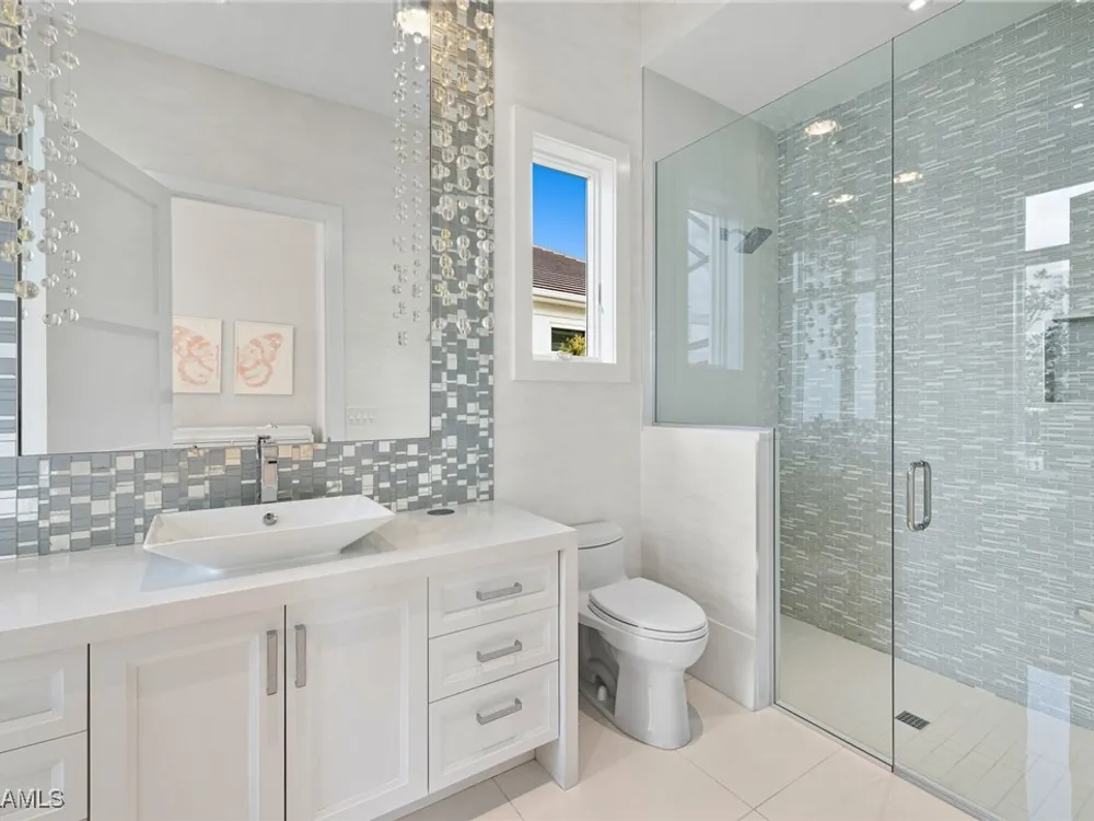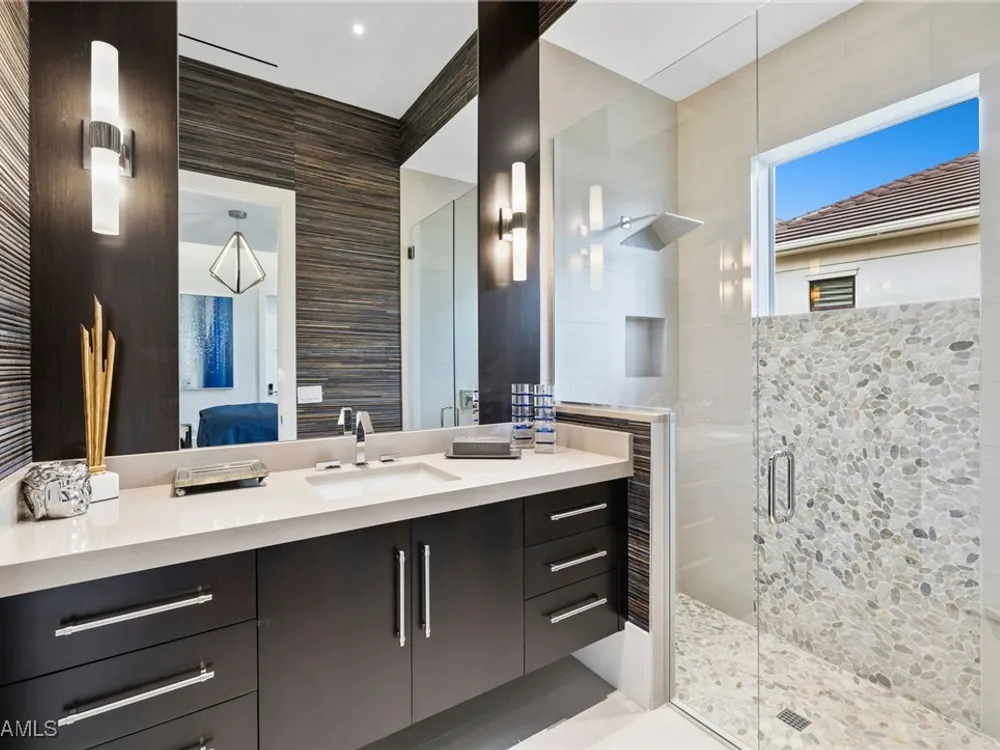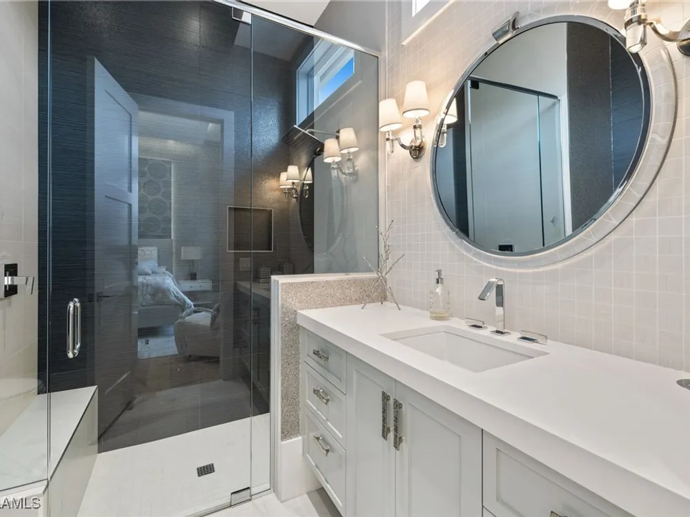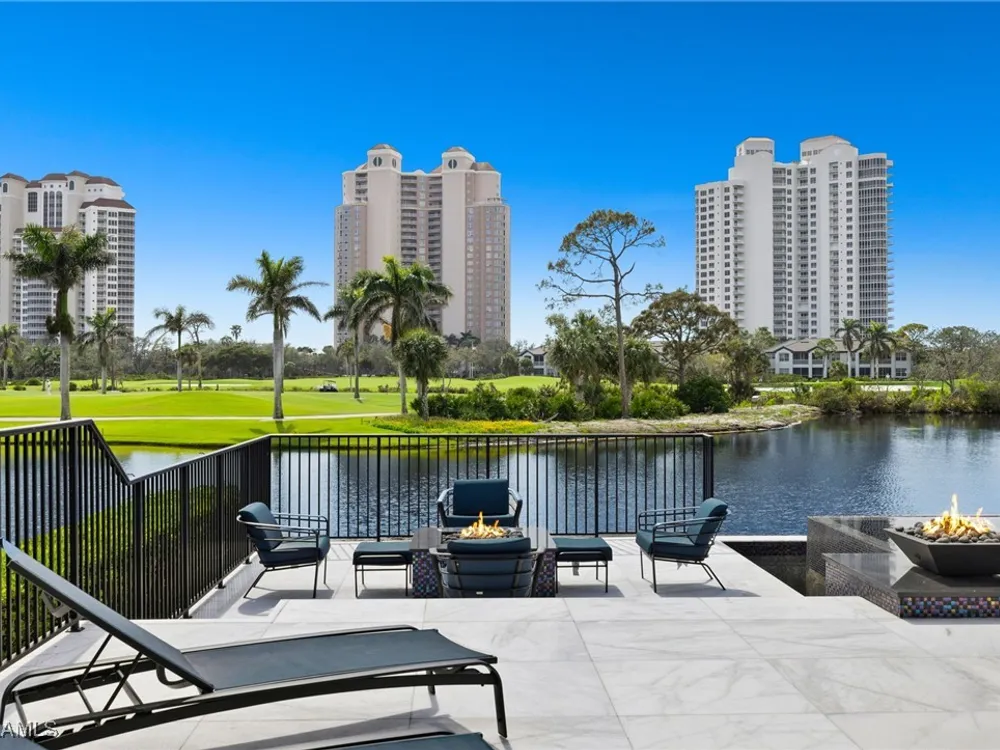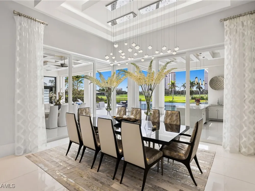 Luxury and sophistication are combined with world-class craftsmanship to deliver this award-winning STOCK custom home in the exclusive Bay Woods at Bonita Bay. Thoughtfully designed by New Architectura in collaboration with Wilfredo Emanuel Designs and Clive Daniel, this Cosmopolitan Chic home was the winner of the prestigious Sand Dollar Award. Situated on a premium lot with unobstructed lake and golf course views, this home boasts 4 bedrooms, 6 bathrooms, bonus room, and an oversized 4-car garage with room for 5 plus cars. As you enter through the grand contemporary steel doors, you are immediately struck by the dramatic geometric ceiling details, white glass tile flooring, suspended lighting, illuminated quartz wine bar and glass-enclosed wine room. The Cosmopolitan theme is carried into the kitchen, featuring glass-faced cabinetry, quartz and semi-precious stone islands with waterfall, Wolf and SubZero built-in paneled appliances, Miele coffee machine, a walk-in pantry and more. The massive primary suite is nothing short of breathtaking. From its white oak flooring to the oversized seating area, dual walk-in closets, mirrored wall panels, textured wallpaper and built-in headboard with custom lighting. As you enter the primary bathroom, you will find two separate water closets, a free-standing tub, oversized shower with multiple heads, gorgeous tile and textured accent walls. Boasting more than 3,000SF of covered space, the outdoor area is a true focal point of the home and features countless upgrades such as electric shutters and screens, bug mist system, gas fireplace and separate fire pit area, massive outdoor kitchen with waterfall quartz counters, geometric ceiling details, white marble pavers, and pool bathroom. Enjoy the sunset views over the infinity edge gas-heated pool and spa. Continuing throughout the home, you will find that every guest bedroom is ensuite and features white oak flooring, walk-in custom closets and each has its own unique design cues such as custom draperies, wallpapers, ceiling and wall details. Showcased by a floor-to-ceiling glass entry, the opulent billiards/bonus room is sure to impress with its custom leather-padded wall and illuminated stone accents. The full-home Control4 smart system provides automated electric blinds throughout, smart lighting switches, indoor and outdoor built-in speakers, security system and more. Bonita Bay offers an array of outstanding amenities and optional memberships, from a private beach club to a full-service marina and multiple dining options. Experience premier golfing with five recently renovated Arthur Hills and Tom Fazio championship courses and three expansive practice facilities. Enjoy miles of scenic walking and biking trails, kayaking, canoeing, boat launch, state-of-the-art fitness center, an 18-court tennis and pickleball complex, numerous community parks and more. This home is truly one-of-a-kind and masterfully designed to impress even the most discerning of buyers.