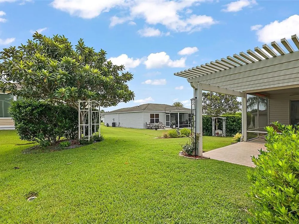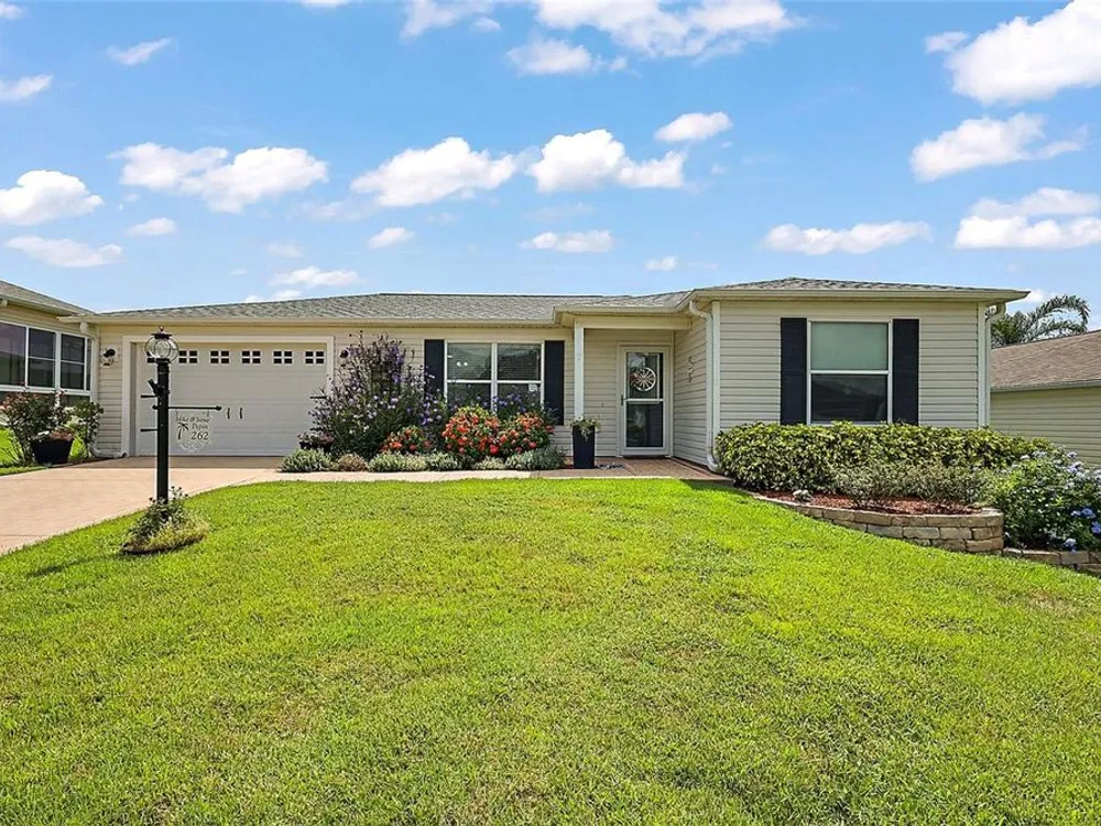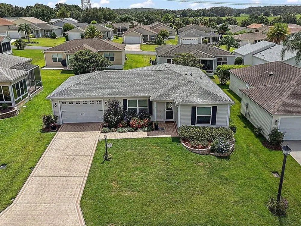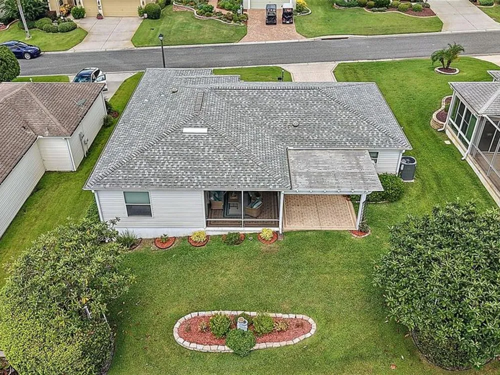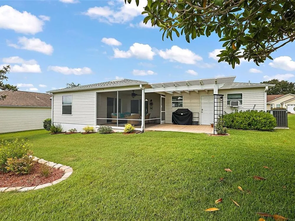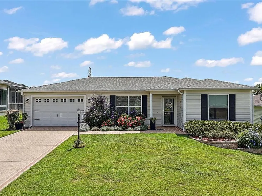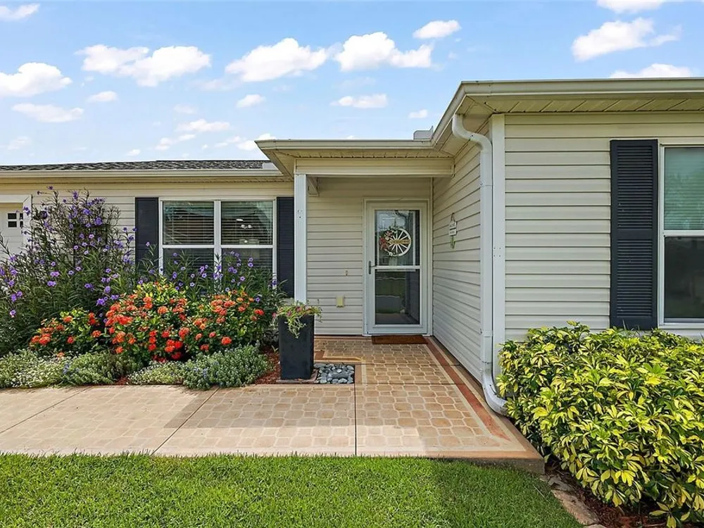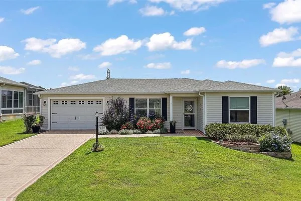 This charming Austin model in the village of AMELIA is ready for you to enjoy! It features 2 bedrooms, 2 bathrooms, and a 1 1/2-car garage. As you approach, the painted driveway and mature landscaping create an inviting atmosphere. Upon entering through the glass storm door, you are welcomed into an open floor plan that boasts vaulted ceilings and laminate vinyl flooring. The living room seamlessly connects to the eat-at bar and kitchen, which is equipped with granite countertops and pullout cabinetry, along with appliances that are LESS than 5 years old. The guest bedroom is enhanced by a larger window and a fan/light combination, with the guest bathroom conveniently situated nearby. The owner's suite showcases updated lighting, a walk-in shower, and an ensuite bathroom featuring granite countertops and a step-in glass shower. Savor your coffee on the screened lanai while listening to the soothing fountain and taking in the view of the pergola and mature landscaping. In addition, several improvements have been made: the AC was updated in 2022, new ROOF 2025, hot water heater in 2020, and interior was painted in 2021. This property is centrally located, with shopping, restaurants, and doctors nearby, and Lake Sumter Landing Town Square is less than a 15-minute golf cart ride away, along with the Colony recreational center located around the corner. Don't miss this home, call today!