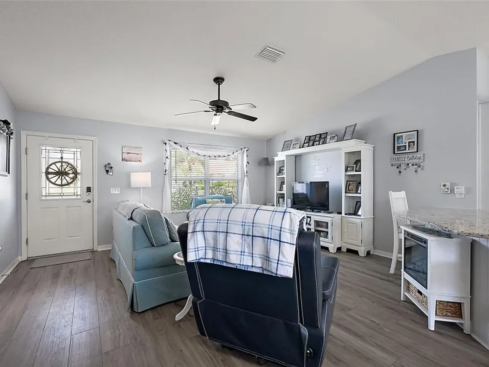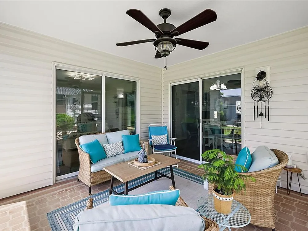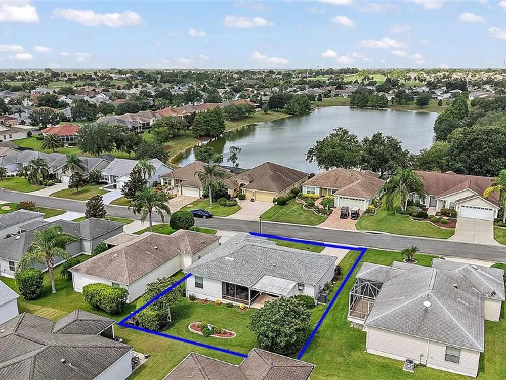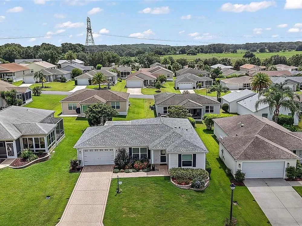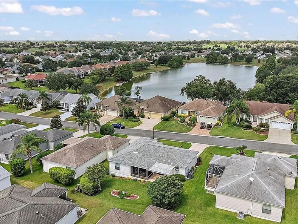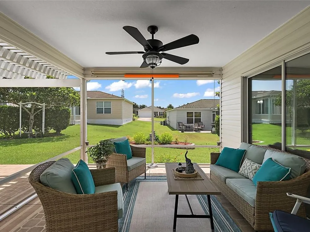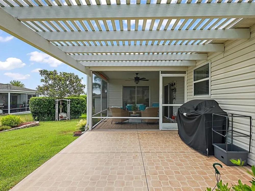 This charming Austin model in the village of AMELIA is ready for you to enjoy! It features 2 bedrooms, 2 bathrooms, and a 1 1/2-car garage. As you approach, the painted driveway and mature landscaping create an inviting atmosphere. Upon entering through the glass storm door, you are welcomed into an open floor plan that boasts vaulted ceilings and laminate vinyl flooring. The living room seamlessly connects to the eat-at bar and kitchen, which is equipped with granite countertops and pullout cabinetry, along with appliances that are LESS than 5 years old. The guest bedroom is enhanced by a larger window and a fan/light combination, with the guest bathroom conveniently situated nearby. The owner's suite showcases updated lighting, a walk-in shower, and an ensuite bathroom featuring granite countertops and a step-in glass shower. Savor your coffee on the screened lanai while listening to the soothing fountain and taking in the view of the pergola and mature landscaping. In addition, several improvements have been made: the AC was updated in 2022, new ROOF 2025, hot water heater in 2020, and interior was painted in 2021. This property is centrally located, with shopping, restaurants, and doctors nearby, and Lake Sumter Landing Town Square is less than a 15-minute golf cart ride away, along with the Colony recreational center located around the corner. Don't miss this home, call today!