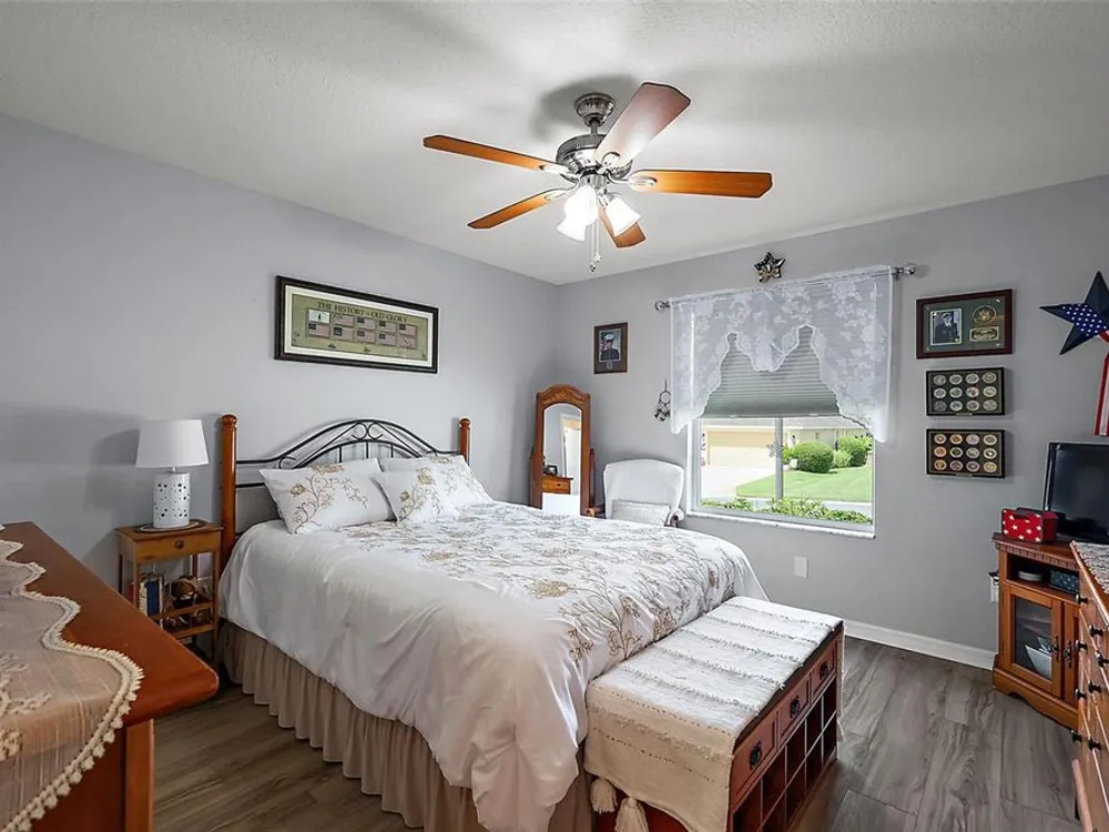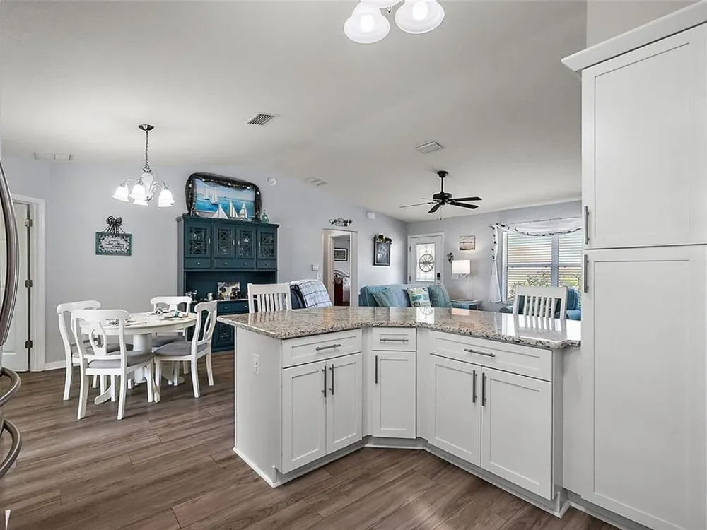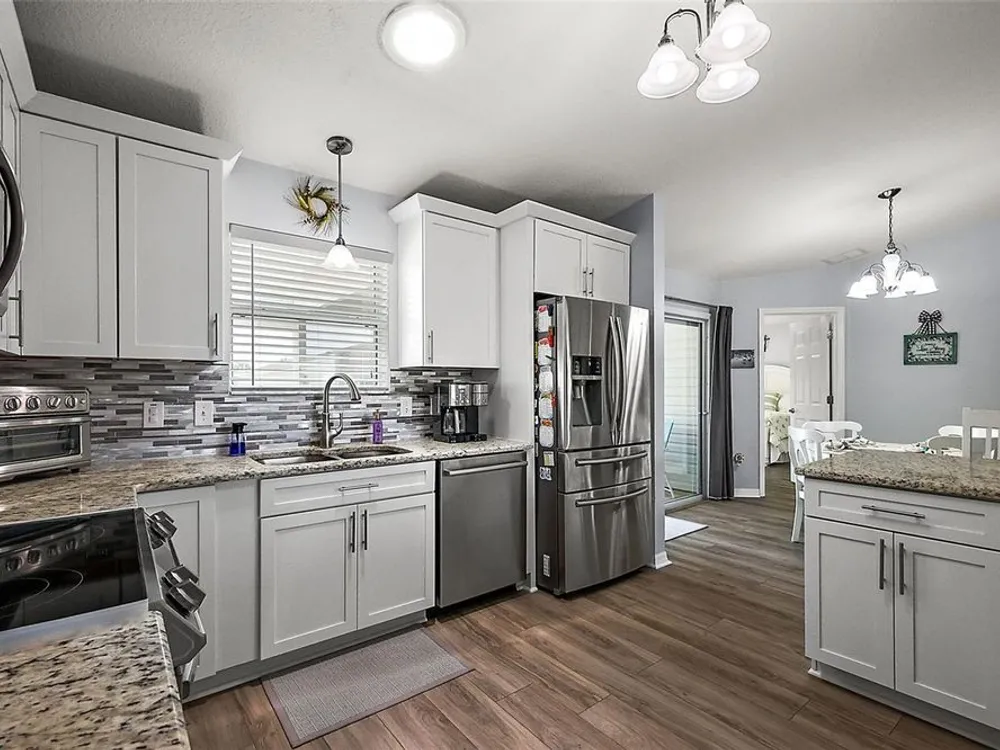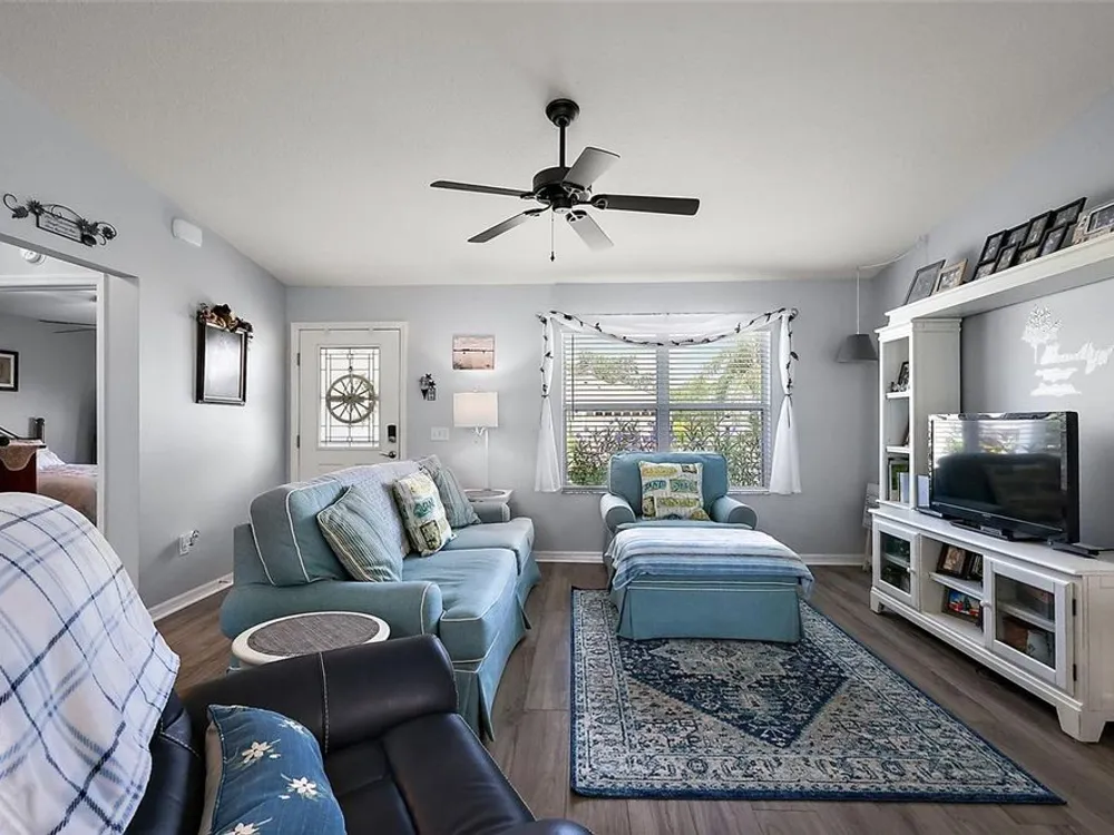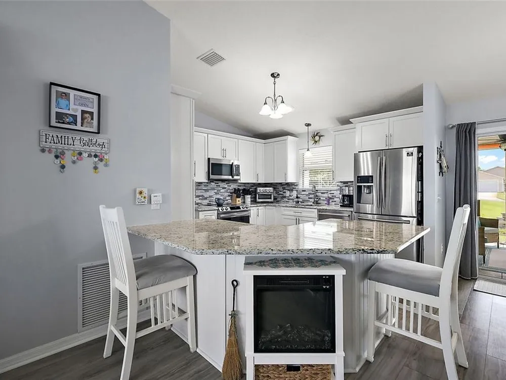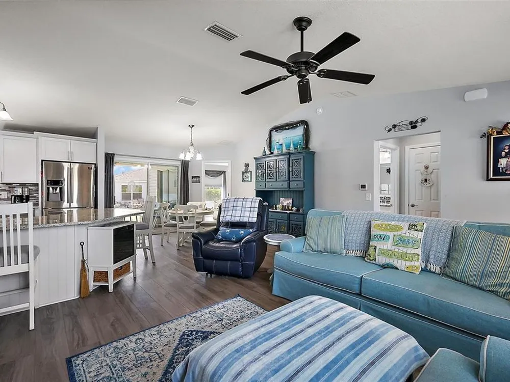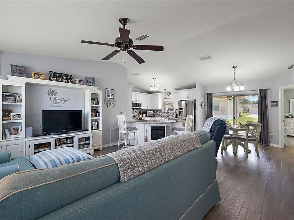 This charming Austin model in the village of AMELIA is ready for you to enjoy! It features 2 bedrooms, 2 bathrooms, and a 1 1/2-car garage. As you approach, the painted driveway and mature landscaping create an inviting atmosphere. Upon entering through the glass storm door, you are welcomed into an open floor plan that boasts vaulted ceilings and laminate vinyl flooring. The living room seamlessly connects to the eat-at bar and kitchen, which is equipped with granite countertops and pullout cabinetry, along with appliances that are LESS than 5 years old. The guest bedroom is enhanced by a larger window and a fan/light combination, with the guest bathroom conveniently situated nearby. The owner's suite showcases updated lighting, a walk-in shower, and an ensuite bathroom featuring granite countertops and a step-in glass shower. Savor your coffee on the screened lanai while listening to the soothing fountain and taking in the view of the pergola and mature landscaping. In addition, several improvements have been made: the AC was updated in 2022, new ROOF 2025, hot water heater in 2020, and interior was painted in 2021. This property is centrally located, with shopping, restaurants, and doctors nearby, and Lake Sumter Landing Town Square is less than a 15-minute golf cart ride away, along with the Colony recreational center located around the corner. Don't miss this home, call today!