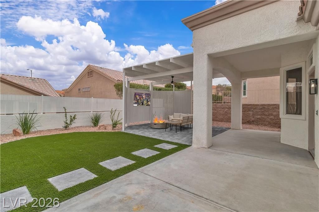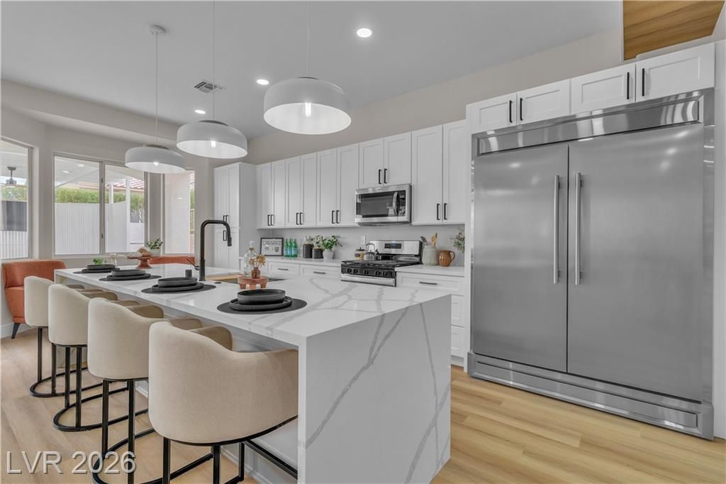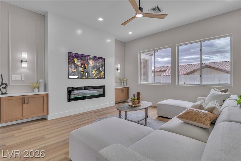 Sun City Summerlin Home positioned in the HIGHLY DESIRED west side, this exquisitely reimagined residence delivers FUNCTIONALITY, STYLE & LUXURY! This is your EXCLUSIVE chance to secure your dream home before it ever hits the market. Step into a breathtaking open-concept space where NEW LUXURY VINYL FLOORING flows into a LARGE LIVING ROOM featuring a CUSTOM FIREPLACE WALL accented with OAK CABINETRY, CUSTOM FLOATING SHELVES, WALL SCONCES & A 75” TV—designed for elevated living. The SHOW-STOPPING KITCHEN boasts an OVERSIZED waterfall Taj Mahal–inspired island, 36” UPGRADED RANGE, OVERSIZED REFRIGERATOR & ALL-NEW TWO-TONE OAK & WHITE SHAKER CABINETS. A DEDICATED TILED WINE WALL holds 70+ BOTTLES. The PRIMARY SUITE offers a SPA-LIKE BATH with a NEW TILED WALK-IN SHOWER & MASSIVE CLOSET. Enjoy your PRIVATE BACKYARD with a BRAND NEW elevated hot tub, PERGOLA & TV—creating your own resort-style retreat under the stars. Home under construction. Photos are inspiration.