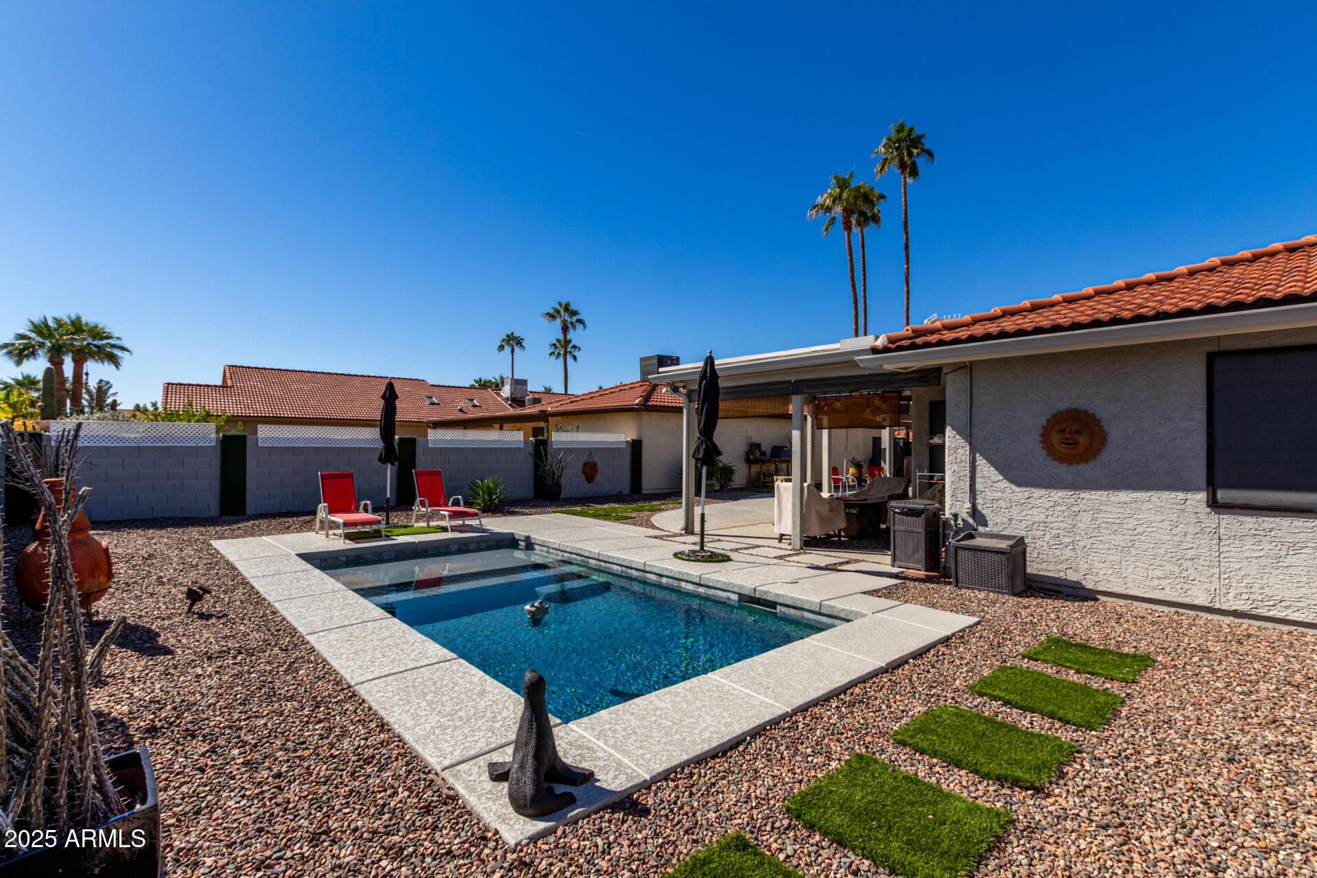 GORGEOUS Zuni model w/2020 Play Pool in the ADULT COMMUNITY of COTTONWOOD! 2024 ROOF, WATER HEATER & RECIRCULATING PUMP! Enter through the DOUBLE FRONT DOORS to the spacious great room. The kitchen is well-appointed w/ GRANITE counters, STAINLESS STEEL APPLIANCES & RO. The Primary Suite features a large walk-in & 2 reach-in closets, double sinks, separate tub & shower. French doors, direct patio access & a wet bar are featured in the Den. The Guest suite has a large closet & updated bathroom. You'll love the PRIVATE, LOW-MAINTENANCE BACKYARD w/ covered side patio, BEAUTIFUL POOL & plenty of room to entertain! Don't miss this opportunity to COME ENJOY THE GOOD LIFE in Sun Lakes w/ all of its amenities including golf, tennis, pickle ball, pools, NEW fitness center, clubs & so much more!