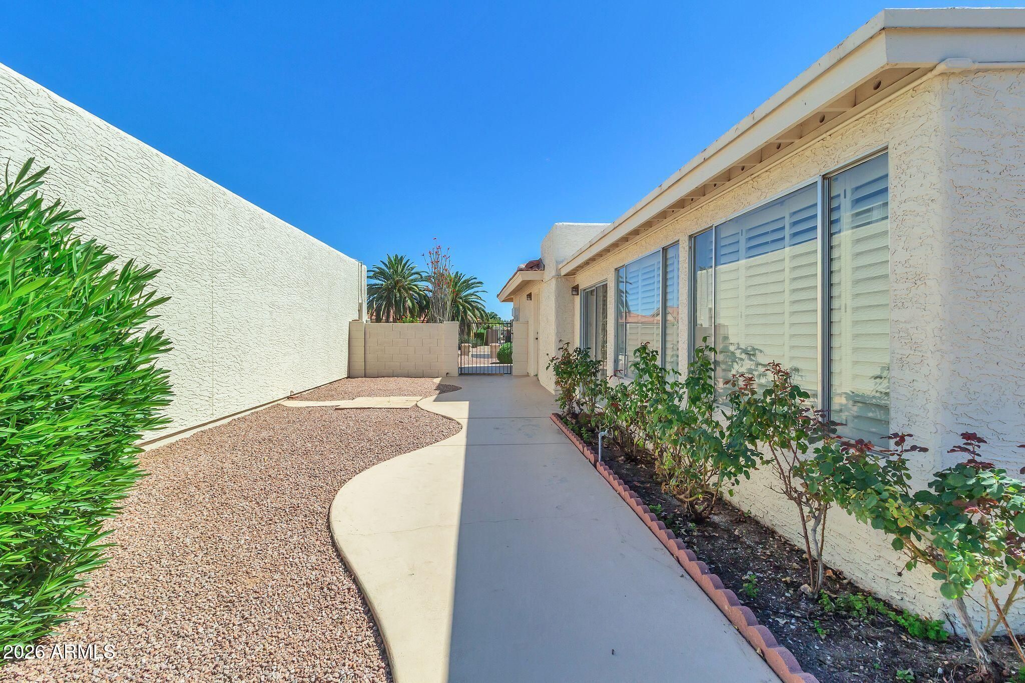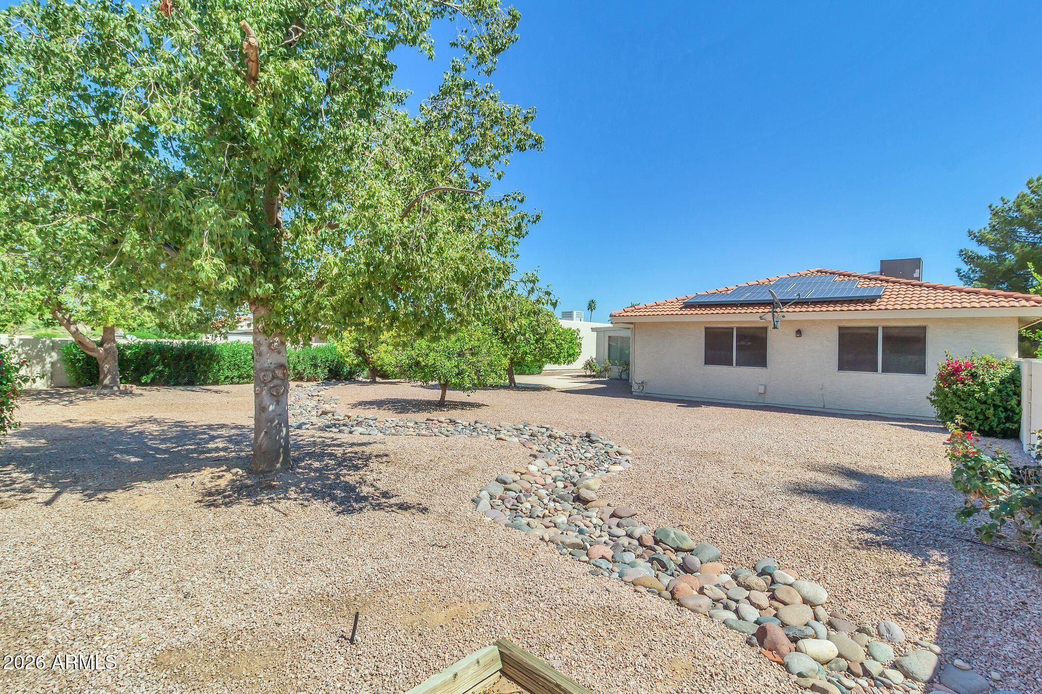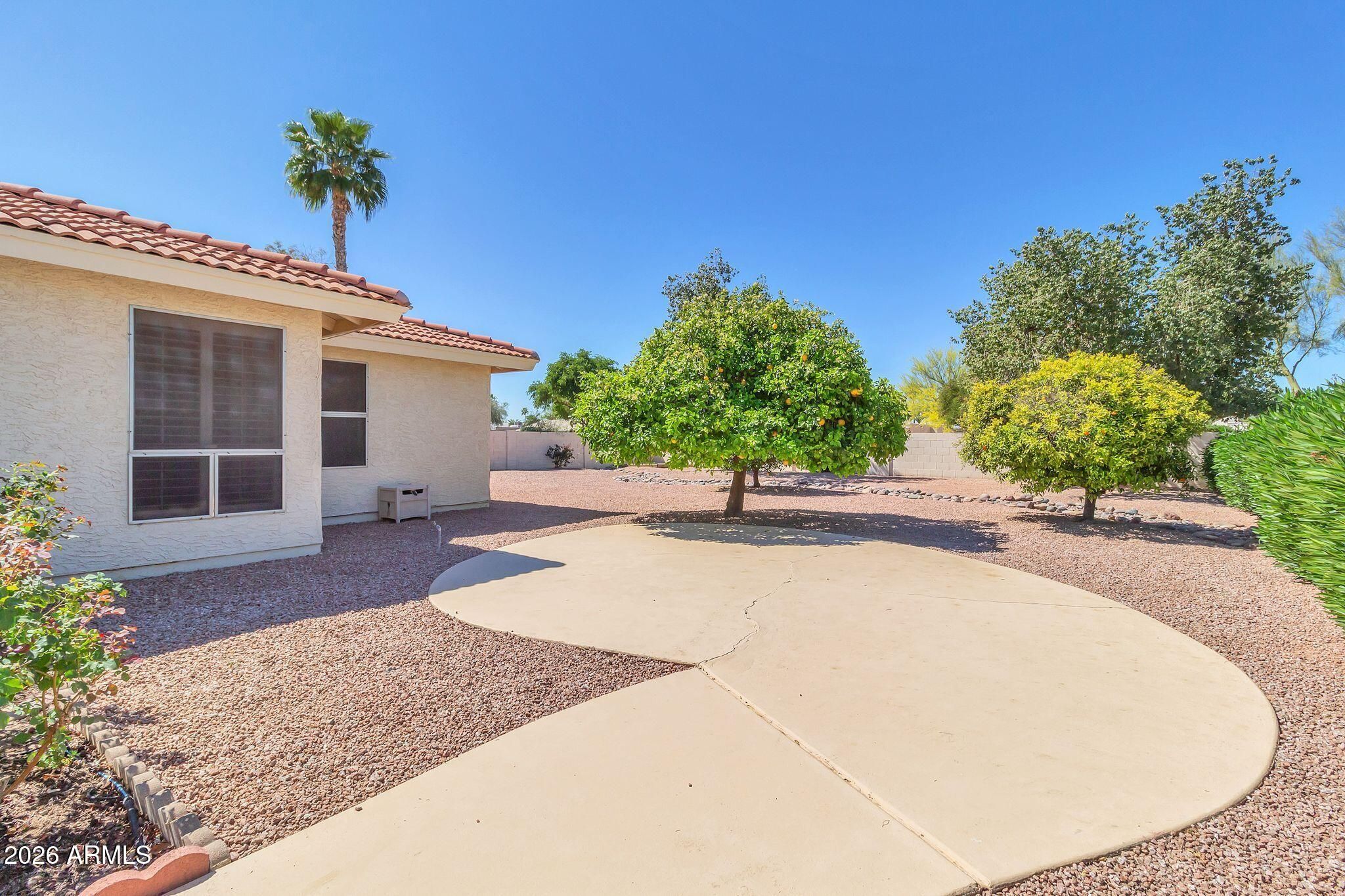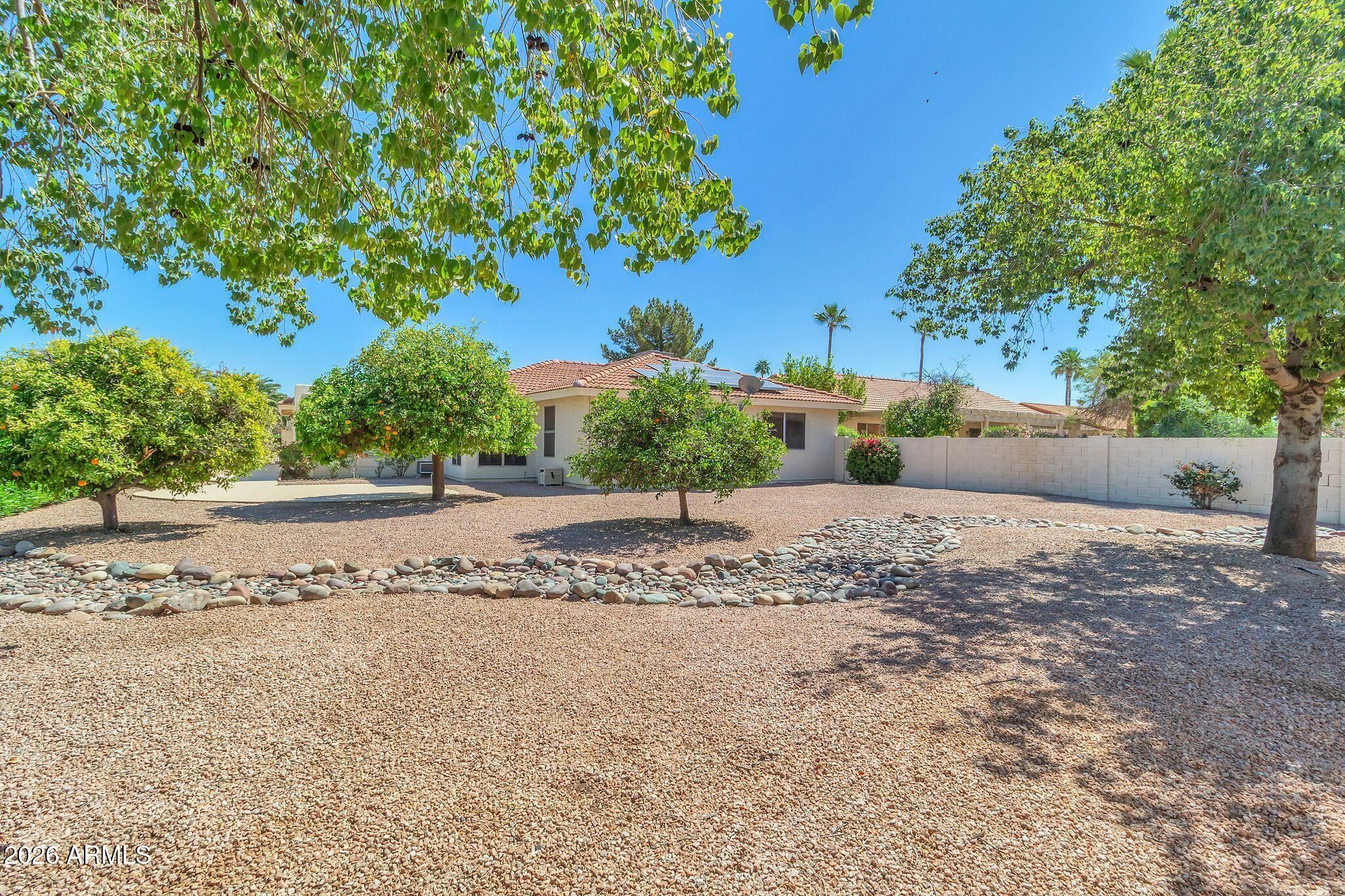 Meticulously cared for in the highly sought-after community of Sun Lakes, this home offers the perfect blend of comfort, value, and resort-style living. Sun Lakes is known for its vacation-inspired lifestyle and country club atmosphere, where residents and their guests enjoy multiple 18-hole and 9-hole golf courses, five clubhouses, restaurants, cafés, heated community pools and spas, driving ranges, tennis courts, fitness centers, arts and crafts studios, billiards, pro shops, stocked fishing lakes, and miles of scenic walking paths. This home has been lovingly maintained, giving the next owner the opportunity to add their own personal touch. Big-ticket improvements have already been addressed, including a roof replacement in 2019, elastomeric roof recoating in 2022, and full exterior repainting in 2022. Inside, you'll find a highly desirable open-concept floor plan and a generously sized kitchen, with natural light that beautifully enhances the home's spacious feel. The layout includes 3 full bedrooms and 2 bathrooms. The primary suite features a large dual-sink vanity, a relaxing soaking tub, and a separate walk-in shower. As you make your way to the peaceful backyard retreat, you'll pass through the enclosed Arizona room, offering additional space to relax and enjoy the surroundings. Outside, the backyard is filled with charming touches including rose bushes, grapefruit trees, and orange trees, creating a lovely setting ready for your personal vision.