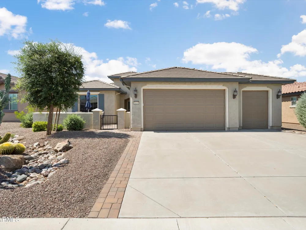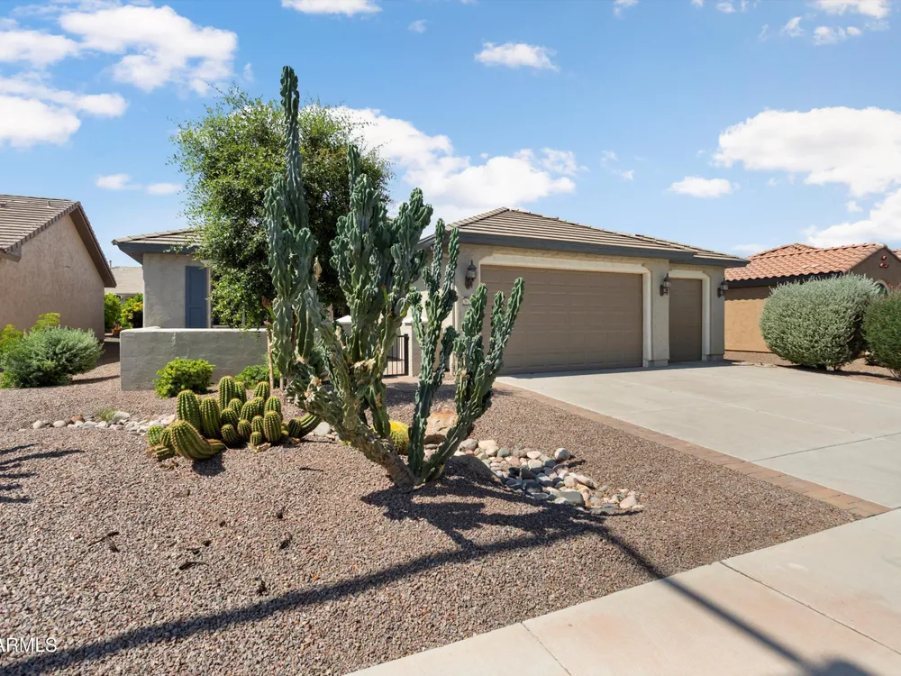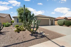 Welcome to Sun City Festival's most sought-after floor plan—the Gala! This 1,612 sq ft gem is nestled in a friendly neighborhood within this 55+ desert oasis, just a scenic drive west of Surprise. Lightly lived in as a snowbird retreat, it's fully furnished and truly turn-key—just bring yourself! The split-bedroom layout offers privacy, while the den provides flexible space for work or guests. Enjoy open-concept living, a golf cart garage, a covered patio with a power awning, and includes a newer refrigerator and dishwasher. Comfort, style, and resort living await!