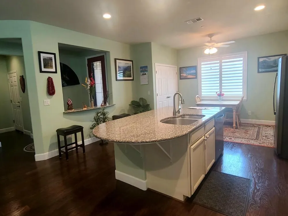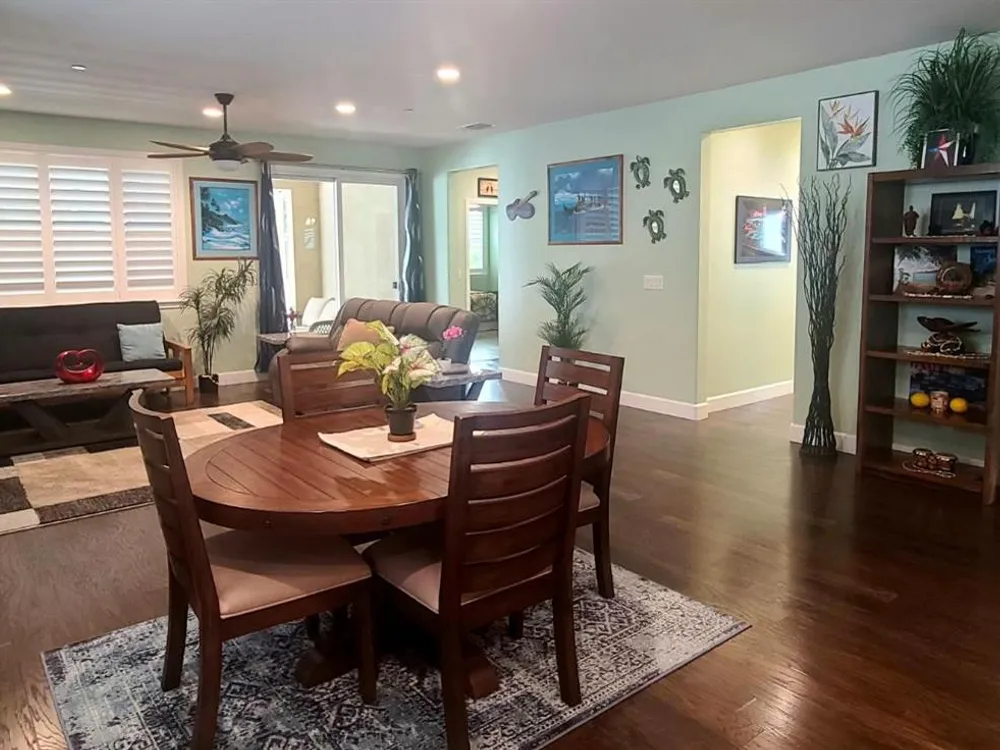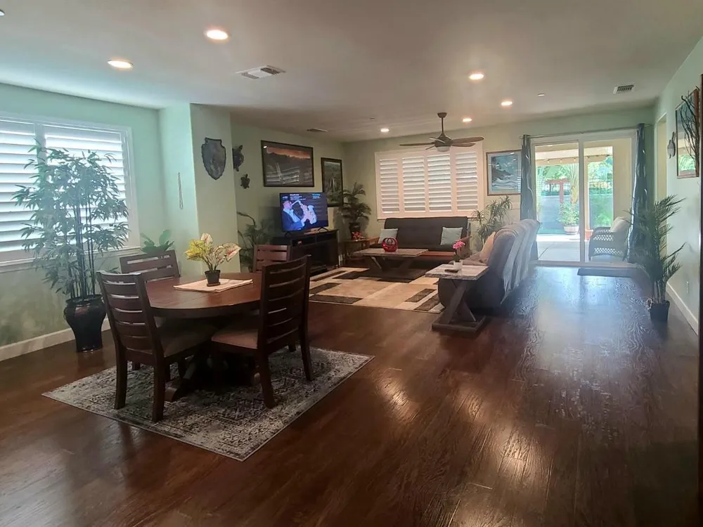 Welcome to Del Webb/Woodbridge, a premier 55+ community offering the best of California living! This beautiful Croquet model is approx. 1,912 sq. ft. with 3 bedrooms and 2 baths. The open floor plan features a gourmet kitchen with granite countertops, large island, upgraded cabinets with roll-out shelves, and pantry. The family room opens to an extended covered patio, perfect for entertaining. Fresh interior paint and new laminate flooring throughout. Energy-efficient features include a tankless water heater, Energy Star appliances, attic insulation, drip irrigation, water filtration system, and fully owned solar. The extended garage is pre-wired for EV charging with 40-amp service and built-in shelving. Enjoy a lush, low-maintenance backyard with artificial turf, drip system, stone retaining wall, extended stamped concrete patio, and awning plus a wood-burning stove and mounted TV. Home includes plantation blinds, tiled baths, ceiling fans, and an insulated garage door. Premium lot near walking paths leading to the clubhouse with gym, pools, tennis, and more!